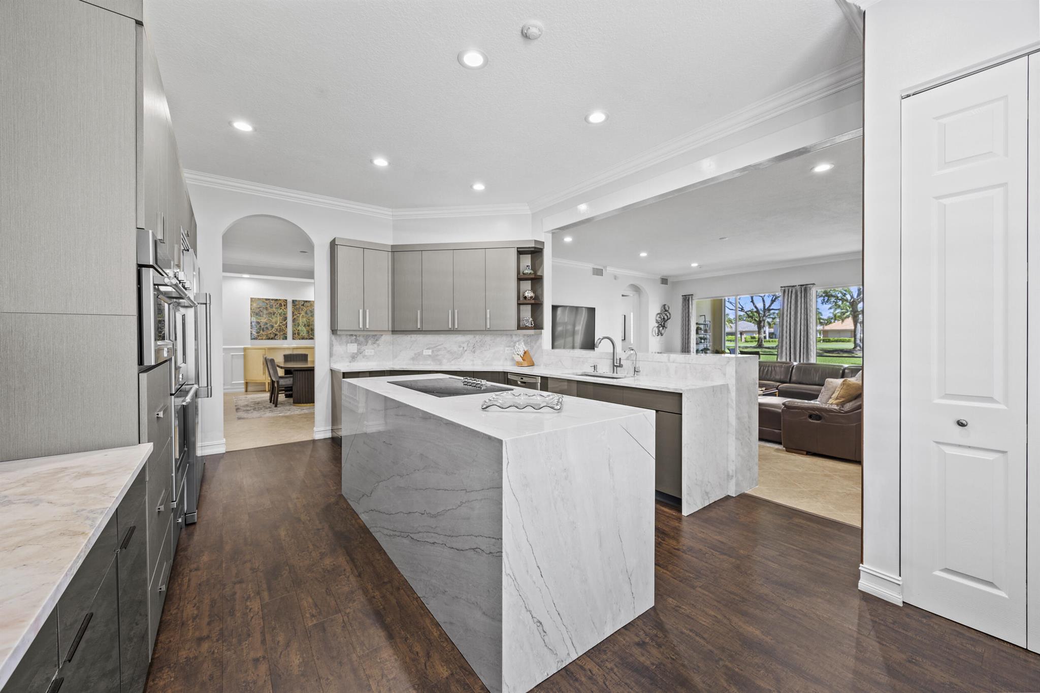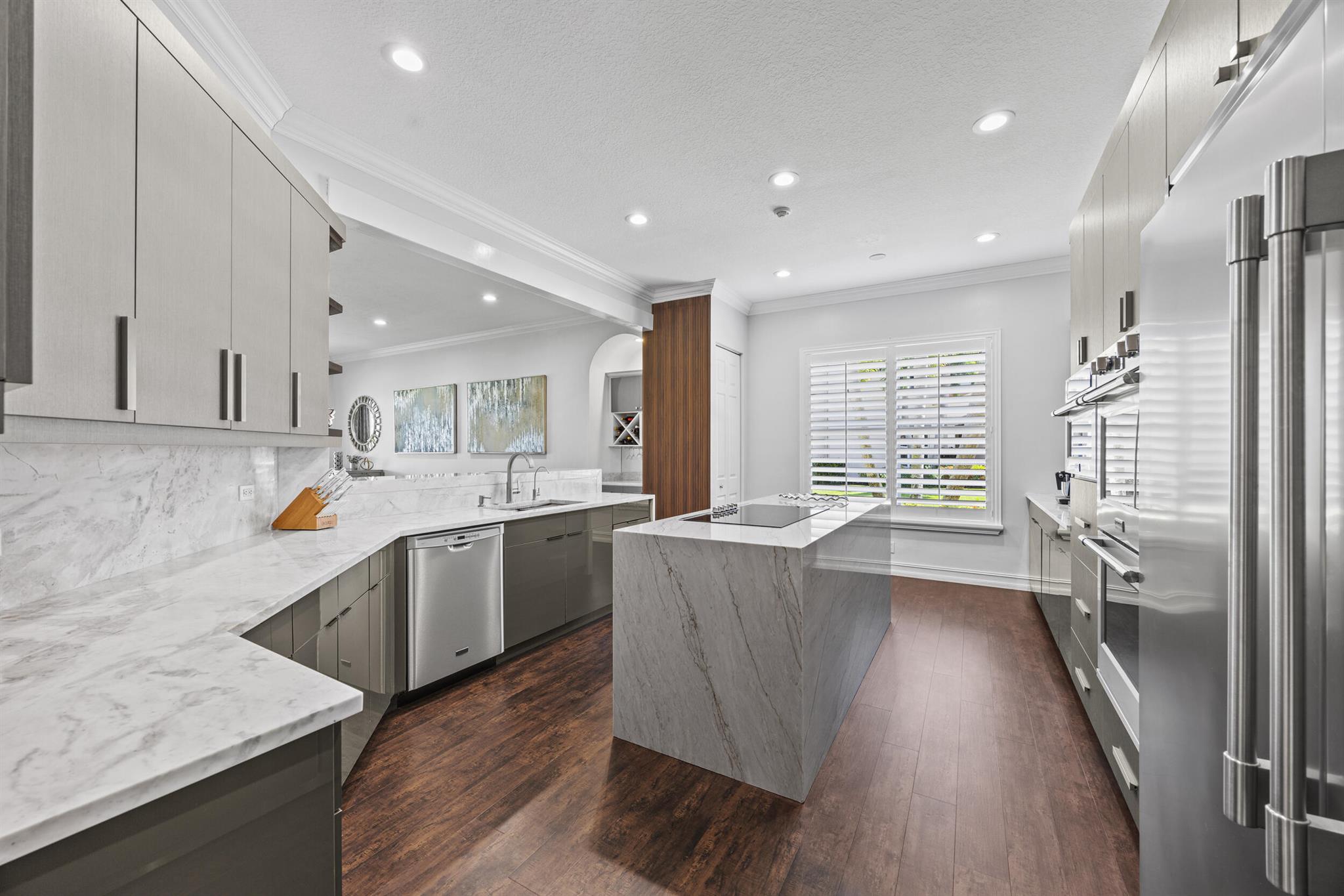 Spectacular golf course view and a fully renovated custom kitchen make this first-floor luxury condo with impact windows a special find. With nearly 2,400 square feet of living space, this 2BR/2BA + DEN home is a must see. Recent renovations include a redesigned kitchen which enhances the great room concept, flow and functionality of the entire space. Luxurious quartzite countertops, Frigidaire Professional appliances, undercabinet lighting, coffee bar and reverse osmosis system are just a few of the things that make this contemporary kitchen a chef's dream. The beautiful and functional dry bar compliments the large open living space, as does the well-appointed dining room. Gorgeous wainscoting, crown molding, millwork, and bright white plantation shutters throughout. Much desired wood