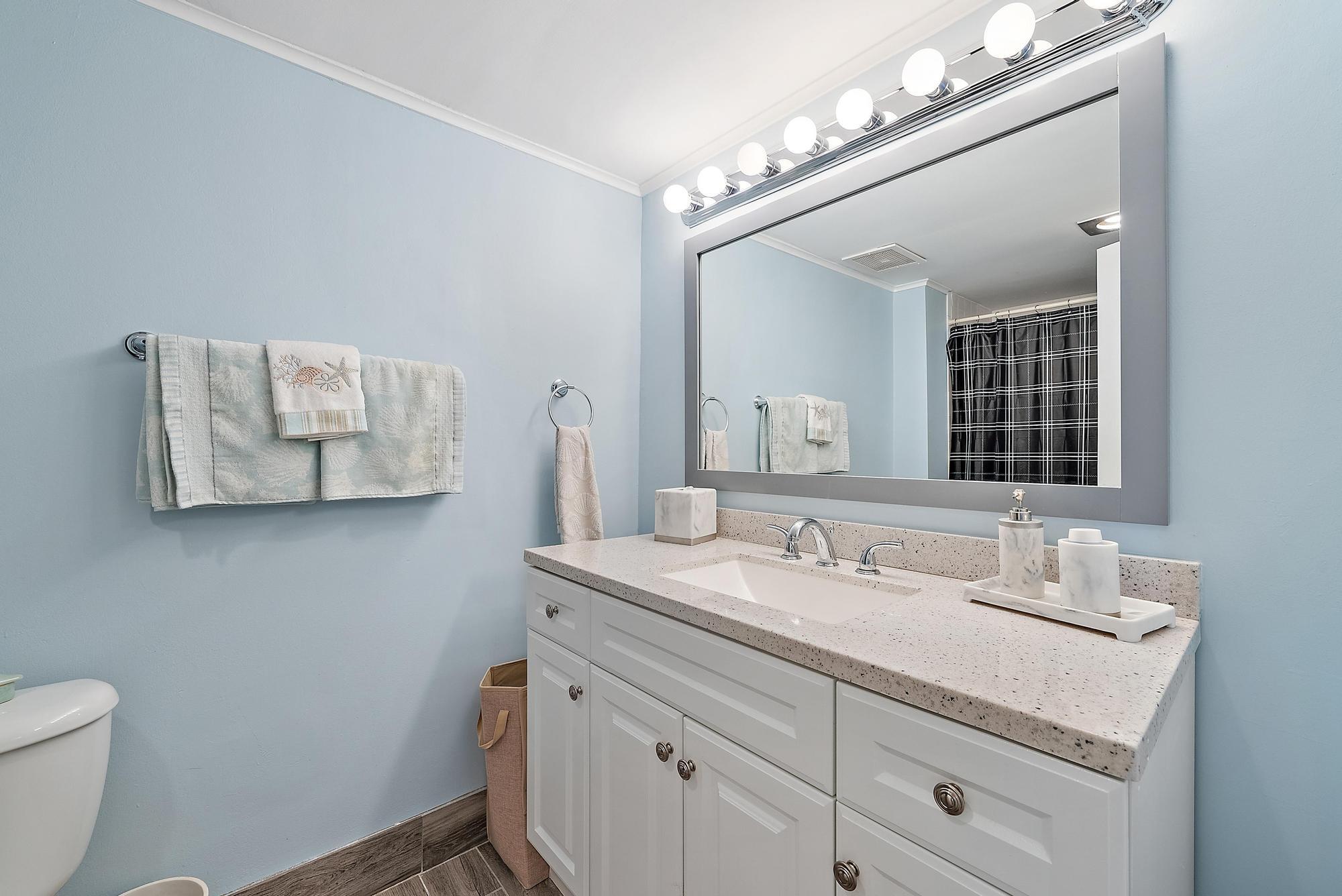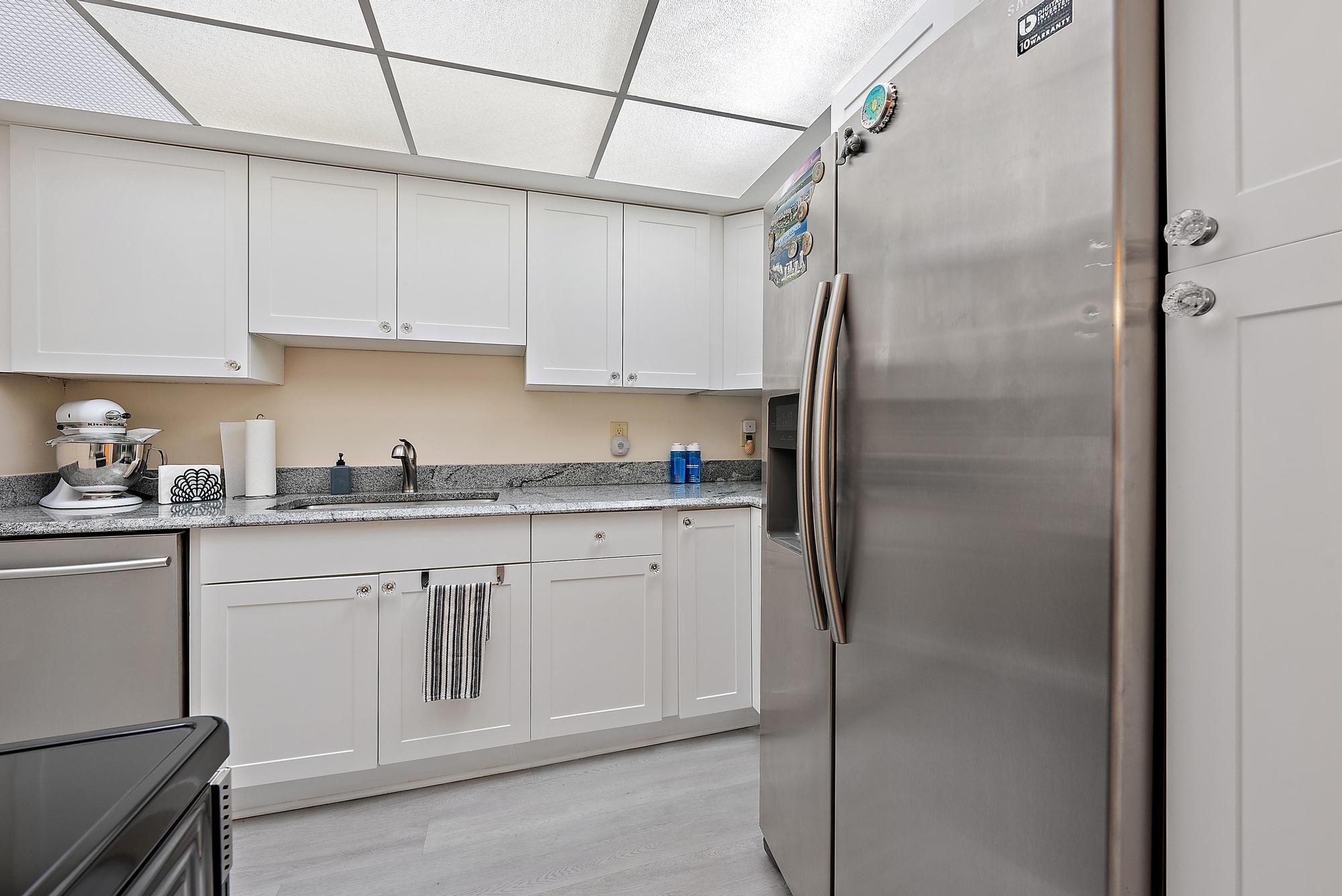 Located in the desirable, gated waterfront community of Old Port Cove in North Palm Beach, this deck-level condo offers a true marina lifestyle just steps from shops, dining, and the Intracoastal. Ideally situated on the deck-level, this residence offers rare walk-out access to the shuffleboard and pool deck, giving it the ambiance of a private villa rather than a typical condo. Originally designed as a studio, the home has been converted into a one-bedroom, 1 bathroom, den or office and walk-in closet with updated vinyl wood flooring throughout. The kitchen has been beautifully renovated with stainless steel Samsung appliances and modern finishes, while the dining area flows seamlessly into the living room.