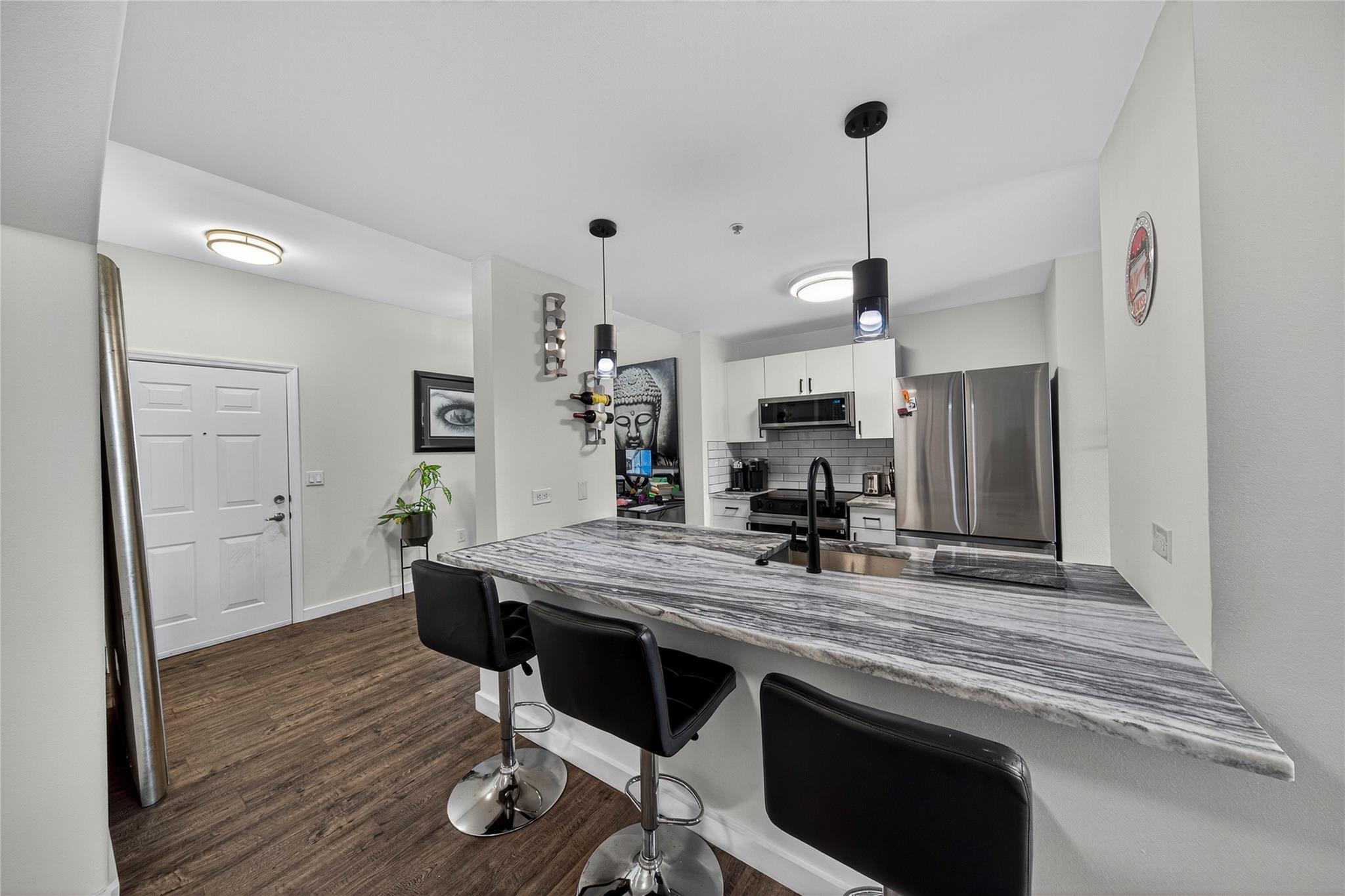 Nicely updated TOP floor condo facing East towards a park. BRAND new granite counters with snack bar, new upgraded stainless steel appliances, BRAND new large capacity washer and dryer, COMPLETELY renovated bathroom with high end finishes, newer laminate flooring throughout, freshly painted throughout, popcorn ceiling removed to a SMOOTH finish, all new lighting throughout, newer a/c system, hurricane impact windows, volume ceilings with nobody above you, TONS of natural light, HUGE walk-in closet, this is one of the larger one bedroom floor plans with 780 sq feet, WiFi and cable included in the monthly condo fees, building has a nice gym, clubroom, heated pool, hot tub, BBQ grill, garage parking and secured building. AWESOME location with downtown living right outside of the building!
