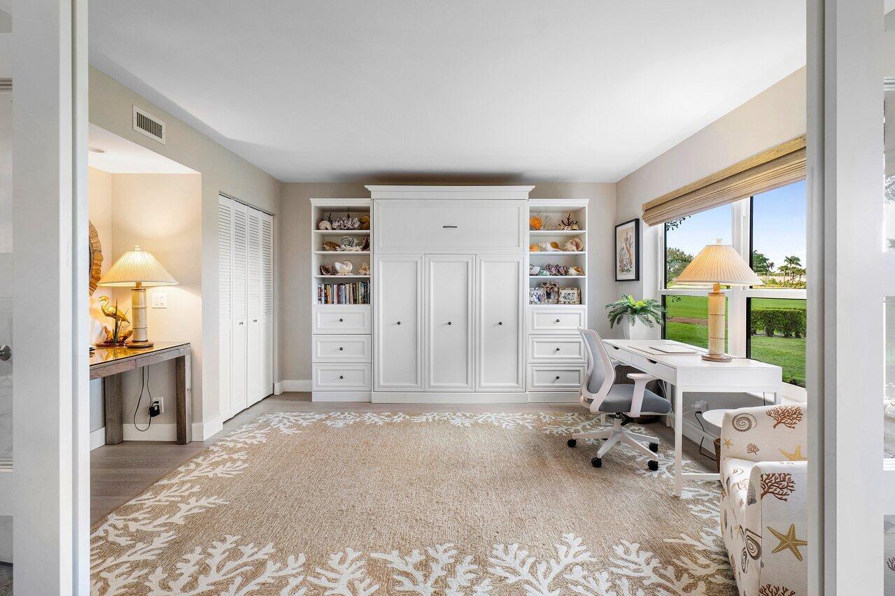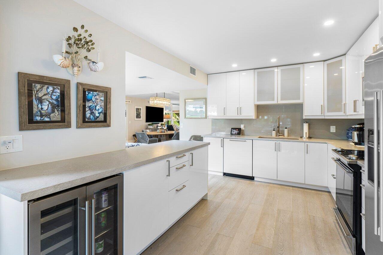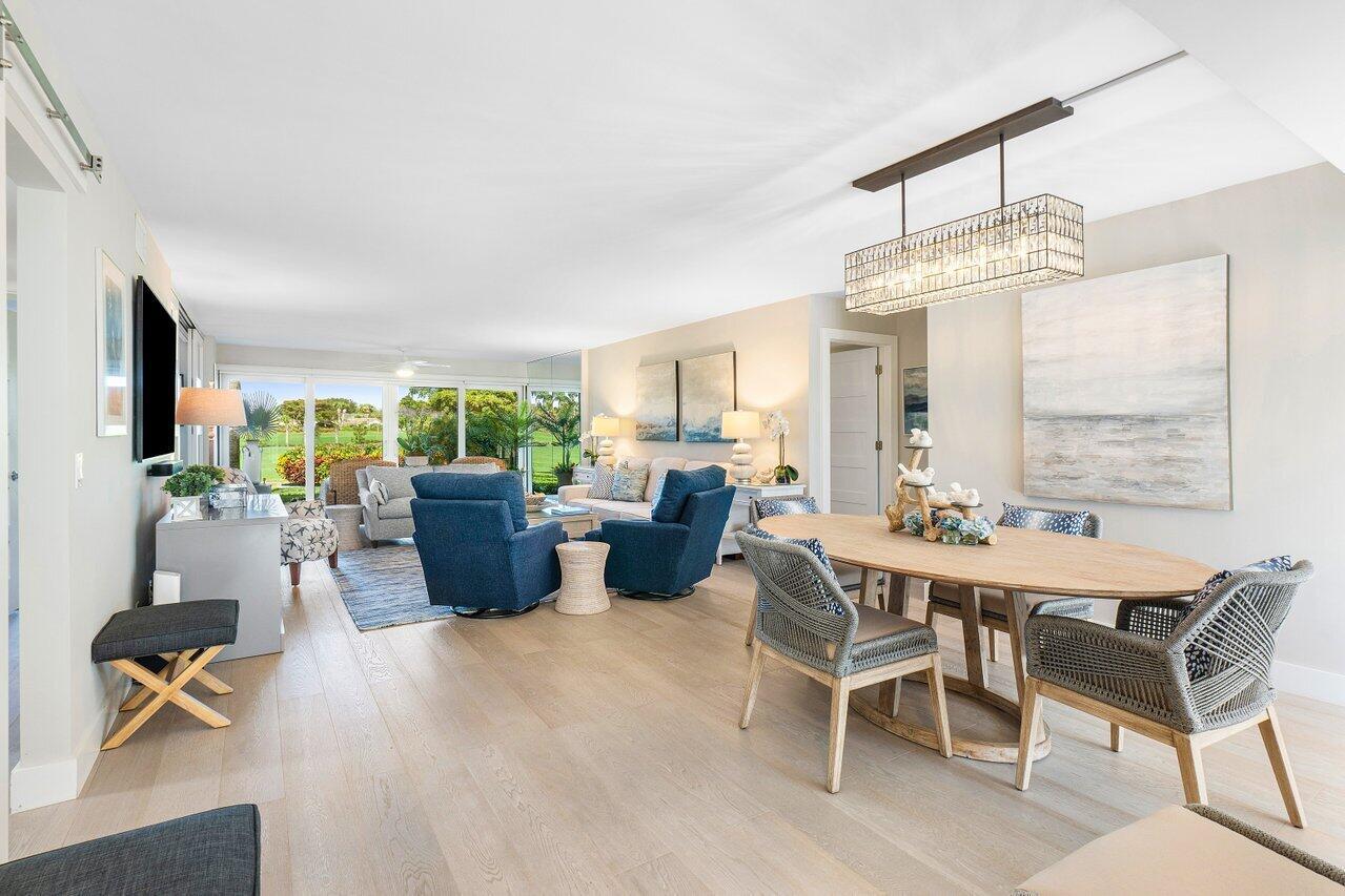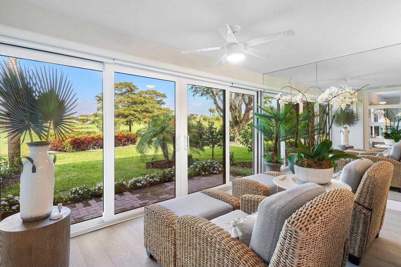 Beautifully renovated 3-bedroom, 2-bath first-floor residence, offering double fairway views of the newly renovated North course. With all impact glass windows, you'll enjoy peace of mind and energy efficiency. The open floor plan features a spacious living area that seamlessly flows into the updated kitchen, complete with sleek white cabinetry and elegant countertops. The kitchen also boasts a built-in banquette in the breakfast area. The den offers a convenient Murphy bed for added flexibility, whether used as a guest room or home office. Step outside onto your private open patio, perfect for relaxing and entertaining. Quail Ridge offers many upscale amenities - golf, tennis, pickle ball, clubhouse with dining and social events all in a vibrant community atmosphere.