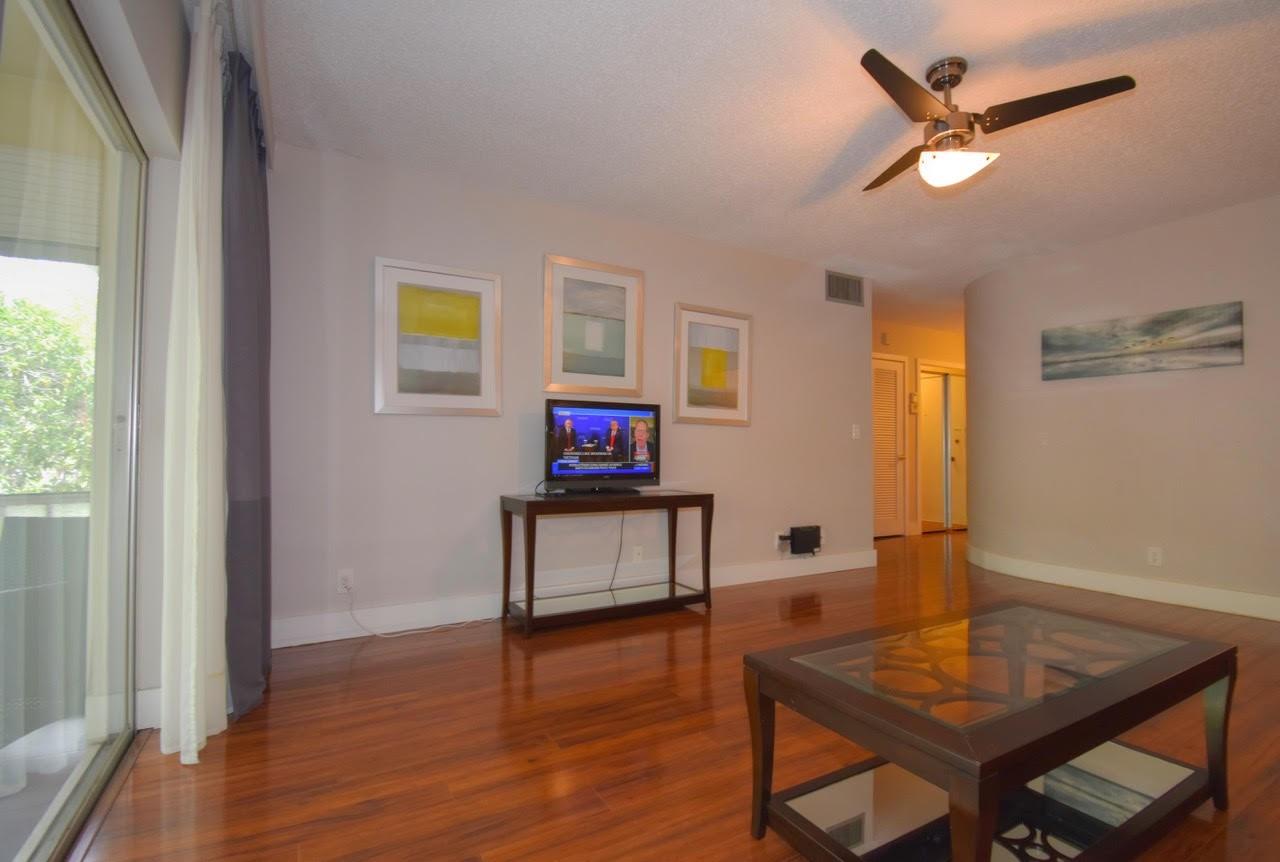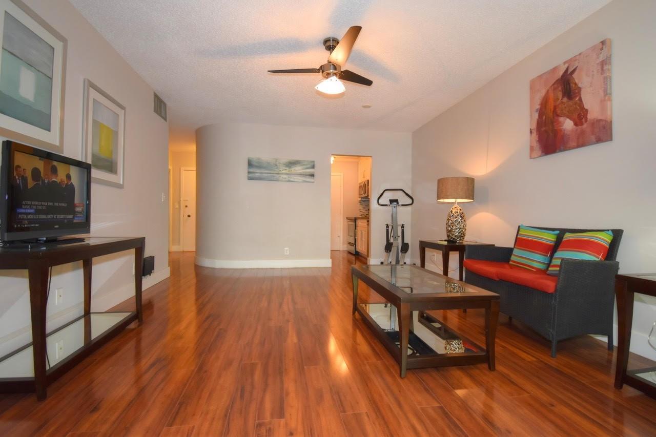 Stunning spacious one bed condo on 2nd floor with lovely private patio. Wood tone laminate flooring throughout gives the home elegance. Kitchen has beautiful wood cabinets, lovely counter, tile backsplash, breakfast bar with stools and stainless appliances. Bath and powder room have newer vanities. AC less than 10 years, Tankless Hot water. Furniture shown can remain for the buyer, including patio set, bedroom set and living room tables and television. Colonnades features oversized sparkling heated swimming pool, exercise room, fountain area with umbrellas and tables/chairs, game room, grills, and lots of bench seating throughout the community. 10 minutes to all! One parking, no renting for 2 years, no pets, ALL ADULTS RESIDING IN UNIT MUST HAVE MINIMUM 700 CREDIT SCORE.