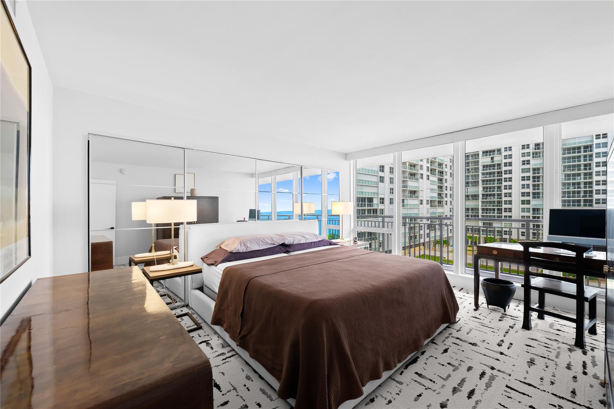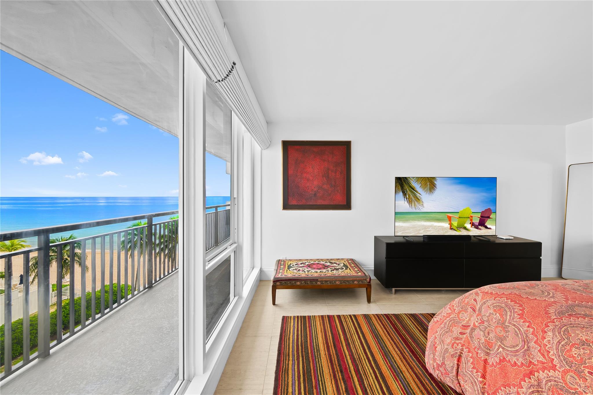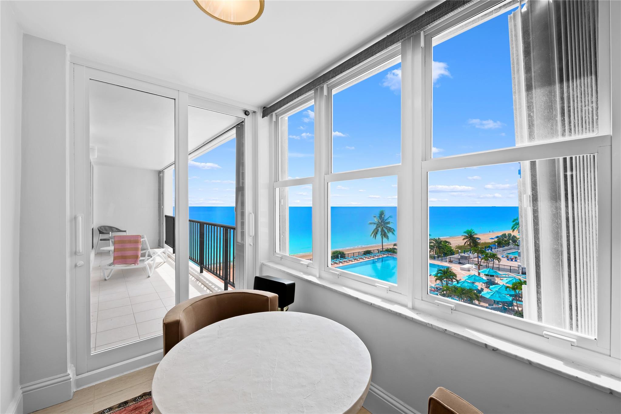 Arrive at your stunning, fully renovated beachfront condominium via semi-private elevator & foyer. Enjoy breathtaking direct ocean views as soon as you enter. Brand new floor to ceiling impact windows and doors with custom electric shades throughout. Open concept with bright white kitchen , stainless steel appliances, butcher block–style countertops, breakfast area, plus a laundry room. Both bathrooms are fully remodeled—the primary with floating vanity, double sinks, oversized shower w/ multiple attachments, and a custom walk-in closet. Imported 24 inch porcelain tiles throughout. Large balcony overlooks the pool and ocean. This flow-through unit feels like a home, with resort-style amenities: Saltwater infinity pool, private beach access, grilling deck, sauna, gym, 24hr security & more.
