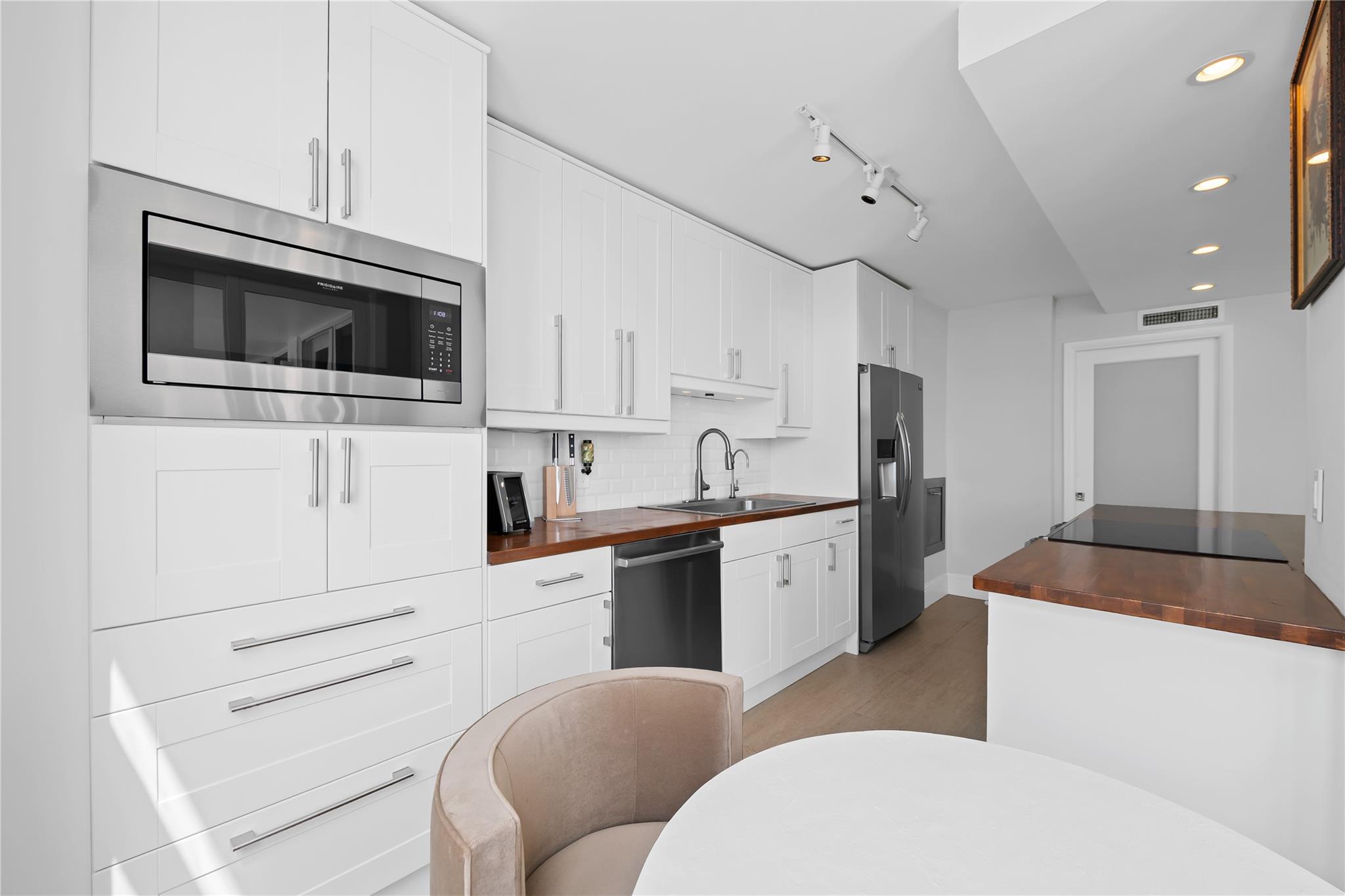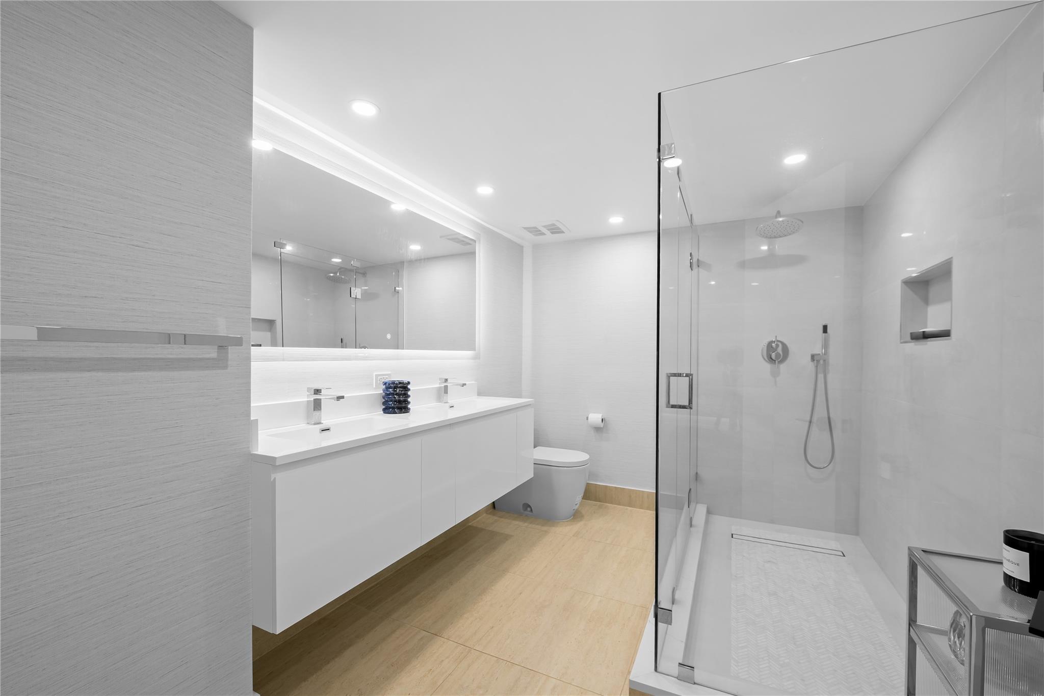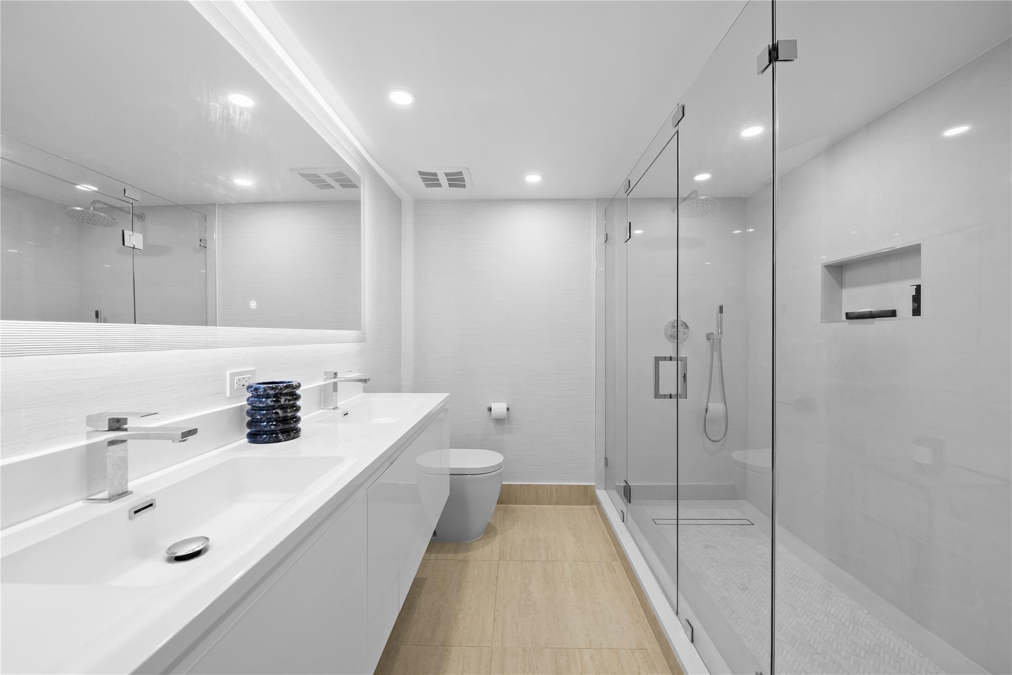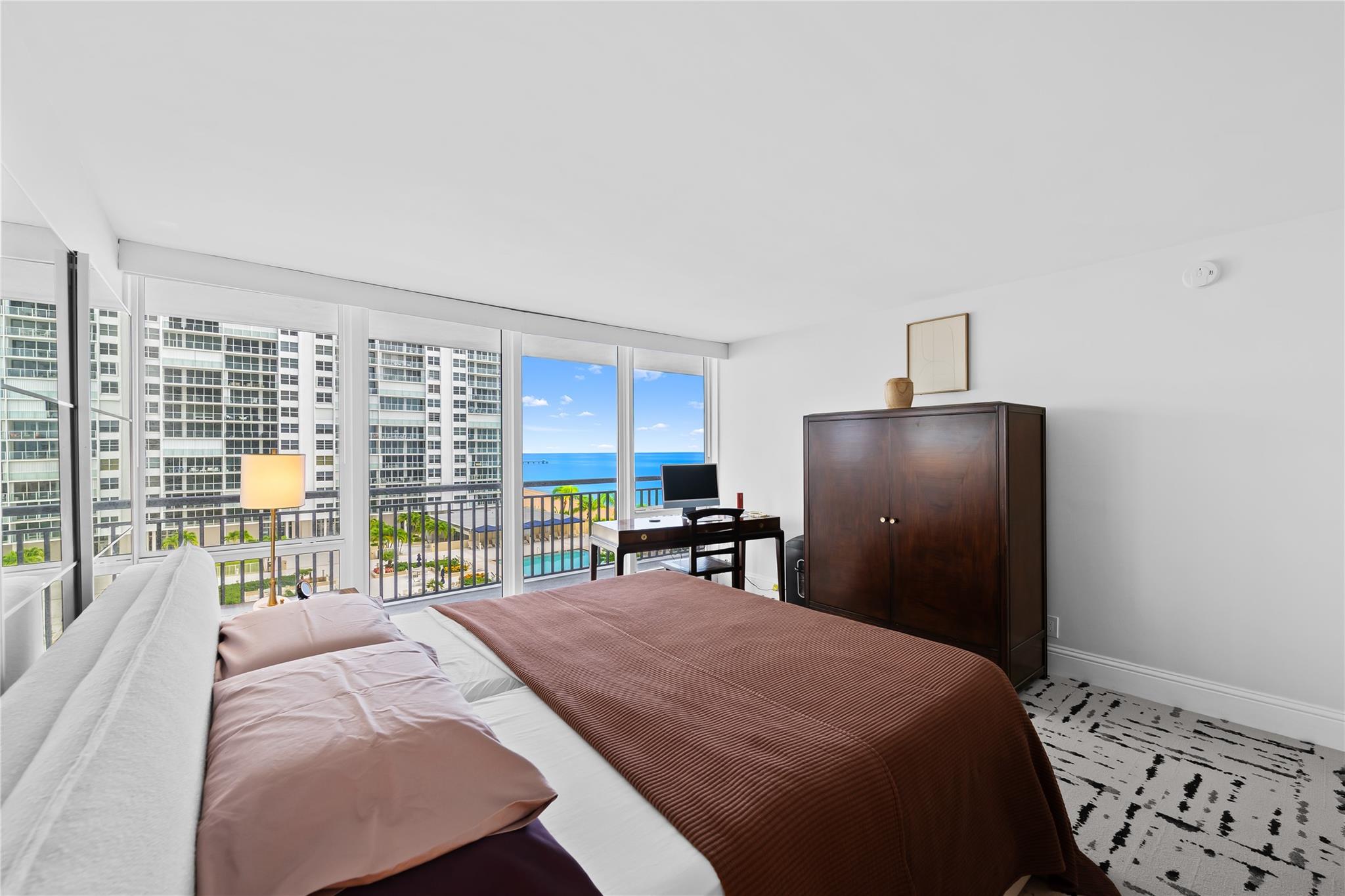 Arrive at your stunning, fully renovated beachfront condominium via semi-private elevator & foyer. Enjoy breathtaking direct ocean views as soon as you enter. Brand new floor to ceiling impact windows and doors with custom electric shades throughout. Open concept with bright white kitchen , stainless steel appliances, butcher block–style countertops, breakfast area, plus a laundry room. Both bathrooms are fully remodeled—the primary with floating vanity, double sinks, oversized shower w/ multiple attachments, and a custom walk-in closet. Imported 24 inch porcelain tiles throughout. Large balcony overlooks the pool and ocean. This flow-through unit feels like a home, with resort-style amenities: Saltwater infinity pool, private beach access, grilling deck, sauna, gym, 24hr security & more.