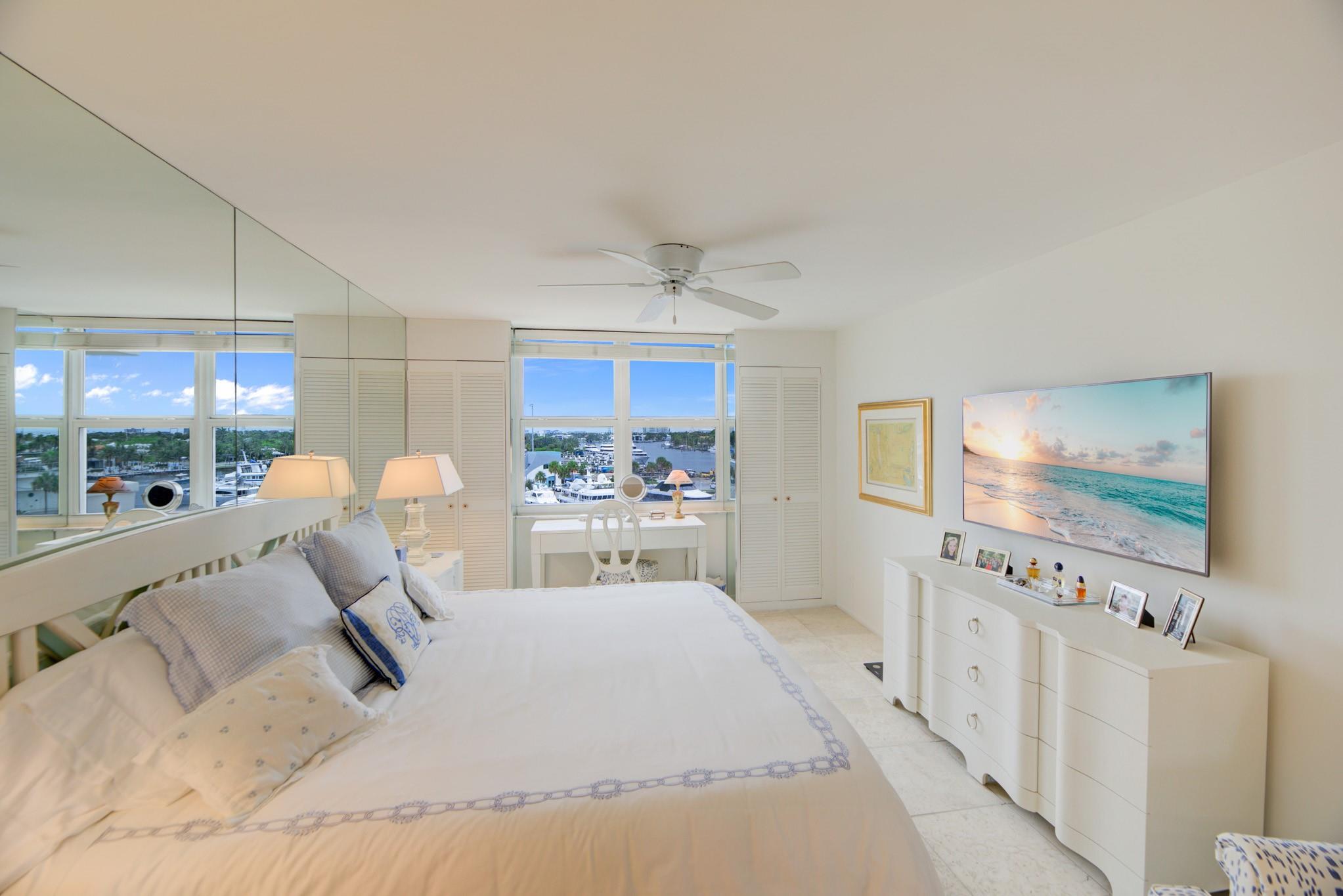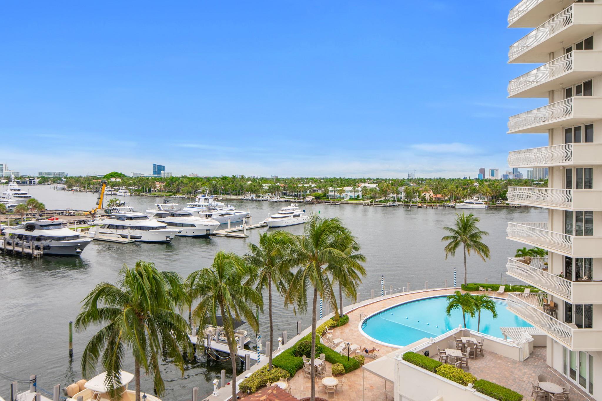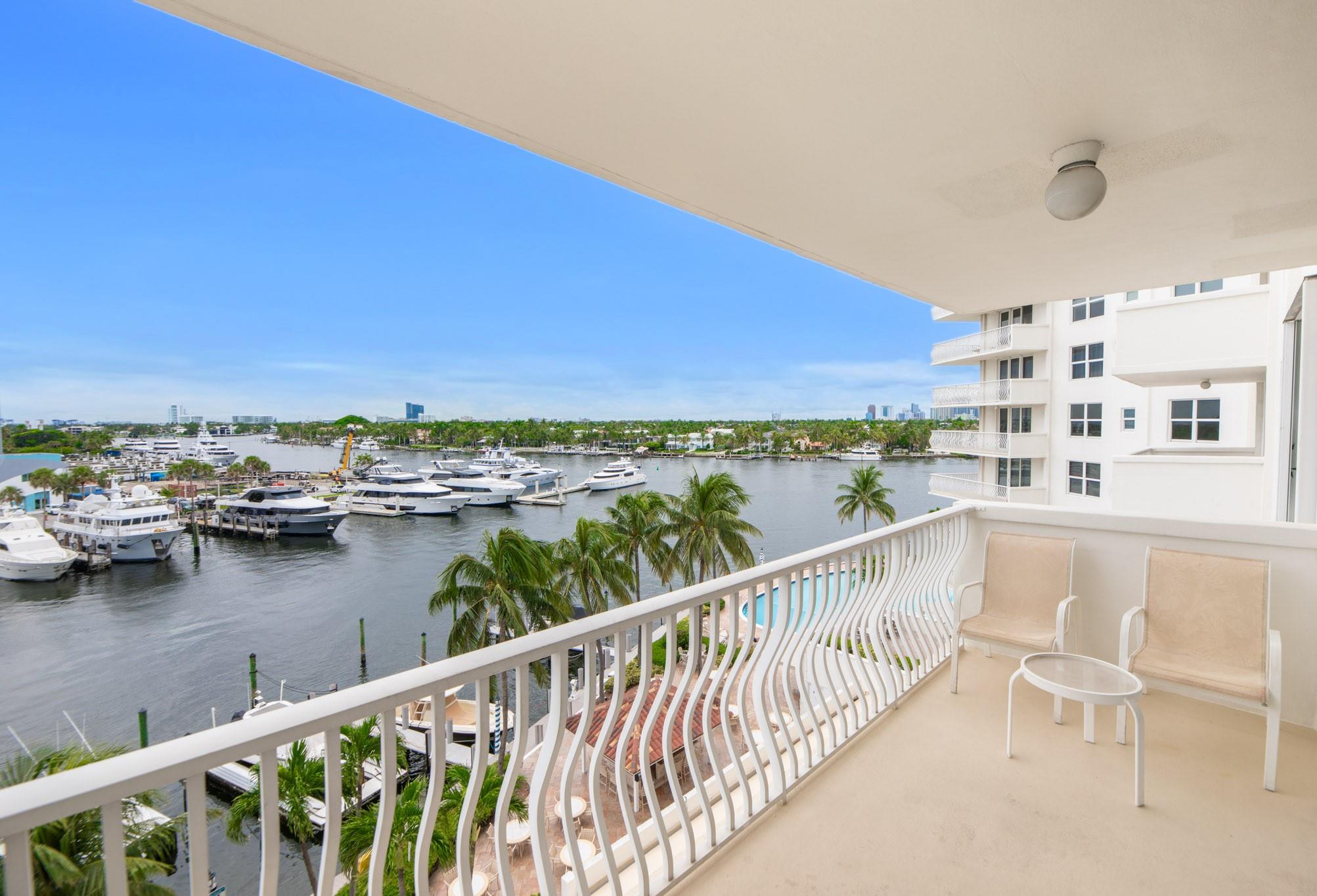Stunning views of the Intracoastal Waterways, Atlantic Ocean and the beautiful City of Fort Lauderdale skyline. This 5th floor condo has a large balcony facing directly to the Swimming Hall of Fame (The Fort Lauderdale Aquatic Center) with the highest dive platform in the Western hemisphere at 27 meters. It has been substantially updated and in mint condition with 1500 sf, 2 bedrooms/2 baths split floor plan. The Venetian is located just across from the beach in a very desirable "Resort style" building with Tiki Bar, Spa, Pool, Gardens, Library w/ free WiFi, 24hr Security, ping-pong, billiard and a large fully equipped 24 hrs fitness center. Internet and basic cable are included in the low monthly maintenance fee. Dockage as available! A must see!