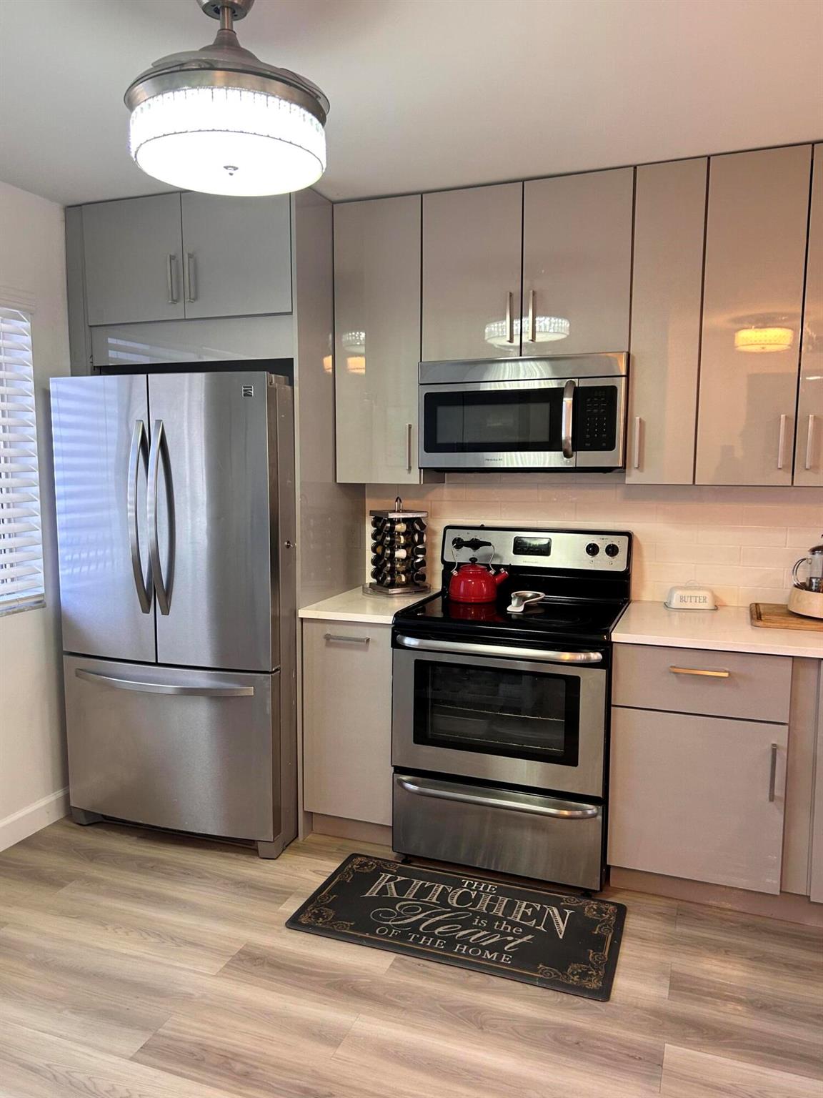 Beautiful spacious 1564sf, 3/2 condo located near turnpike and easy access to 195. Many stores located <1 mile away. This beautiful Hamlet condo on the 4th floor has been recently renovated to an open concept kitchen with great lighting and modern Luxury Luxe cabinets. New roof, new HVAC, new lvt flooring in kitchen, living room and dining room, water heater installed in 2019. Hurricane shutters on back windows. HOA amenities include water, cable, WiFi, landscaping, 1 beautiful heated pool located at the Hamlet, Clubhouse that offers weekly activities for residents, 2nd heated pool with accessible restaurant that also offers nightly entertainment, gym, maintenance, pest control, etc. Seller motivated to sell, needs to go babysit new granddaughter in GA. Seller has put a lot of love in