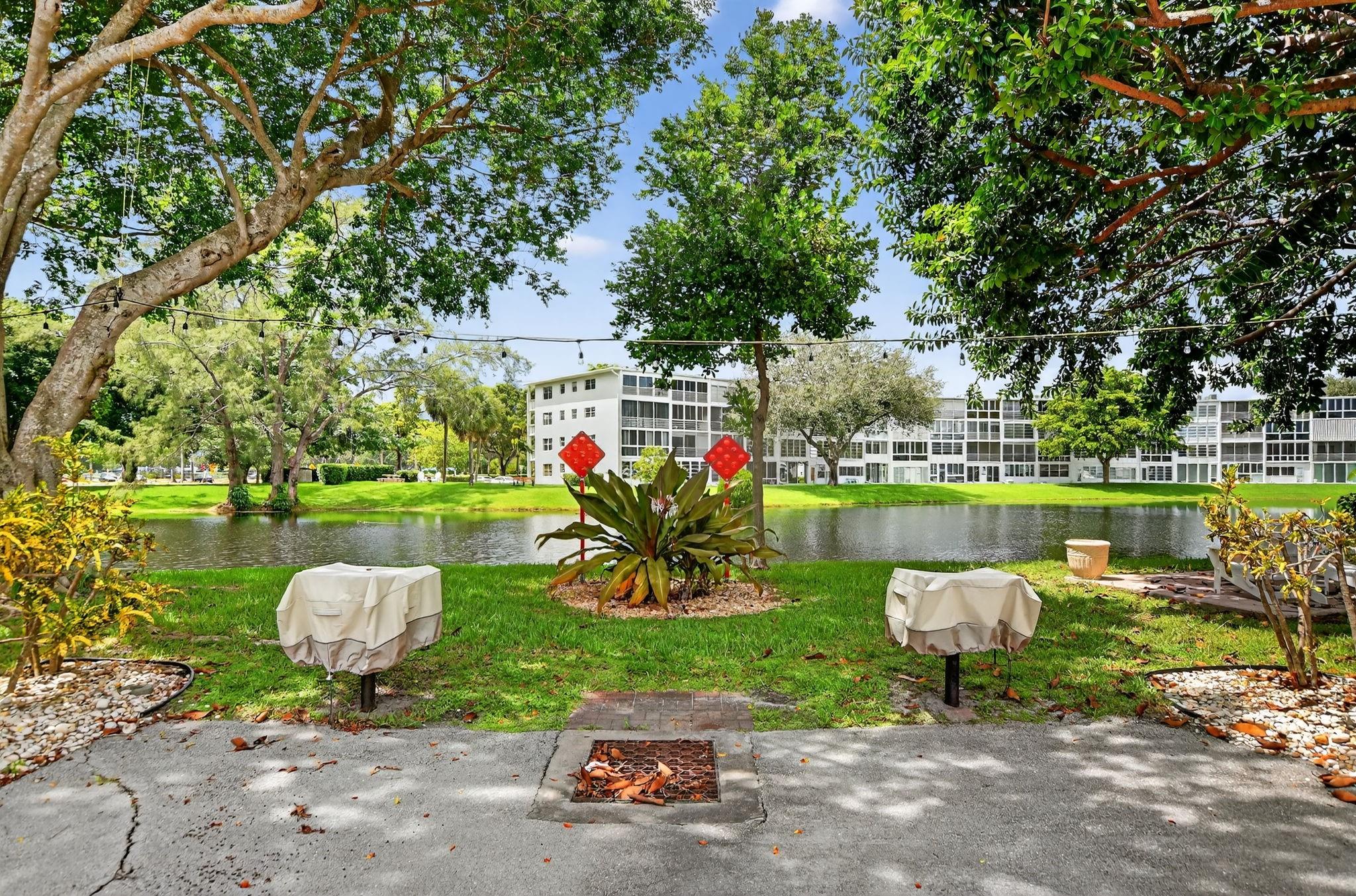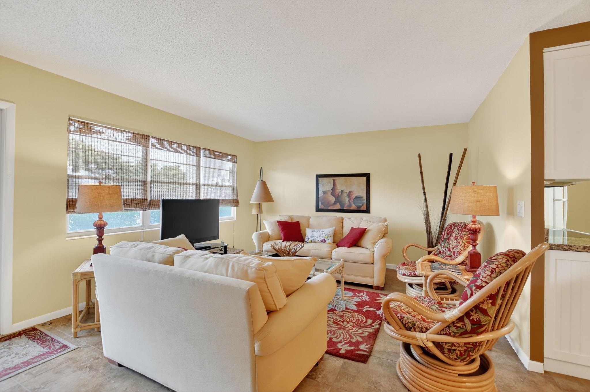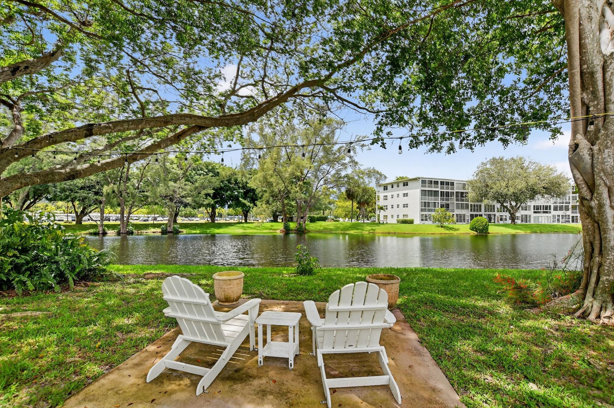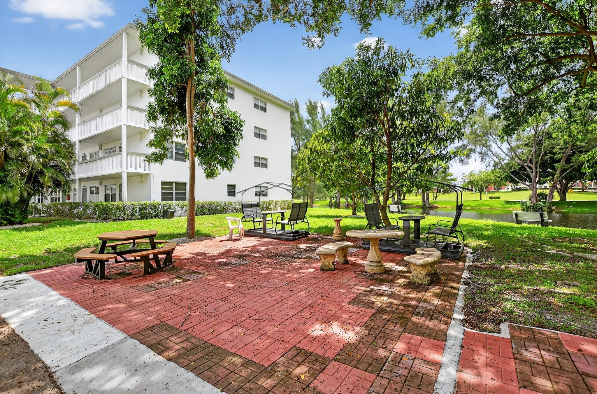Paradise awaits in this UPDATED 1ST FLR, 1 bdrm, 1.5 bath condo located just steps to the magnificent CLUBHOUSE! Enjoy gorgeous sunsets from your back patio w/a beautiful view of the LAKE. Convenient pkg. rt outside your front door. Many wonderful features incl tile flrs thru-out, lovely galley kit w/granite cntrs, NEW A/C, remodeled bathrms w/tub/shower in primary & roll up shutters in patio. Unit comes nicely furnished incl 2 sleeper sofas in liv rm! Fully equipped & ready to move right in! YOU WILL LOVE TO CALL THIS HOME! Gated comm w/24 hr sec, free busses, pools, tennis, pickleball, cafe, putting green, shuffleboard, STATE OF THE ART CLUBHOUSE w/fitness cntr, indr & outdr pools, classes & clubs of every type, free movies, theater. Close to shopping, beach & dining! Assoc. Claims 55+