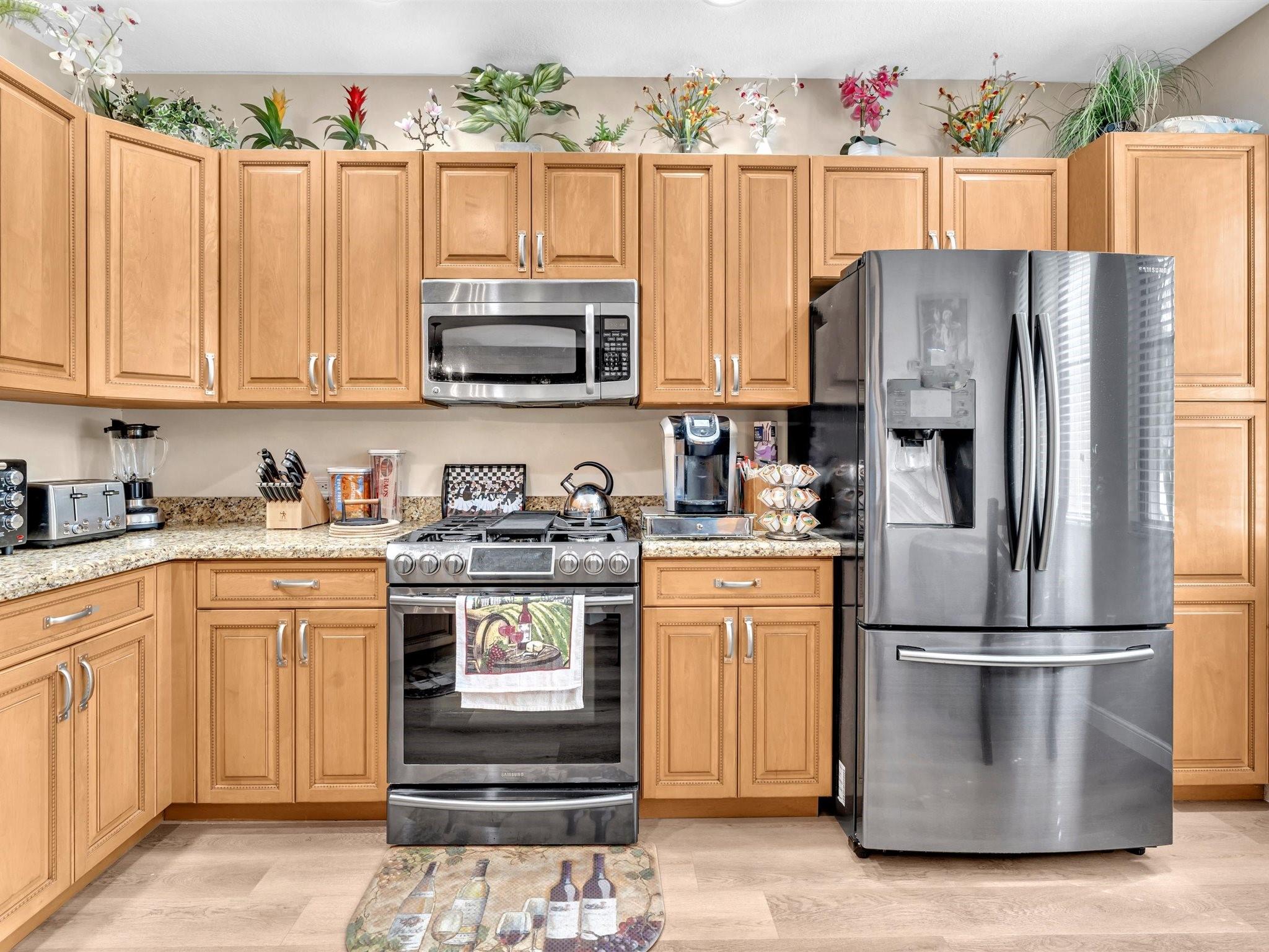 This stunning Artesia Botanica model offers the ultimate in luxury and convenience. Experience townhouse-style living within a secure building - no elevators needed with direct ground-level access! This highly desirable and rarely available floor plan features 2 bedrooms, 2.5 baths, plus versatile den converted to 3rd bedroom. Gourmet kitchen showcases rich wood cabinetry, granite countertops, and stainless steel appliances. Elegant wood-like flooring throughout. Cedar wood accent wall. Custom shelving in all closets. 5 ton a/c unit (2023). New light fixtures & fans. Impact doors & windows. Expansive master suite boasts dual vanities in the spa-like master bath. Exceptional convenience with 2 assigned covered parking spaces directly next to your private back entrance. Don't miss this one!