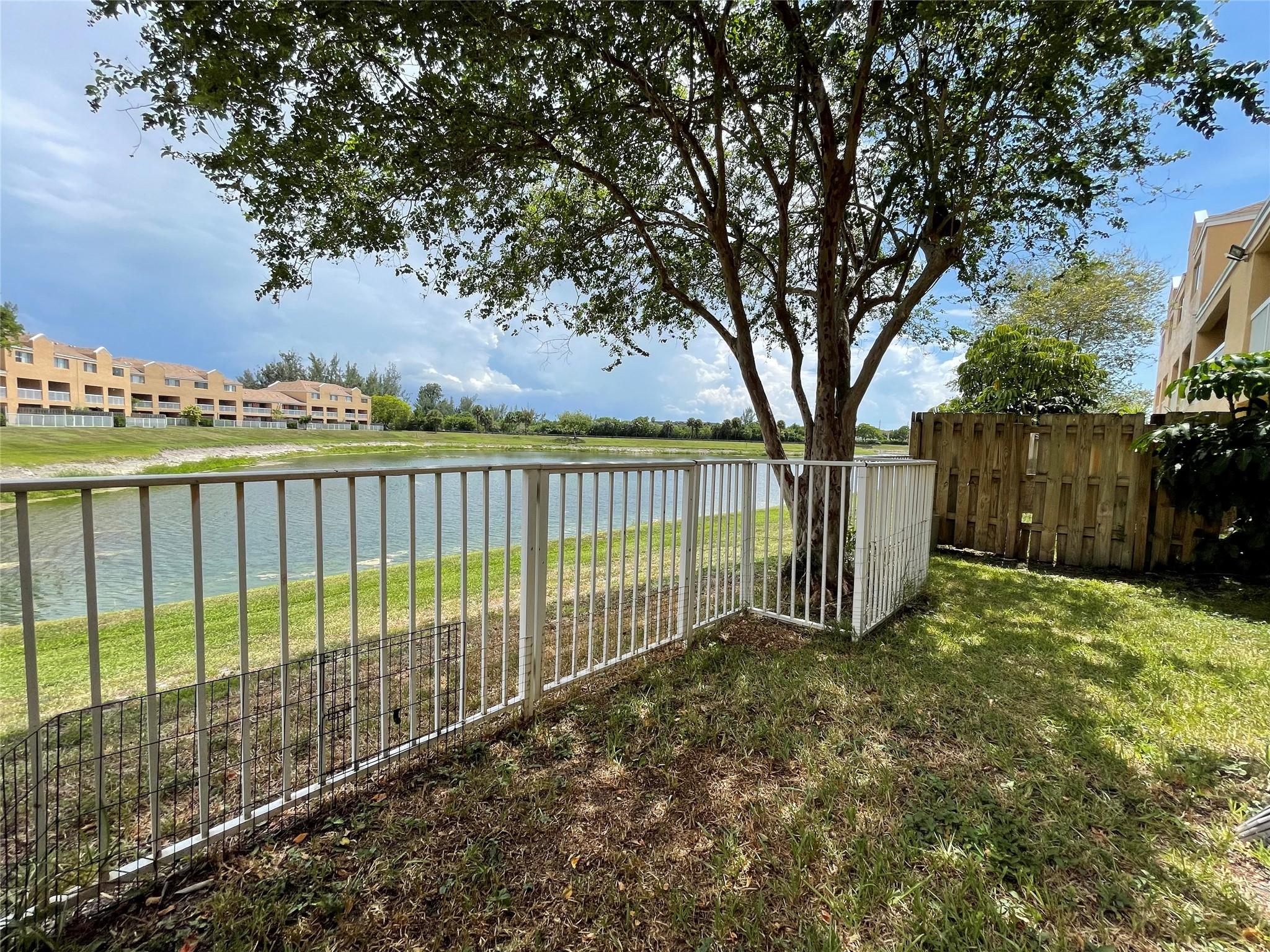 Welcome to this stunning 2-bedroom, 2-bathroom first-floor condo offering serene lake views and the perfect blend of comfort and convenience. Featuring a desirable split floor plan, this home provides privacy for both bedrooms. Step into the spacious living area filled with natural light and enjoy direct access to your covered patio overlooking the tranquil lake. The large, fully fenced backyard is a rare find for a condo and is perfect for pets, entertaining, or gardening. The primary suite includes a walk-in closet and en-suite bath, while the second bedroom and full guest bath are located on the opposite side of the unit for added privacy.