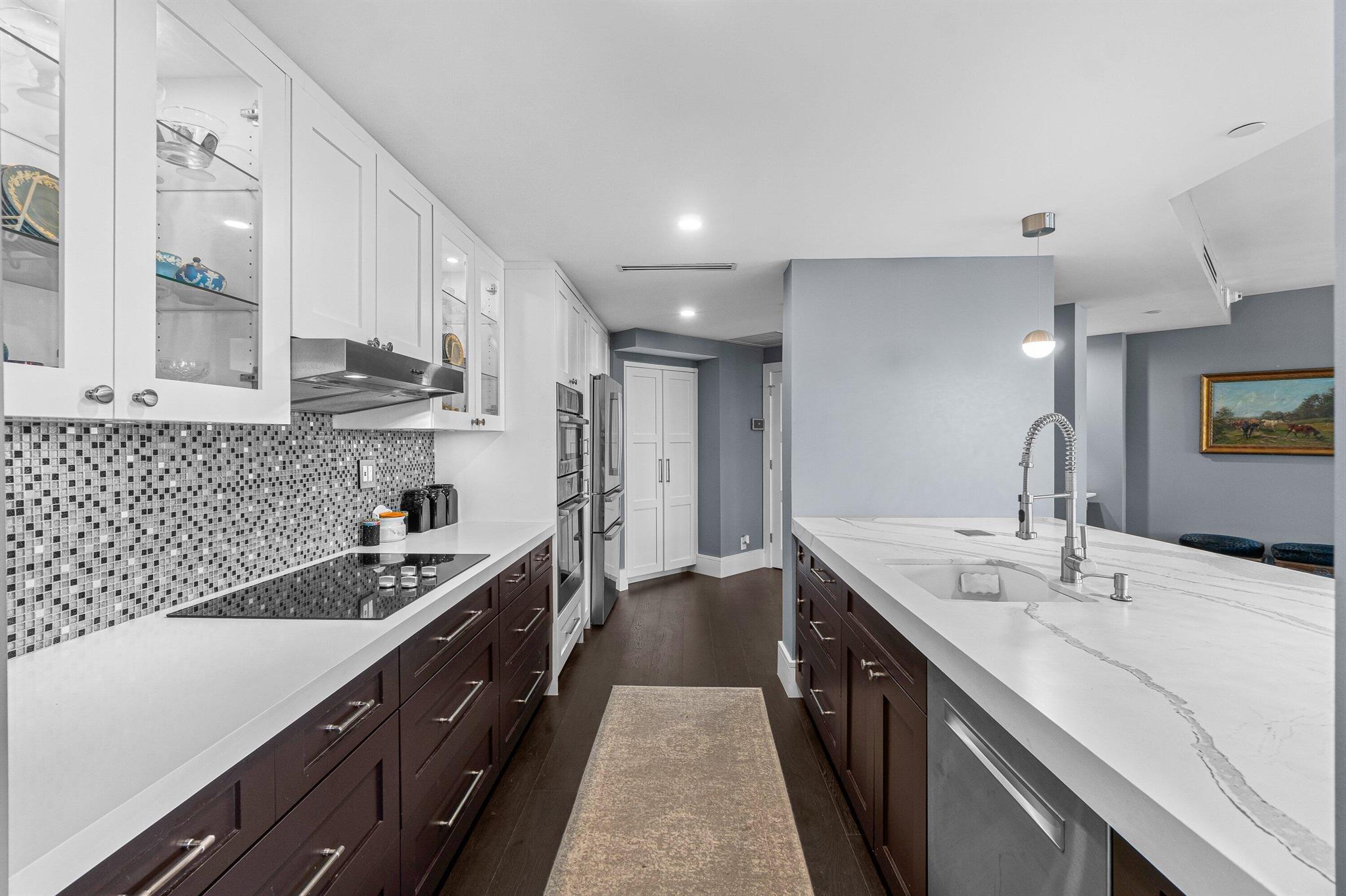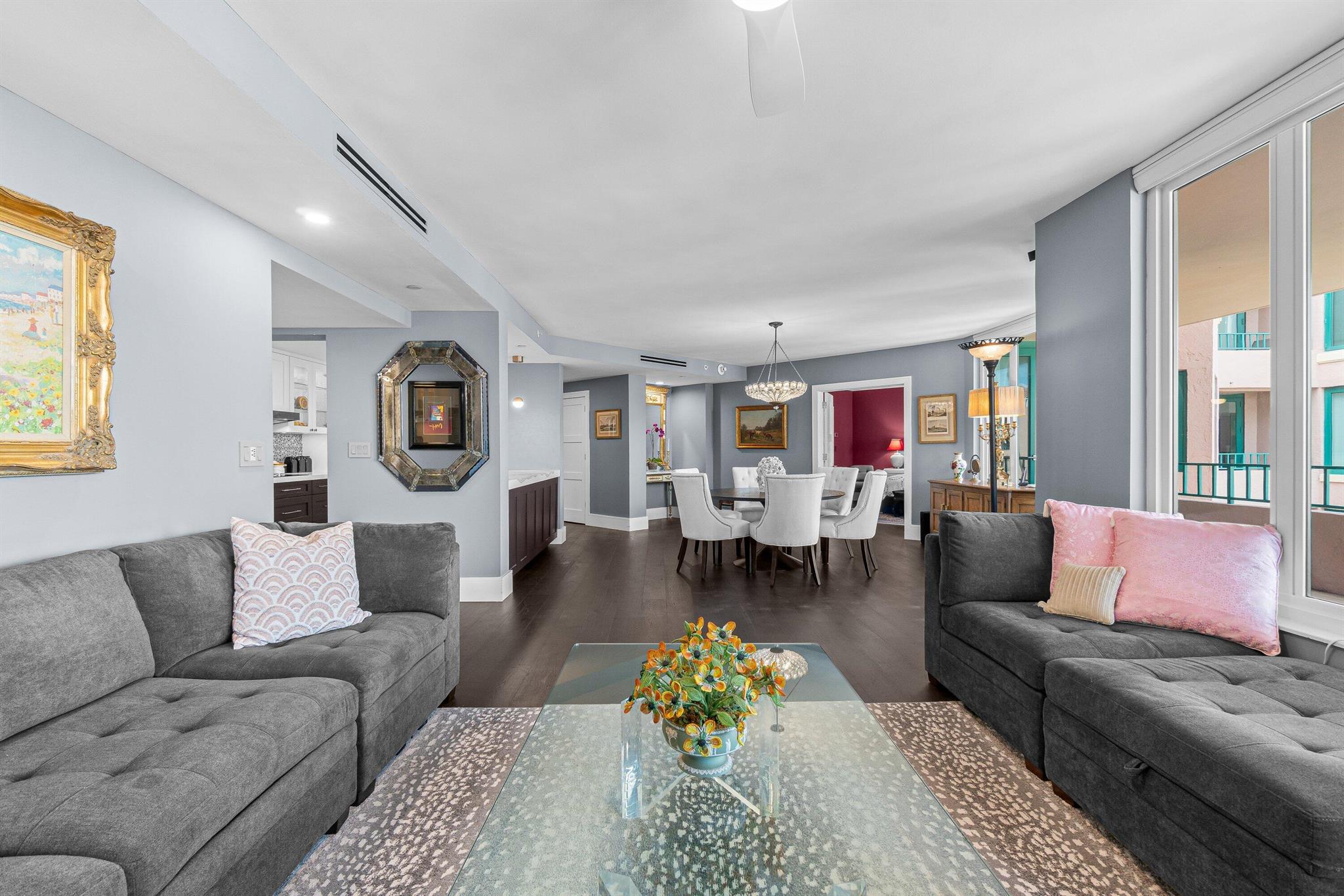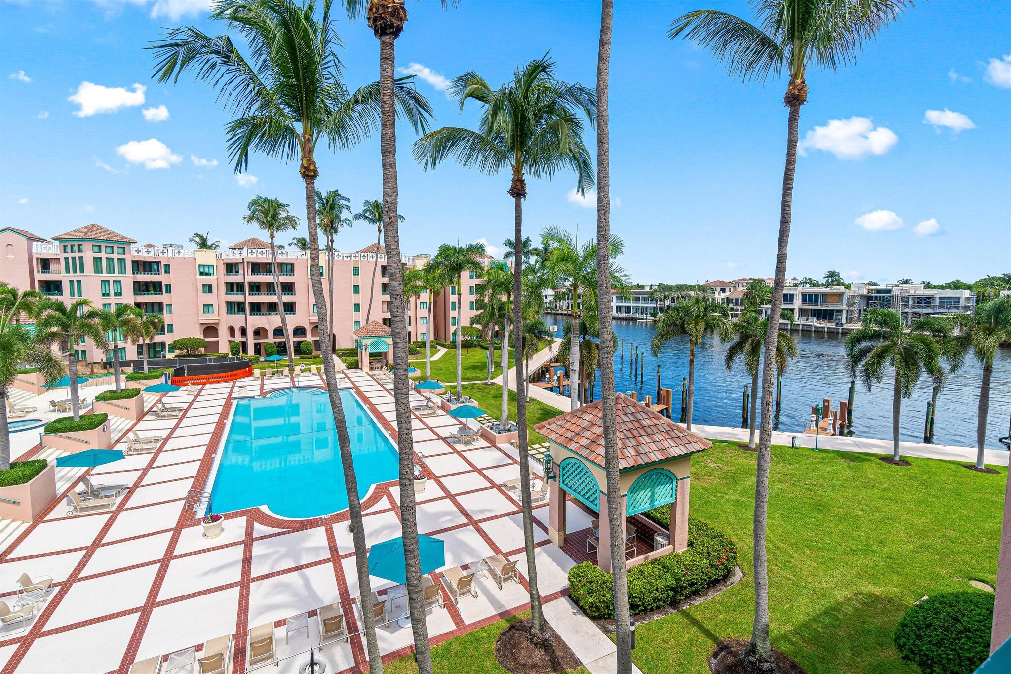 Elegantly renovated down to the studs, this spacious Bougainvillea model offers 2 bedrooms, 2 baths, and stunning views of the Intracoastal and pool. Featuring deep espresso hardwood floors, an open-concept living and dining area, and a sleek modern kitchen with quartz countertops, oversized island, and custom cabinetry. The primary suite boasts breathtaking water views, a large walk-in closet, and a spa-like bathroom with a custom vanity and oversized porcelain-tiled shower. Popular split bedroom plan. The guest suite enjoys water views and easy access to a beautifully finished bathroom. Additional highlights include HURRICANE impact windows and doors throughout, electric blinds, abundance of closet space, oversized patio with beautiful water views, full-capacity washer and dryer, and