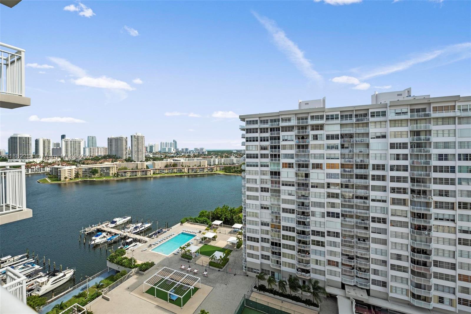 Amazing water & city view from this 2/2 unit with a den.1556 SQ FT. Open Kitchen lots of closets. Very bright unit. Many amenities including 2 swimming pools, Tennis court, exercise room. Sauna, BBQ area , fishing pier. convenience store & restaurant in the premises as well a Beauty Salon. Walking distance to Supermarkets, banks, dry cleaners, restaurants. Cover parking