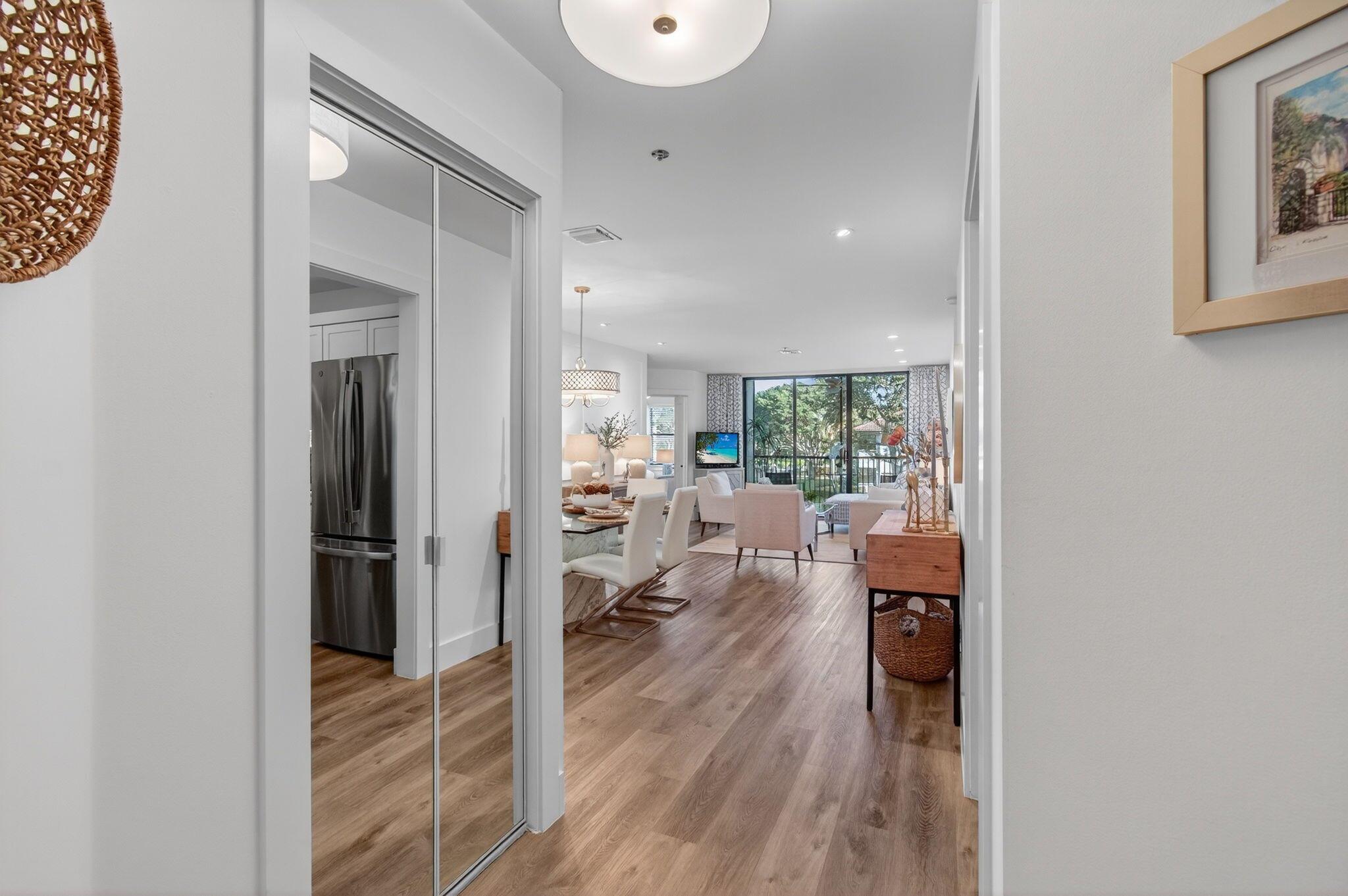 Exquisite three bedroom, two bath condo in Platina's Illustre Village offers a picturesque lake view from every window. This immaculate condo is is right out of an episode of HGTV! Beautifully decorated with extensive contemporary wood trim, high hat lighting and updated kitchen. The spacious master bedroom features a walk-in closet, plus updated master bathroom. The split floor plan provides privacy, while luxury vinyl flooring makes clean up a snap. Full-size washer and dryer (2023), a water heater (2022), and a recently updated air conditioning system (2024). The screen-enclosed balcony is ideal for enjoying morning coffee or relaxing while gazing at the serene lake. Perfect for all year or seasonal living.