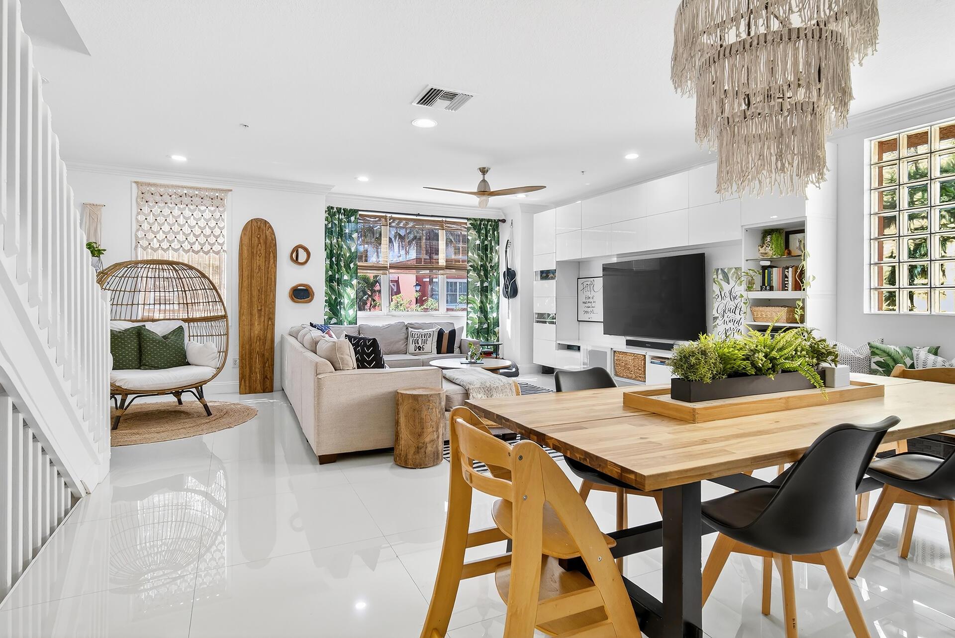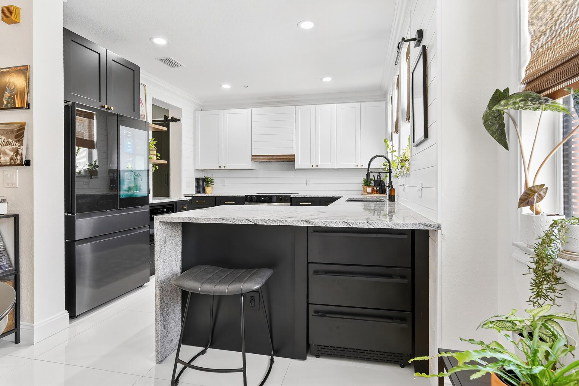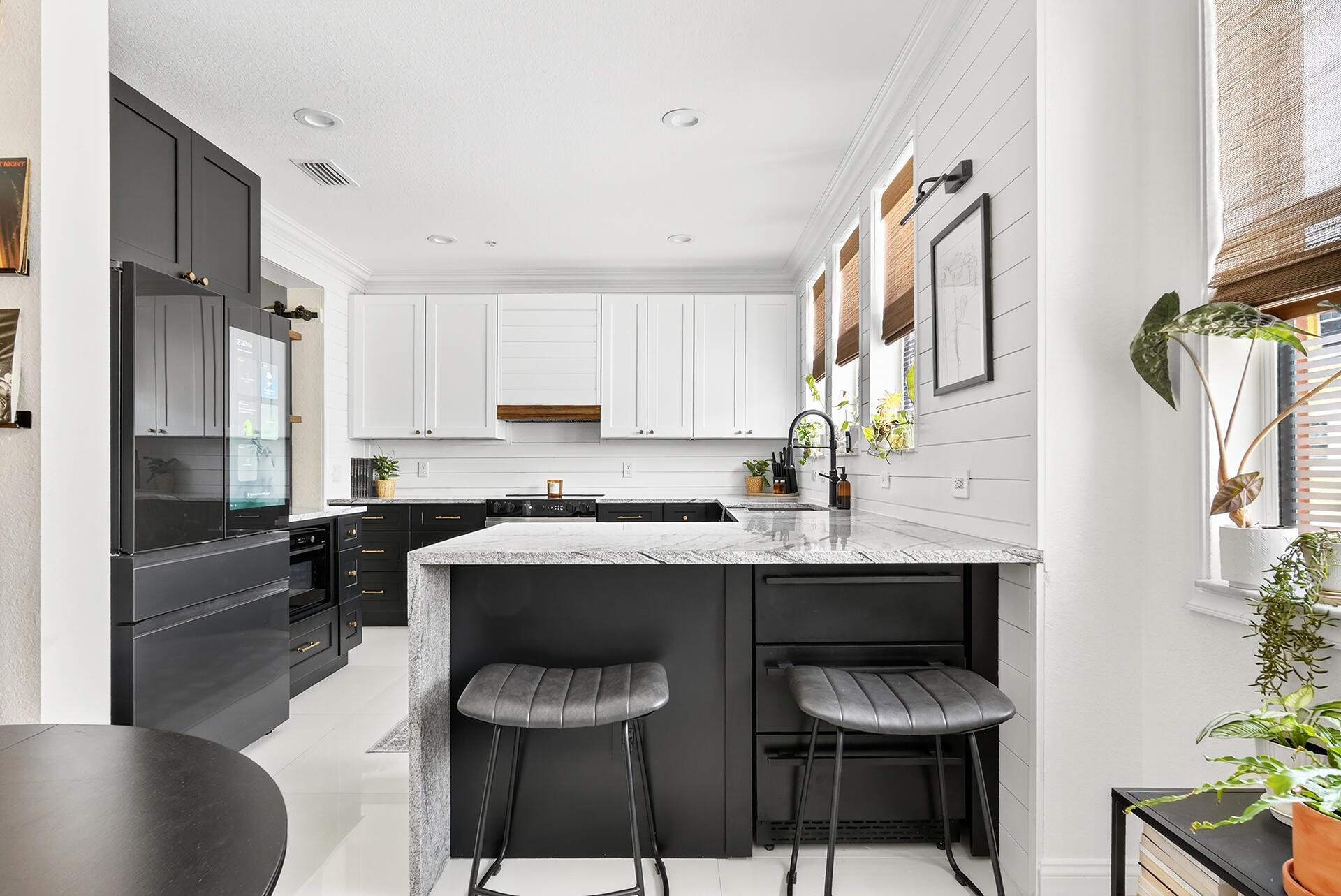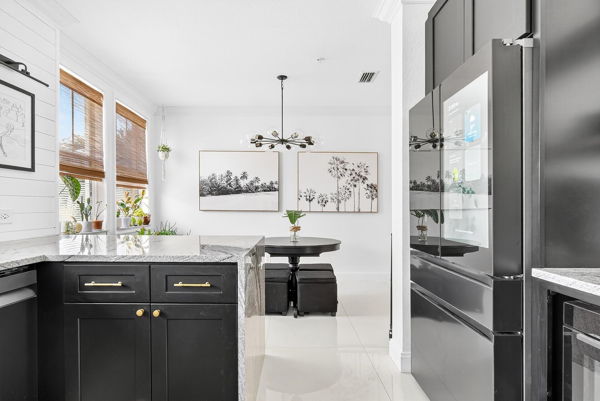 Stunning! Thoughtfully upgraded 4 bed 3.5 bath corner unit offers bright, open living with soaring 10' ceilings & tons of natural light. Features 32'' white tile & wood floors, crown molding, accent wall entry, modern fans, HUE lights, Nest thermo, etc. BRAND NEW kitchen is a showstopper, boasting granite waterfall edge with bar seating, slow-close cabinetry with 42'' uppers, open shelves, shiplap siding, black work station sink, & spacious pantry with a sliding barn door. Outfitted with top of the line Samsung Bespoke appliances, including a Family Hub touchscreen refrigerator & 3-drawer wine/beverage cooler, this kitchen is both stunning & smart. All bathrooms have been beautifully updated with new floors, counters, sinks, toilets, lighting & fixtures. New Bespoke W/D. 2 car garage.