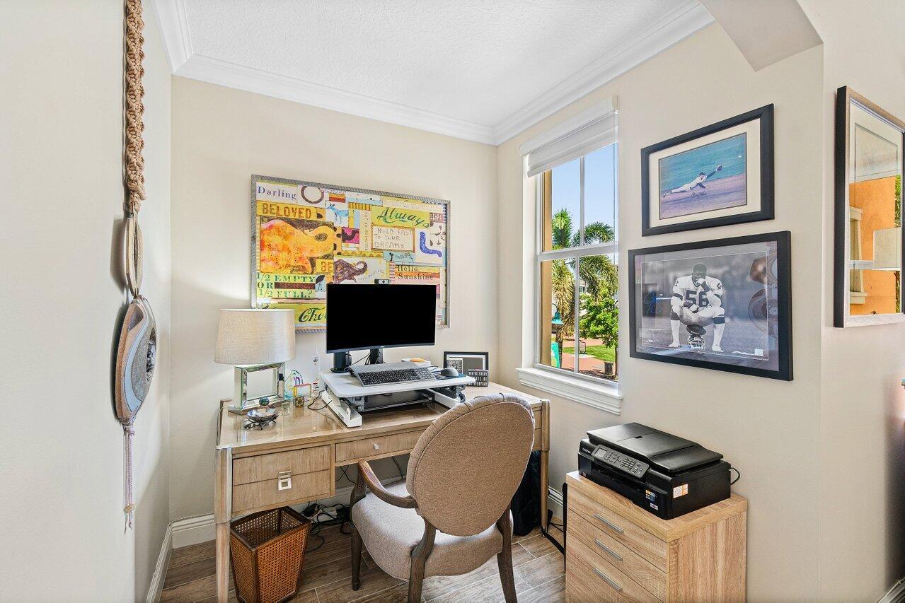 Luxury awaits in this meticulously renovated two-bedroom plus den, 2.5-bath condo in City Walk, located in the heart of Delray Beach's vibrant Pineapple Grove. This home is a true showstopper, boasting soaring 10-foot ceilings and an abundance of natural light that fills every room. The elegant porcelain tile floors lead you to a tranquil primary suite featuring a spa-like bathroom--your personal sanctuary. A spacious second bedroom with its own private bath is perfect for guests. The versatile den/office can easily be converted to a third bedroom. Enjoy peace of mind with impact-resistant windows and the convenience of an assigned covered parking space and a private storage unit. Don't miss your chance to own this stunning property!