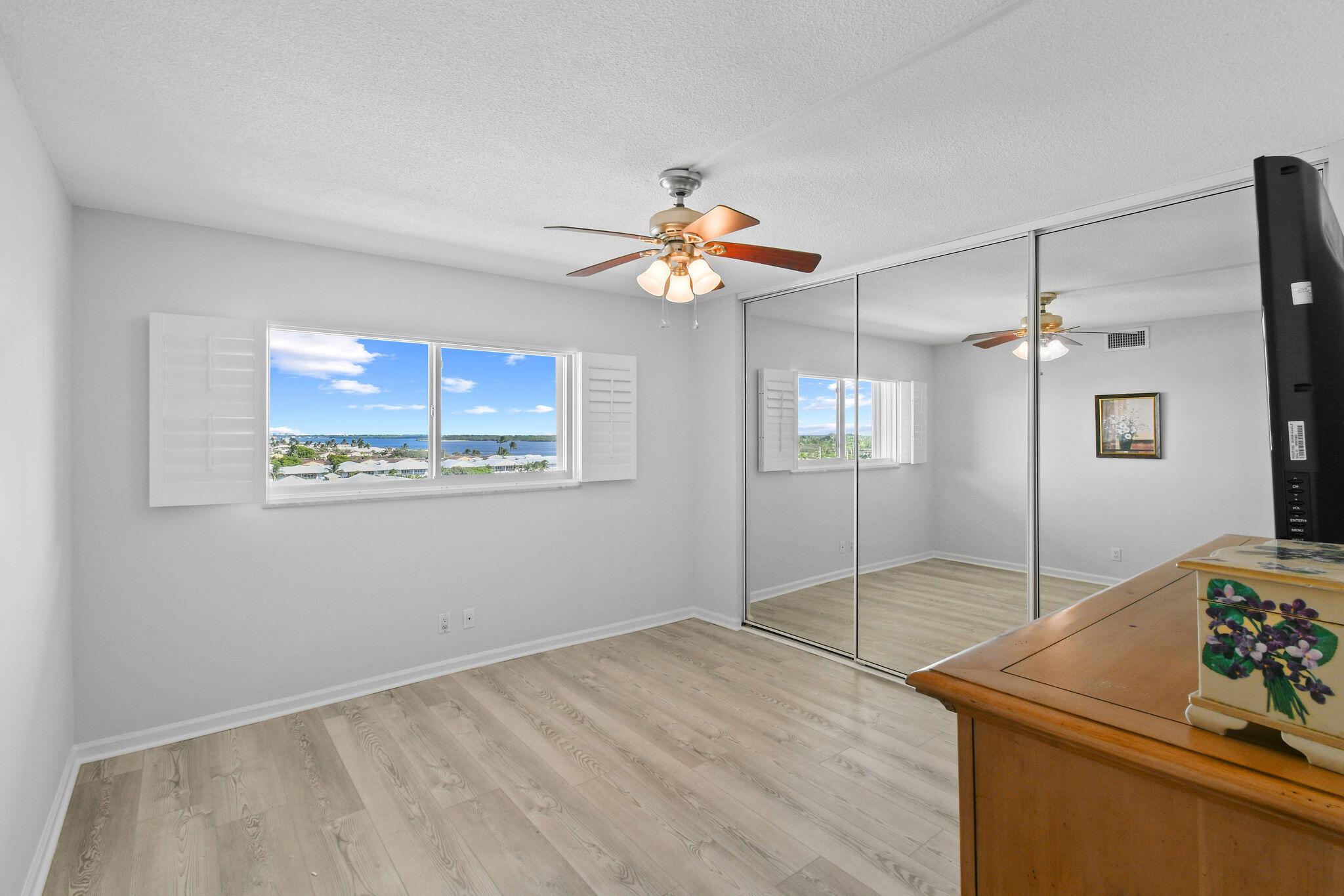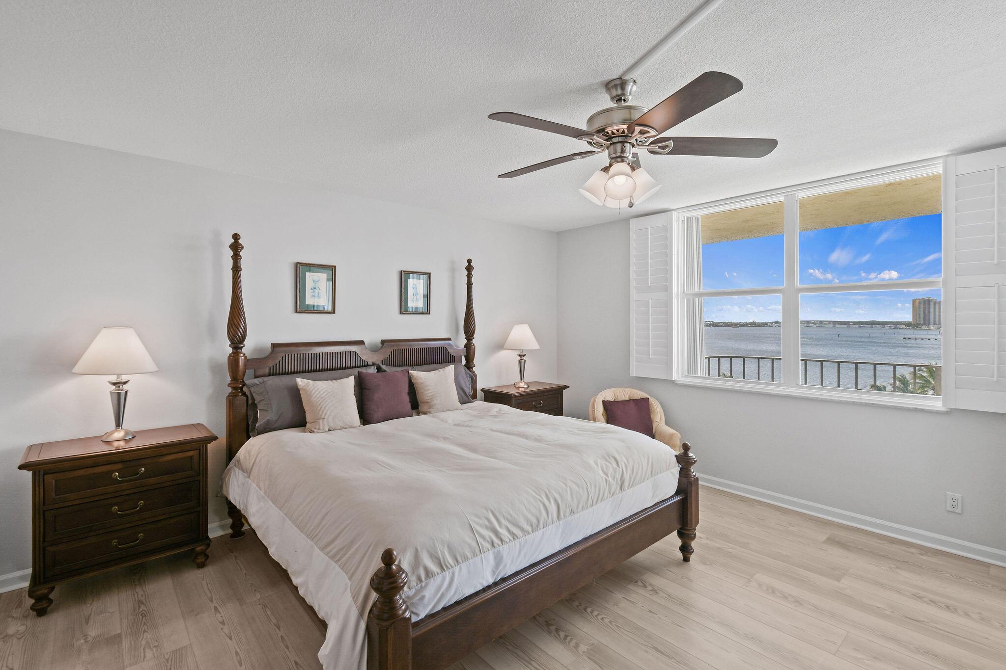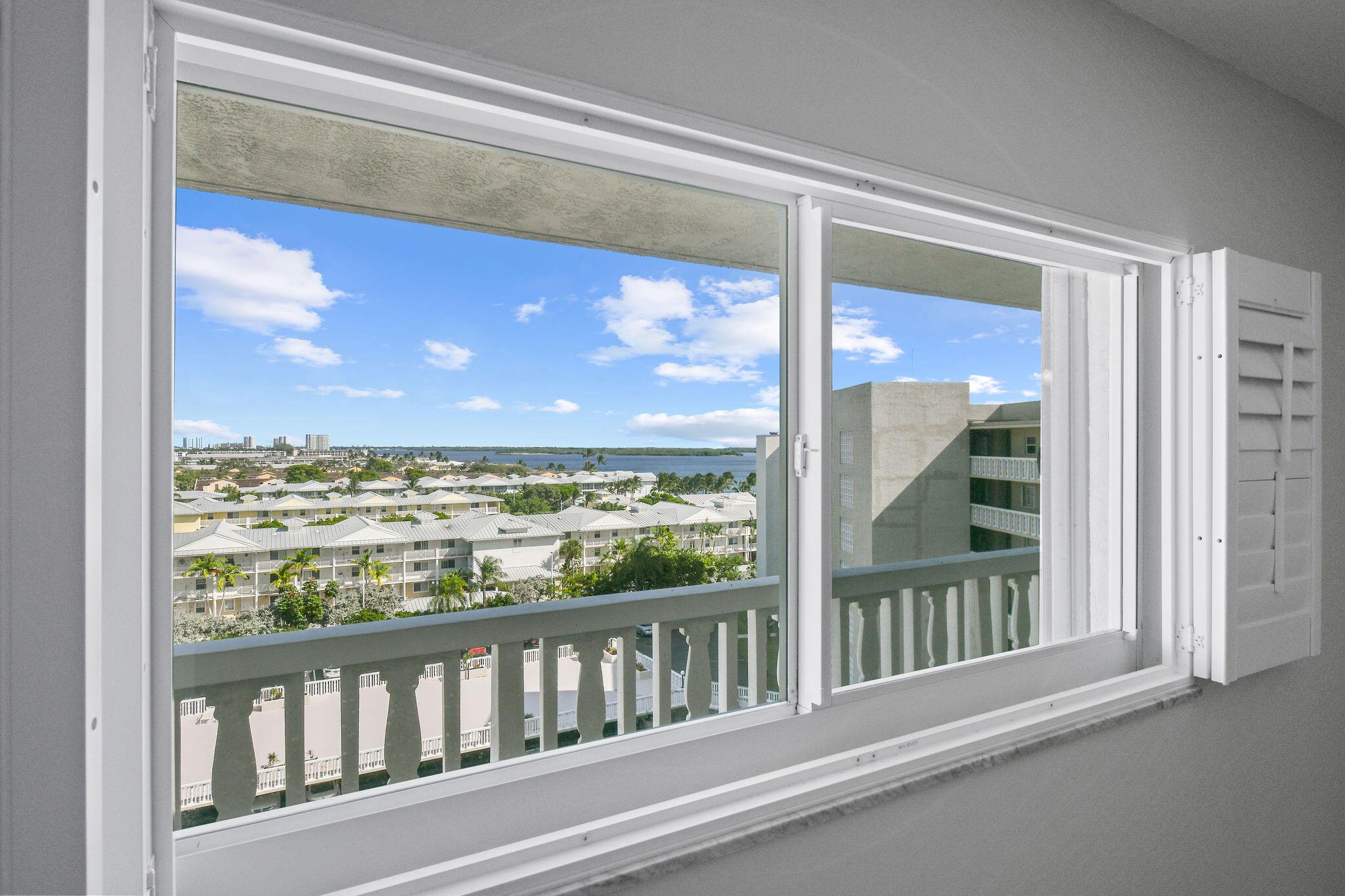 Sweeping Intracoastal views capture your attention from this top-floor condo offering glowing sunsets and water vistas ALL rooms. Enjoy SE breezes from your private balcony--perfect for relaxing or entertaining. The open-concept design enhances natural light throughout. The primary suite offers a widened entry to the en suite bath, thoughtfully framed by pocket doors to enhance privacy and quiet comfort. Guest bedroom and bath also have a dedicated pocket door for separation. Plantation shutters throughout. Vistas include Singer Island, Lake Park Marina, and the new luxury Nautilus 220. Play tennis or pickleball at Kelsey Park--or simply watch the matches from your balcony. Lake Park Marina is just two blocks away. Just fully repainted to a neutral origami white, and new water heater.