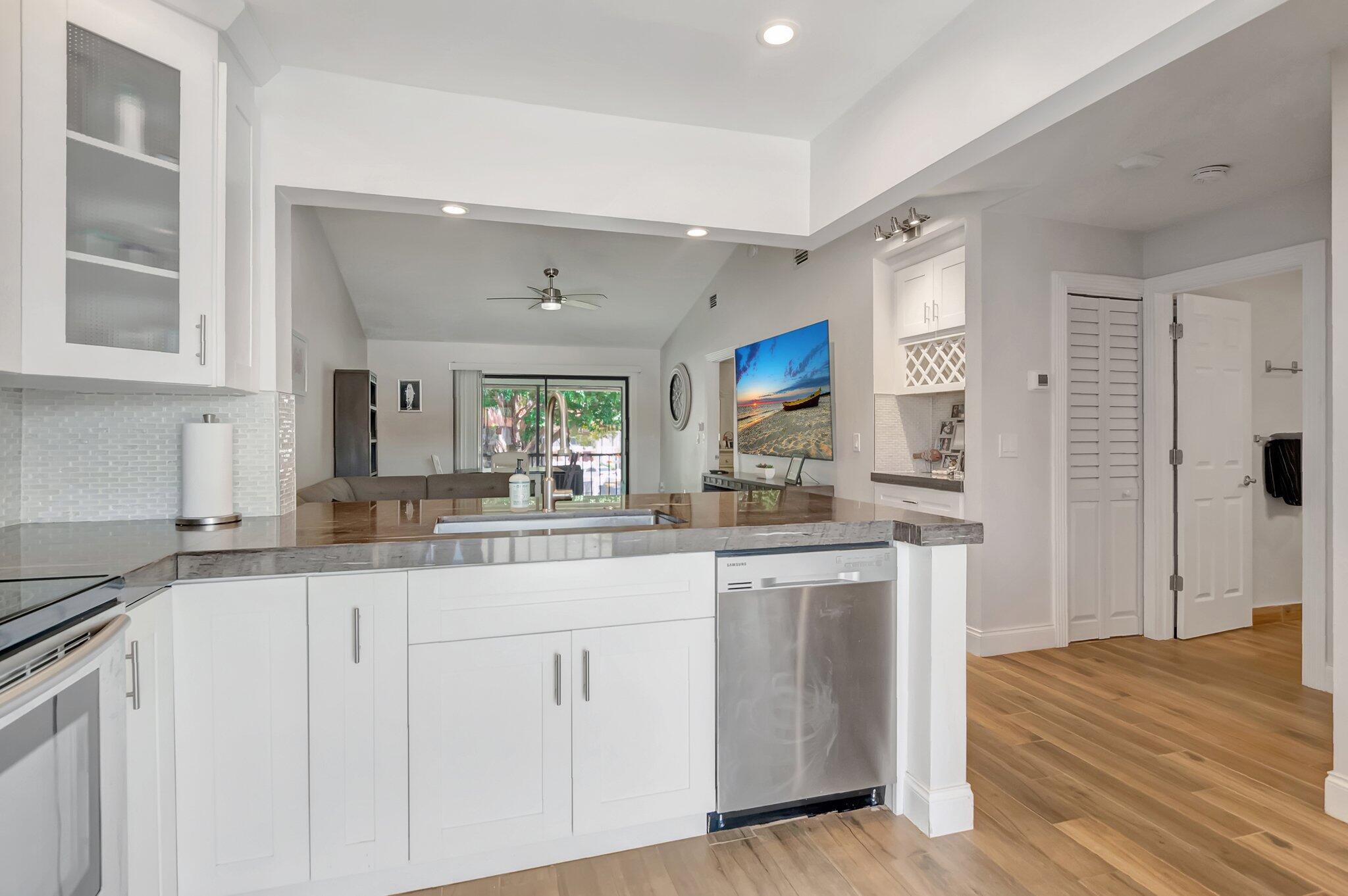 Fully remodeled 2-bedroom, 2-bath condo in the desirable San Remo Golf & Tennis community in East Boca Raton. Minutes to the beach, this home features an open floor plan with a custom wine bar, vaulted ceilings, new window treatments, and built-in closets. The gourmet kitchen offers stainless steel appliances, white shaker cabinets, and elegant marble countertops. Enjoy wood-look ceramic flooring throughout, including the screened balcony. Spa-like bathrooms with frameless shower doors and marble countertops.Walk to community pool & clubhouse. 2024 AC system. Very convenient location- close to many dining shopping and entertainment options as well as Downtown Boca Raton and Downtown Delray Beach. Cable and internet included!