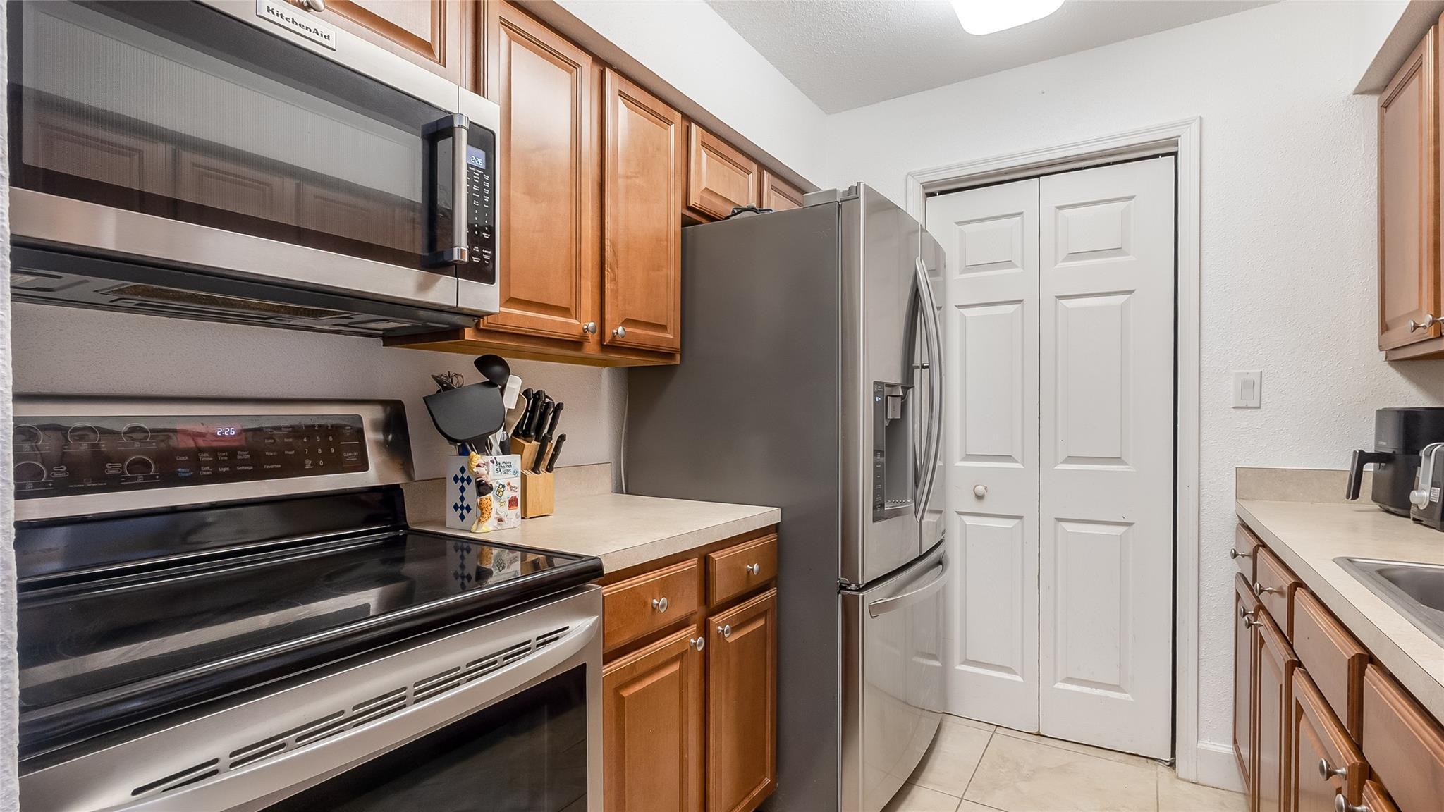 Perfectly situated on the 1st floor, CORNER 1-bed, 1-bath condo combines comfort, style & convenience! Enjoy a spacious open layout, modern kitchen with SS appliances, pantry & ample counter space, plus a generous bedroom with walk-in closet. Step out to your private patio ideal for morning coffee or evening unwinding. Upgrades include IMPACT WINDOWS & DOORS, 2021 A/C, 2017 water heater, FULL-size WASHER & DRYER IN UNIT & patio storage. The resort-style community offers a sparkling pool, clubhouse, fitness center & scenic walking paths. All-Ages, Pet-friendly & well-maintained with assigned parking for 1, space for 2 cars + guests! Prime location near shops, dining, parks & major highways. A fantastic opportunity for first-time buyers or savvy investors! Own with less than $9,500 down!