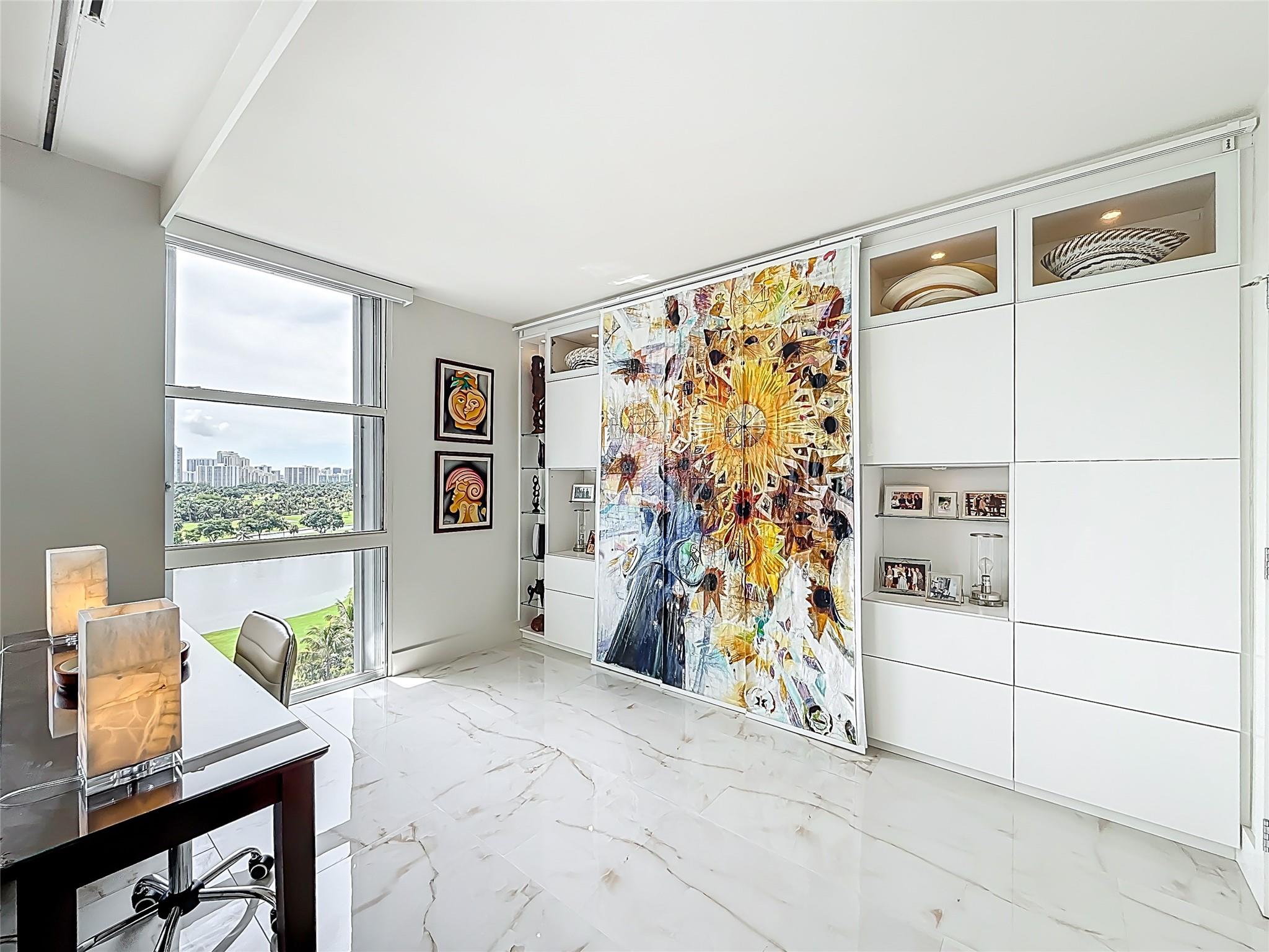 Architect’s residence with turnkey fully furnished option. 180-degree views of sunrises over the ocean, majestic sunsets, shimmering moonrises & serene lake reflections. Innovative living area seamlessly integrates the LR, DR & 2nd BR for open concept, but can be portioned into an office/bedroom w/ a panel pocket wall system. Artfully concealed Murphy bed creates a BR w/ closet & en-suite bathroom. Interior features: 3D accent walls, exquisite mother of pearl tile, custom kitchen, bar w/ built-in cabinets, entertainment center w/ floating shelves, motorized blackout shades, WIC, lots of storage, hurricane shutters & deeded parking (2nd available). Location is on the Soffer nature trail & Turnberry lakes…Walk to Aventura mall, restaurants, houses of worship, dog park, horse track