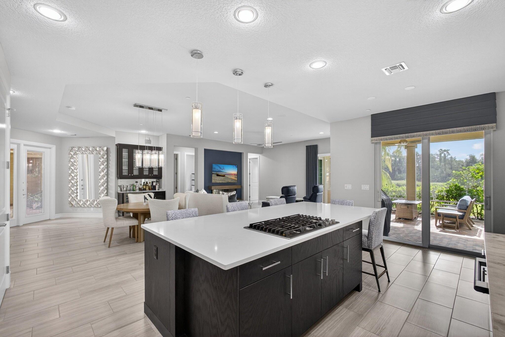 FULL GOLF MEMBERSHIP AVAILABLE IMMEDIATELY! Brand new to the market, this beautifully upgraded Toll Brothers Pesaro model is ideally situated on the ground floor with stunning golf course views. The designer-enhanced interior features a spacious open layout, beginning with a welcoming foyer that flows into a formal dining area and expansive great room including a custom bar with a newly installed wine fridge and a remote control fireplace feature creating the perfect ambience for relaxing and entertaining! The gourmet kitchen is a chef's dream, showcasing a newly expanded 10' center island quartz countertop, brand-new JennAir cooktop, Fulgor Milano luxury appliances, with access to the screened in lanai.