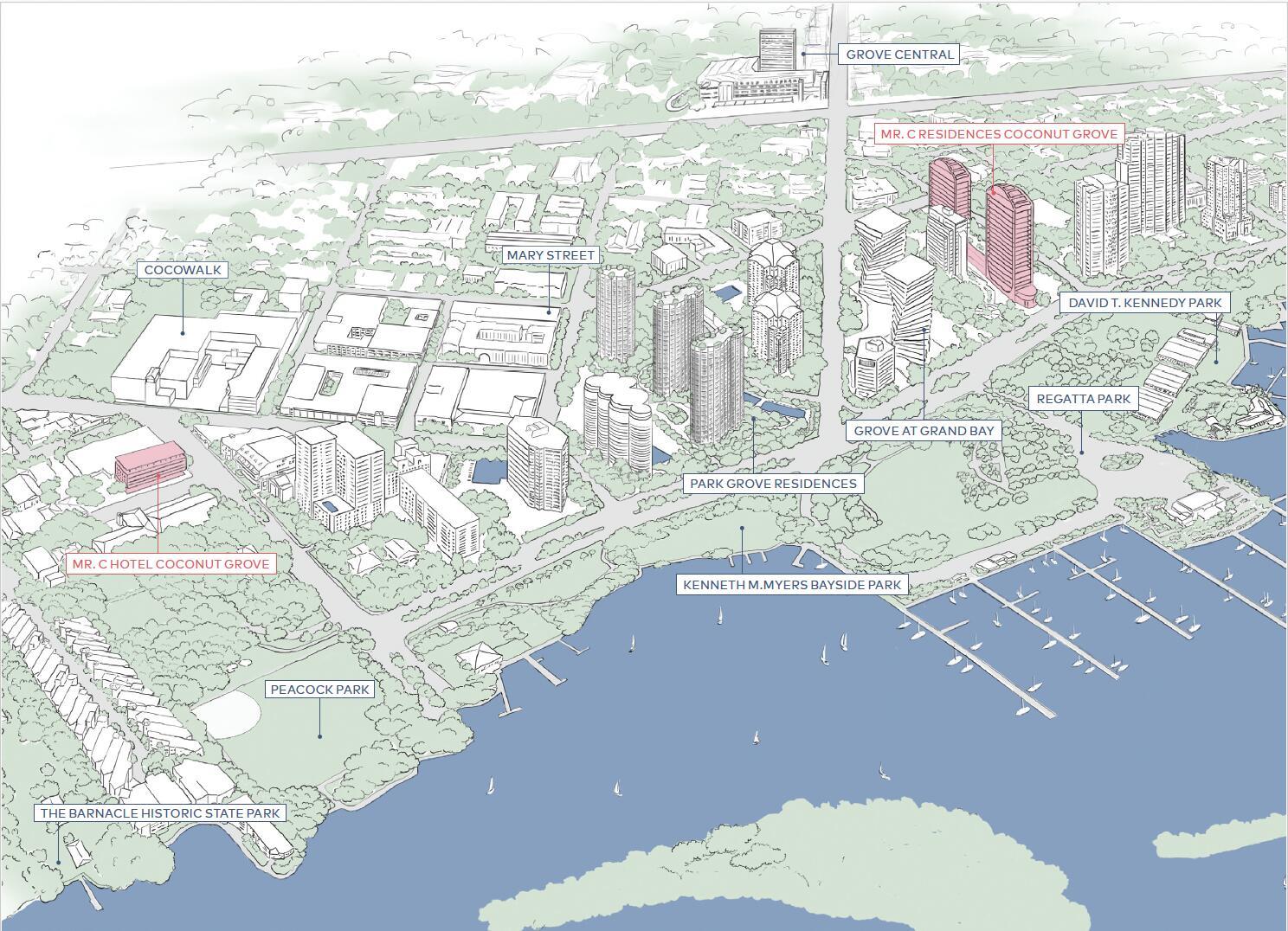 Modern Elegance Meets Iconic Service at Mr. C Residences, Coconut Grove. Wake up to incredible sunrise views stretching toward Key Biscayne in this beautifully finished 3 bedroom, 3 1/2 bath residence that offers a fourth flex space that may be used as a bedroom, den, or private dining room. Spanning 2,623 square feet, the home is surrounded by an expansive wraparound terrace that encircles the entire residence, creating a seamless indoor-outdoor flow and framing breathtaking views from every angle. Inside, the open layout is accentuated by 11-foot glass walls that fill the space with natural light.