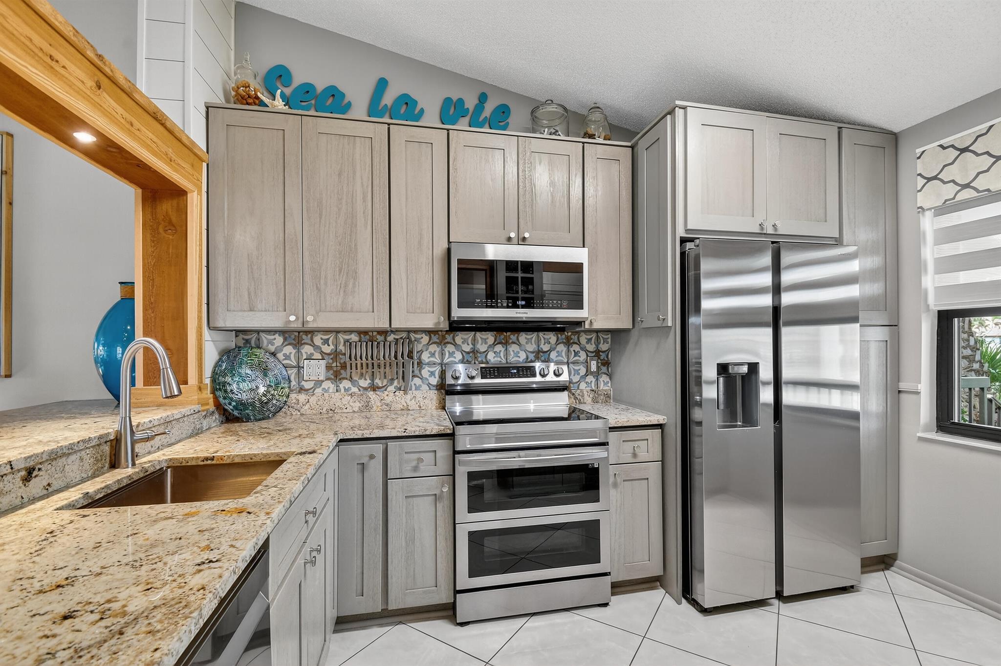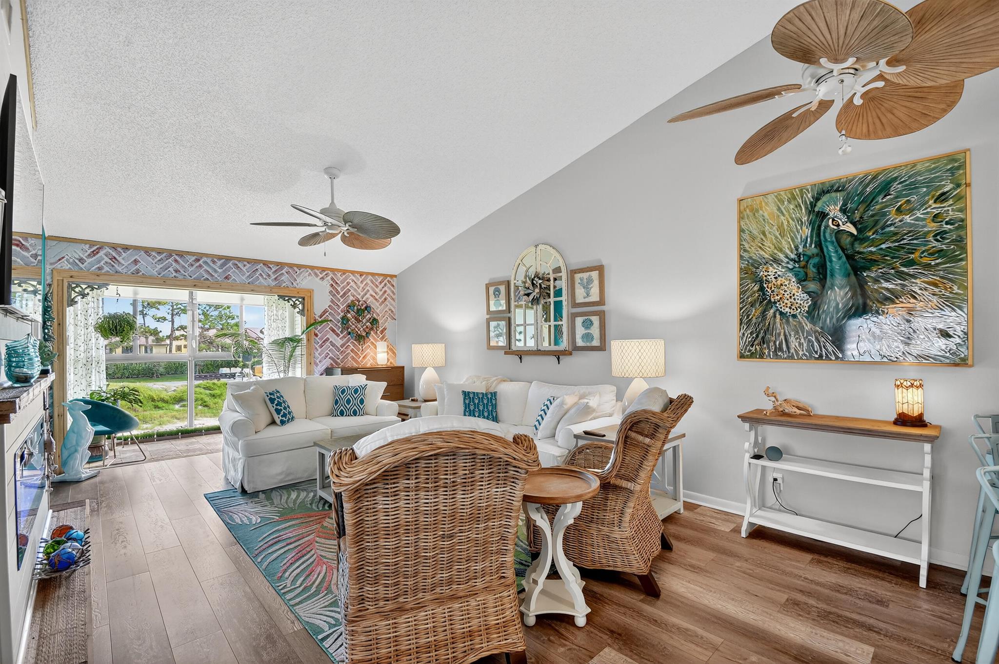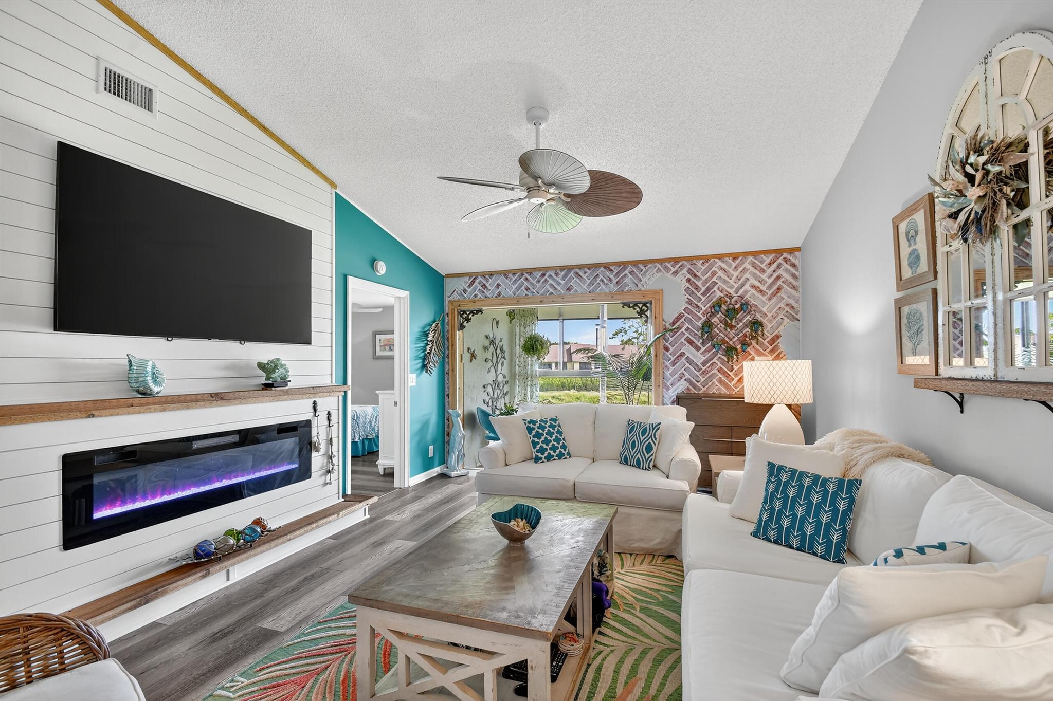 Impeccable, stunning aparment with views of water from all windows. This end unit apartment with vaulted ceilings has been beautifully updated starting with high rated impact windows. The a/c is a larger high efficiency unit, 2 yrs old. The water heater and washer and dryer are 4 years new. Bathrooms have been updated with frameless shower within 1 year. Kitchen with extensive cabinets including by bar stools. Built in firepalce with designer wood accents on wall - doors are upgraded with designer inserts. The patio area has a/c and is part of the home. The views are water and park areas. This is a 2 story building and does not have state required engineering requirements. This home is perfect. Close to Turnpike, shopping movie theatre.