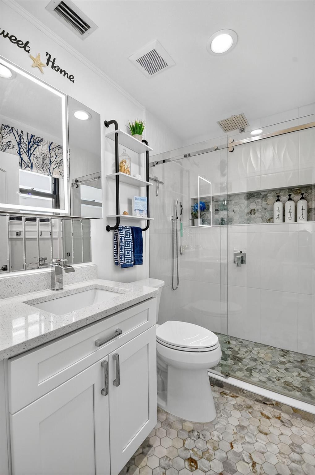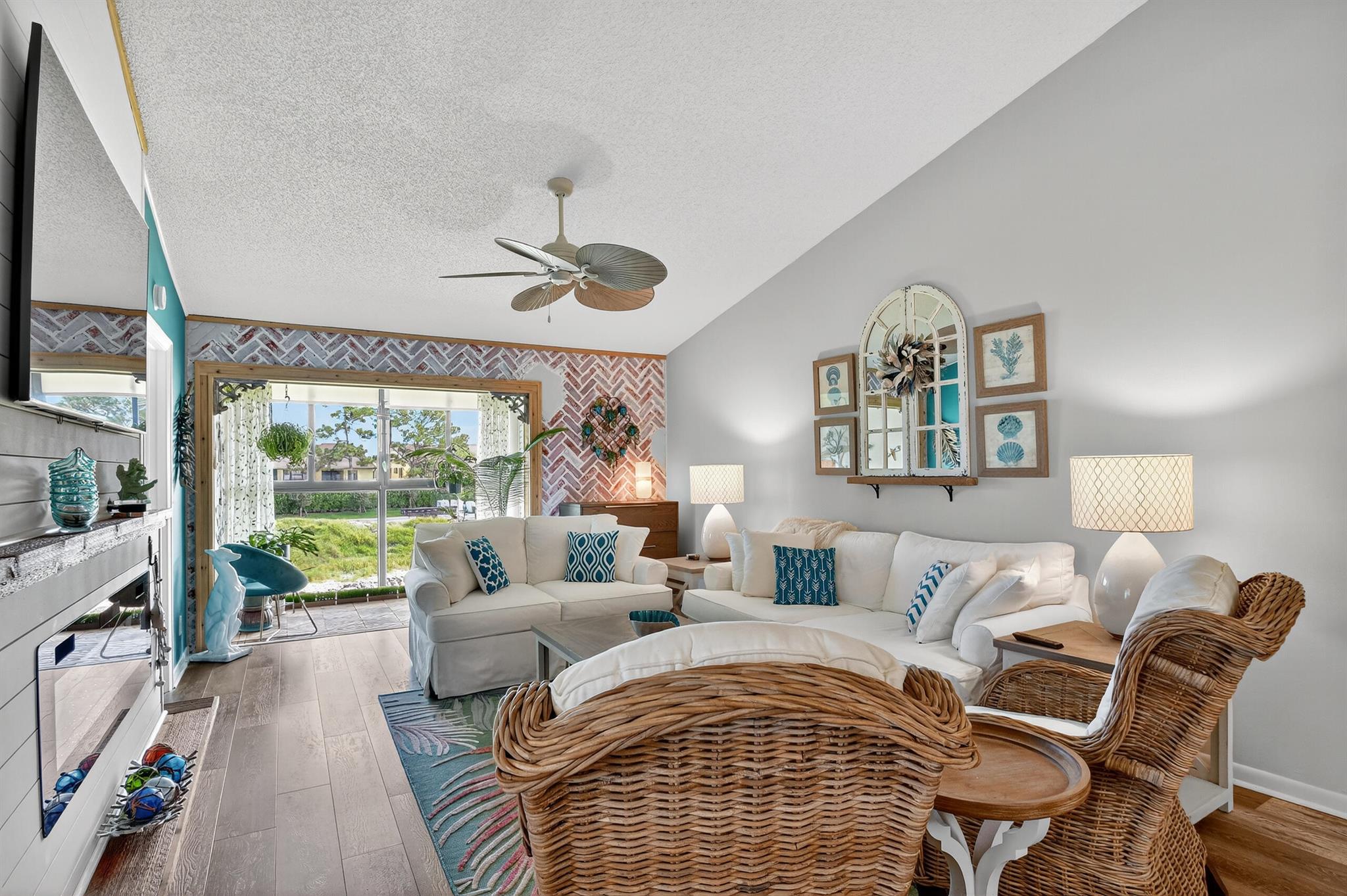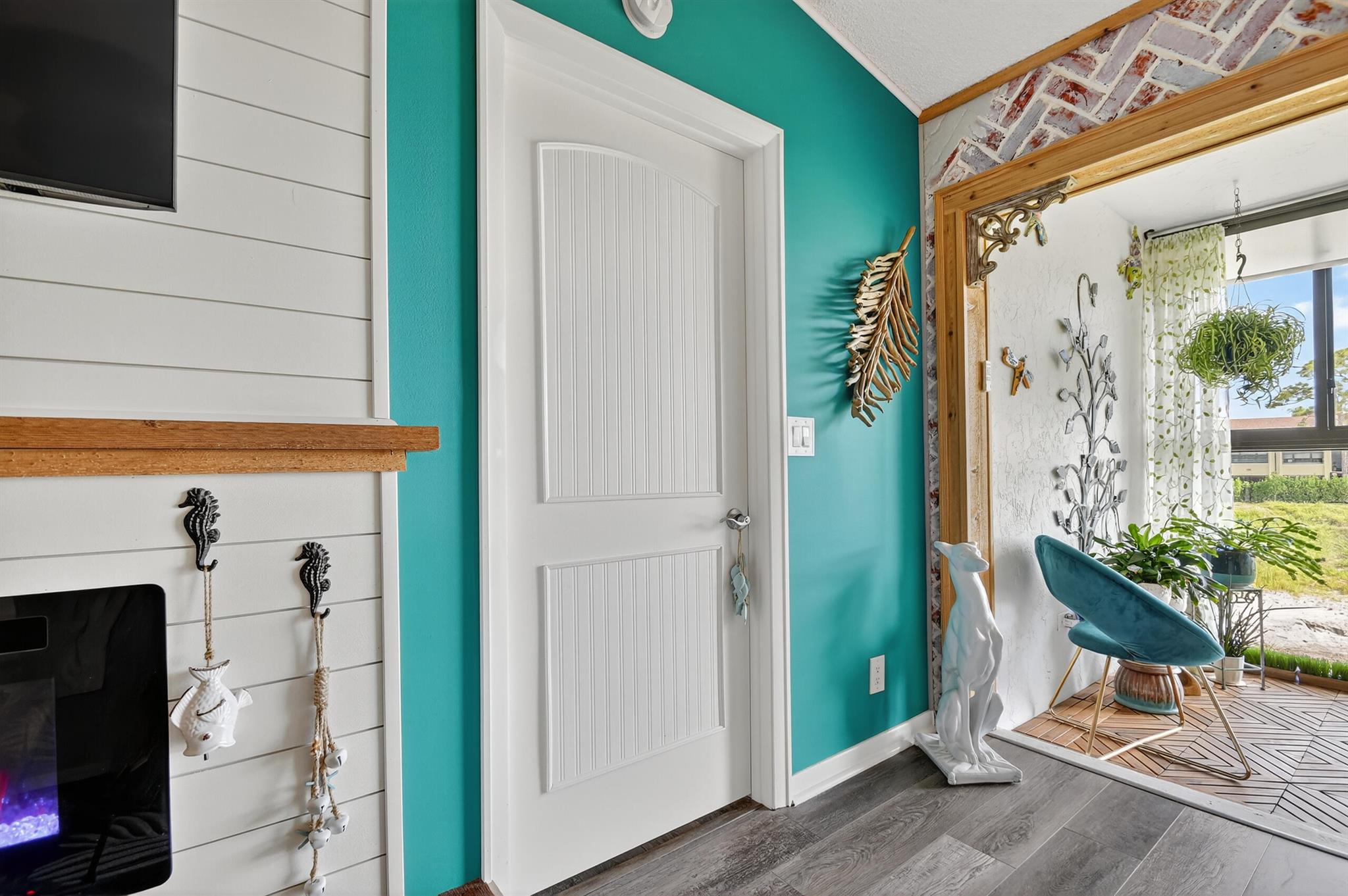 Impeccable, stunning aparment with views of water from all windows. This end unit apartment with vaulted ceilings has been beautifully updated starting with high rated impact windows. The a/c is a larger high efficiency unit, 2 yrs old. The water heater and washer and dryer are 4 years new. Bathrooms have been updated with frameless shower within 1 year. Kitchen with extensive cabinets including by bar stools. Built in firepalce with designer wood accents on wall - doors are upgraded with designer inserts. The patio area has a/c and is part of the home. The views are water and park areas. This is a 2 story building and does not have state required engineering requirements. This home is perfect. Close to Turnpike, shopping movie theatre.