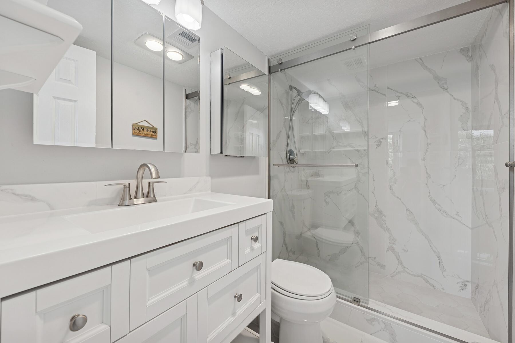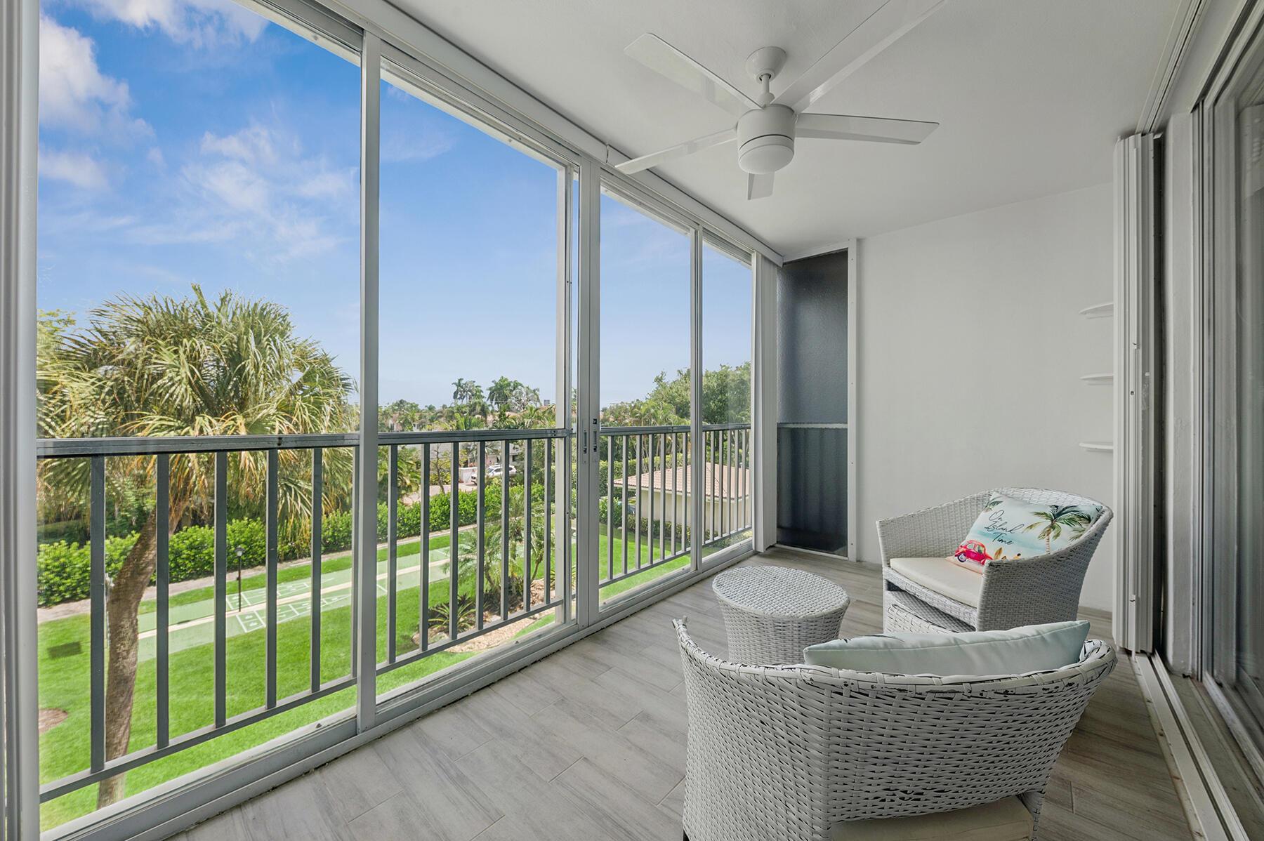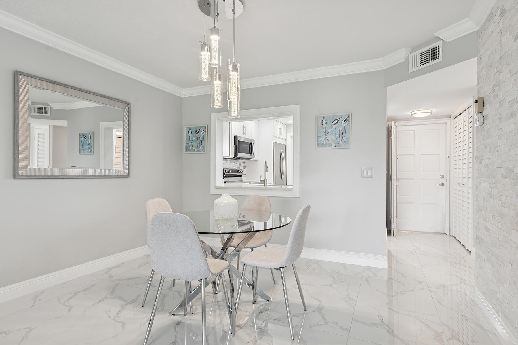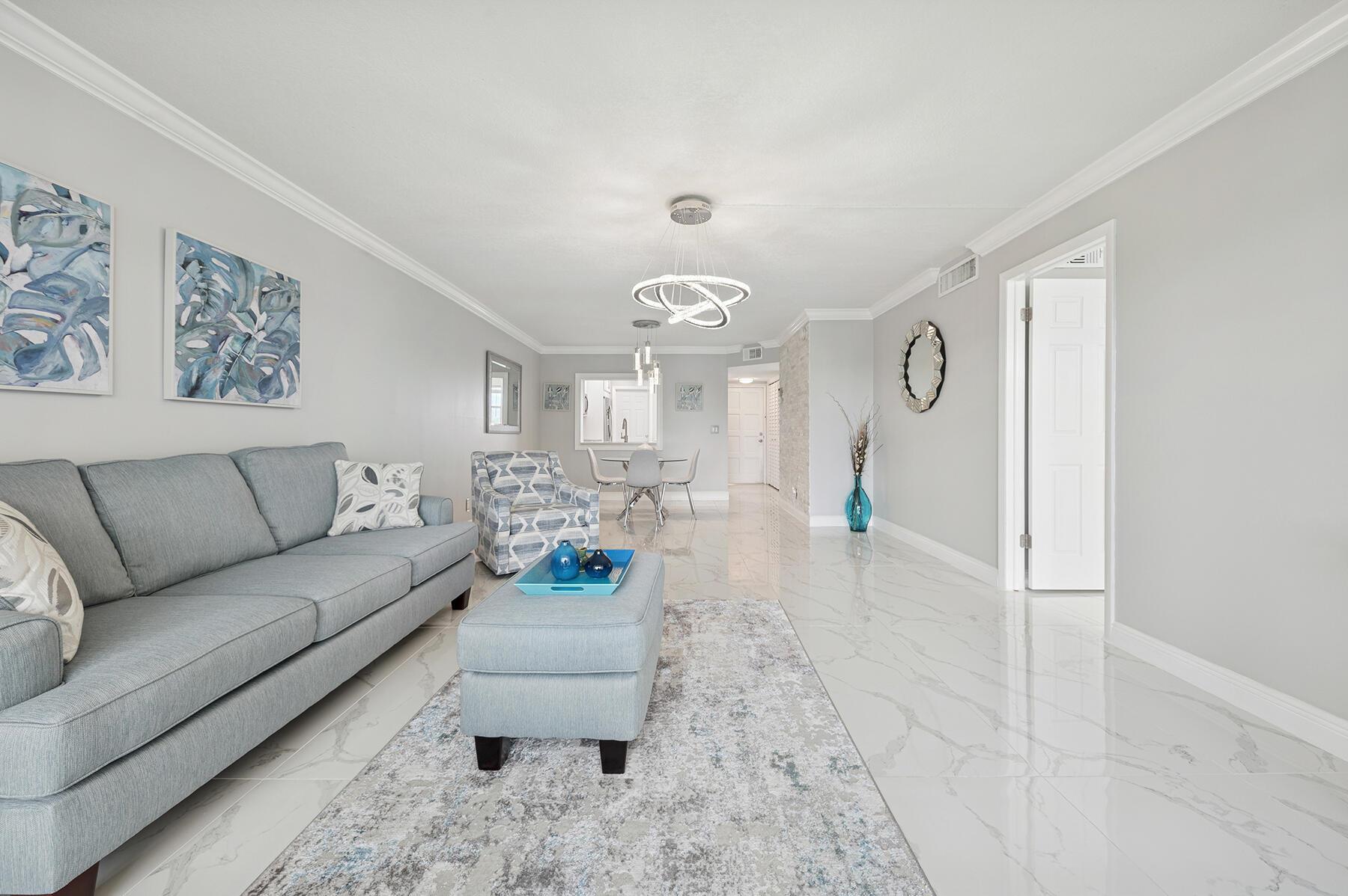 MOTIVATED SELLER! As you enter this stunningly remodeled 1200sqft, 2BR/2BA condo, you are immediately struck by the bright and airy split and open floor plan, the high end finishes, and the beautiful intracoastal and garden views. Every aspect of the home has been remodeled including chic marble-designed tile throughout (no carpet here!), new designer lighting, a gorgeous stone accent wall, and renovated kitchen and bathrooms. The beautiful kitchen boasts custom white cabinetry, quartz countertops, stainless steel appliances, and an opening into the spacious dining and living room. Sun streams through the floor-to-ceiling glass sliders on the screened in lanai. The oversized primary suite offers Intracoastal and garden views, a walk-in closet, and a designer bathroom with luxury