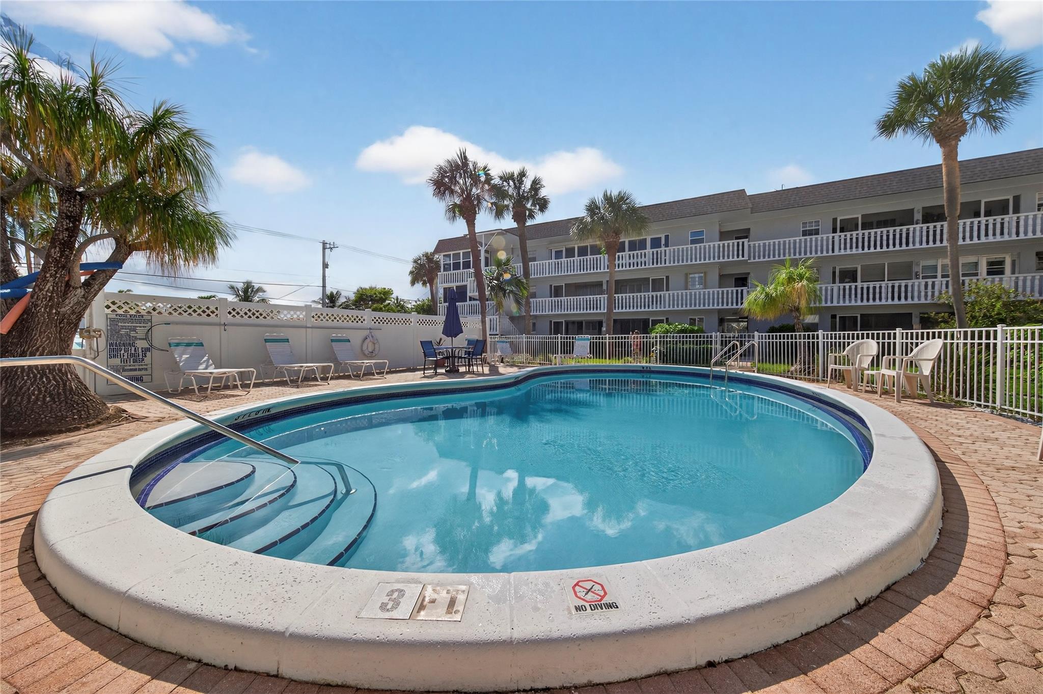 Wonderful bright 1/1 -bedroom condo with a gorgeous view of the water and garden from the screened balcony and kitchen. In a well-maintained 55+ community with heated pool, shuffleboard, barbeque, and large community room including billiard table and kitchen. This community has their 40/50-year recertification in 2019 and a recent reserve study. Located just steps from the beach, great dining and shopping, this unit is waiting for your personal touches. New AC in 2022, Newer hot Water Heater and Fridge. There is plenty of guest parking. No pets or smoking. Rentals are allowed after the 1st year of ownership for a minimum lease of 1 year. North Hampton Court is about a mile from the ocean and is close to shops and restaurants.