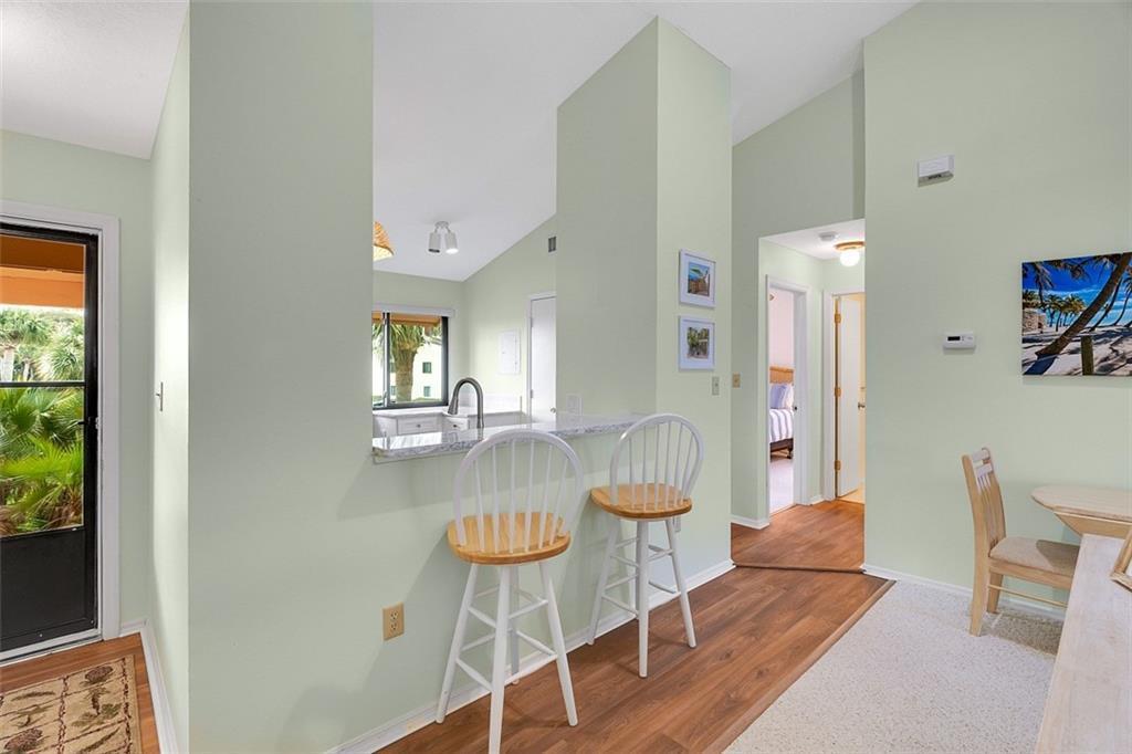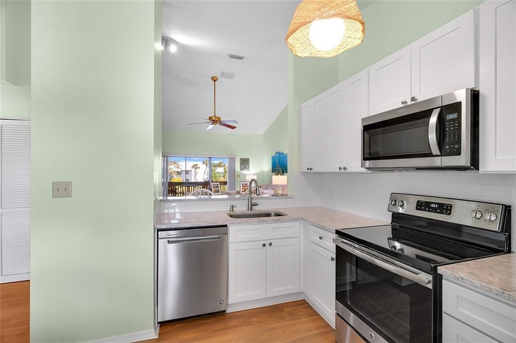 Charming 2BR/2BA condo w/ beautiful lake & golf views, soaring ceilings, and no upstairs neighbors! The kitchen boasts white Shaker cabinets, quartz counters, and stainless steel appliances. Unit features include: impact windows, newer A/C unit & HWH, bug screens on porch, and a stackable washer/dryer. Start your mornings on the porch with the most stunning lake views! Enjoy free golf, putting green, tennis, pickleball, bocce ball, heated pool, marina with free dock, and community activities like poker, book club, and golf leagues. Gated access, on-site maintenance, and pest control included!