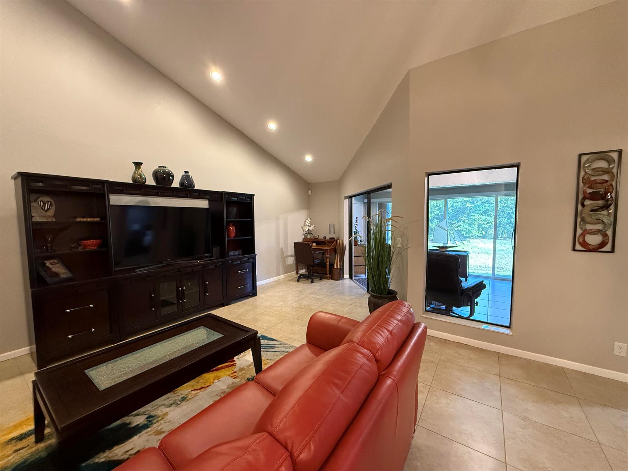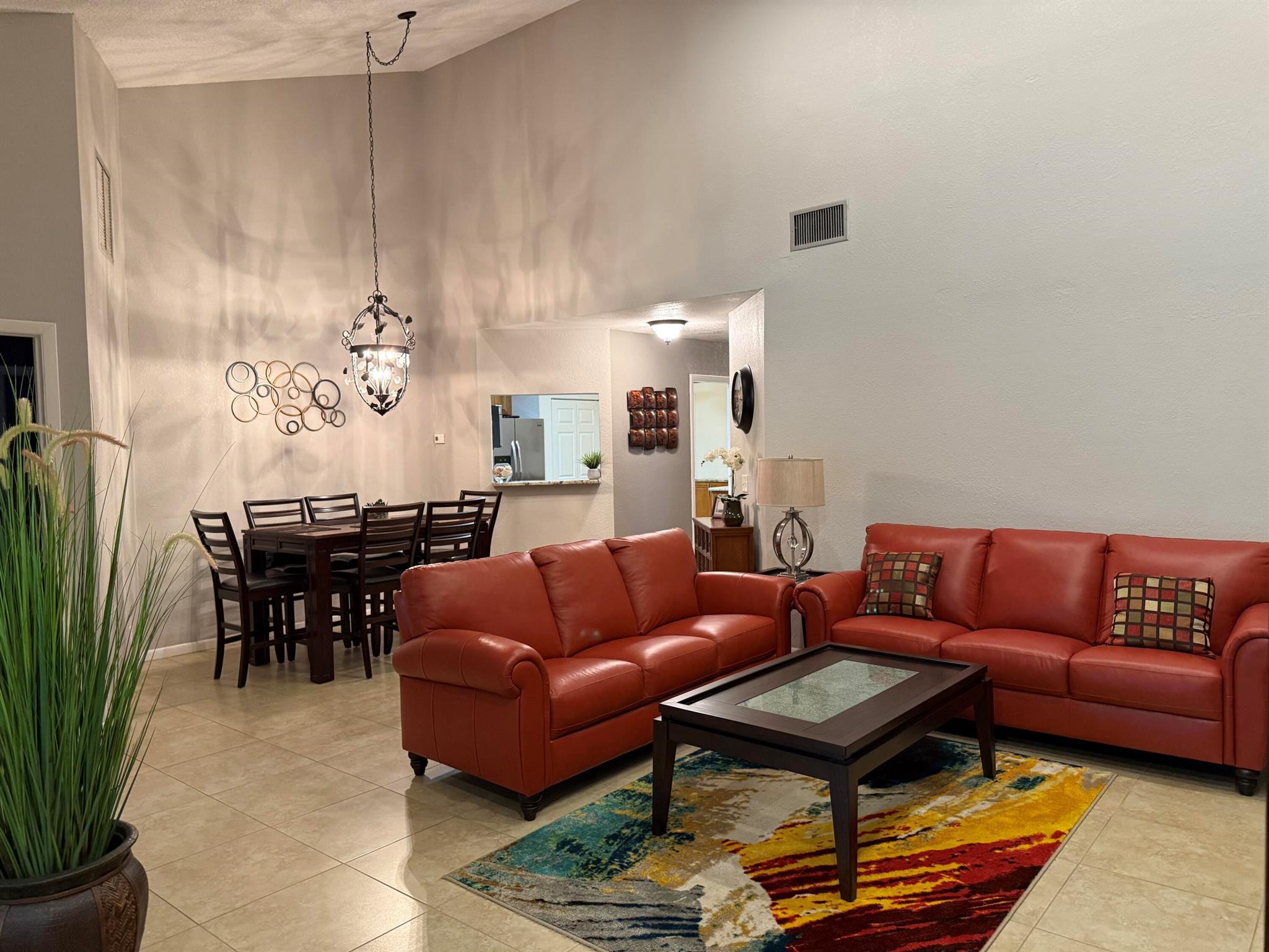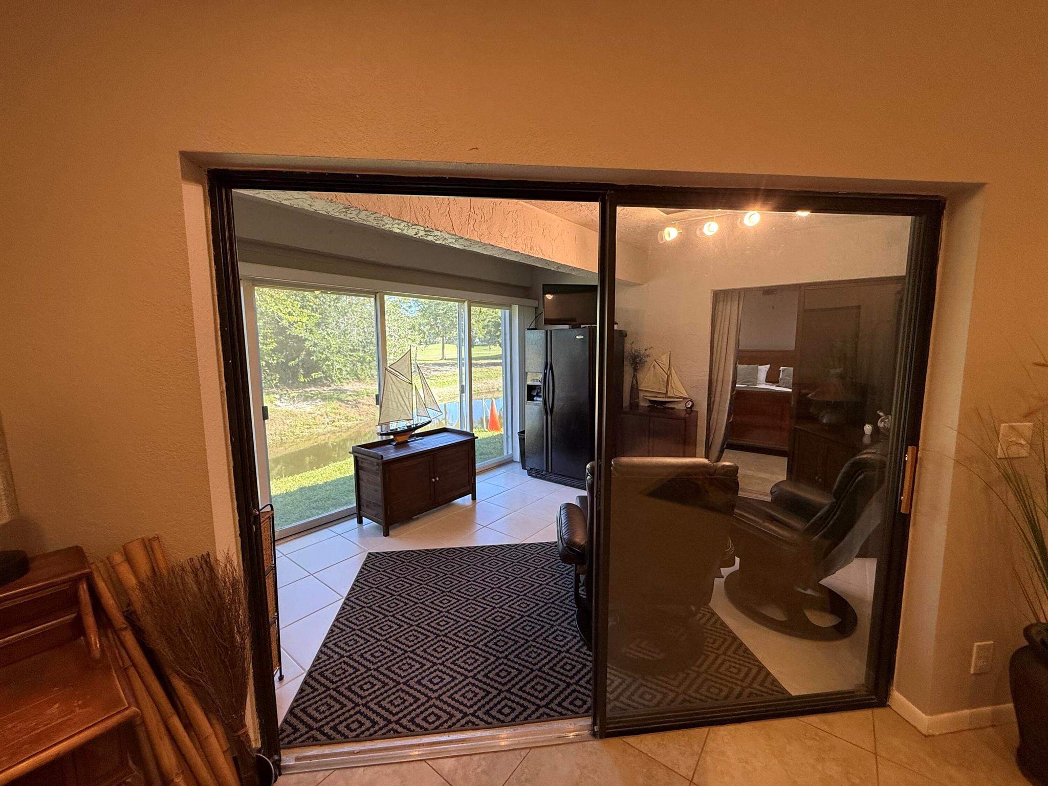 This corner unit villa with 3 bedrooms, 2 bathrooms and a one car garage is located in Lantern Walk. The home is a split floorplan and has cathedral ceilings. There has been updating to the large eat in kitchen and other areas of the home. There is ceramic tile throughout. An extra bonus to this home is an enclosed air-conditioned sunroom that adds to the living space, and you can see the golf course and water views from the sunroom and the primary bedroom. The neighborhood has a pool and a clubhouse where you can enjoy the Florida weather.