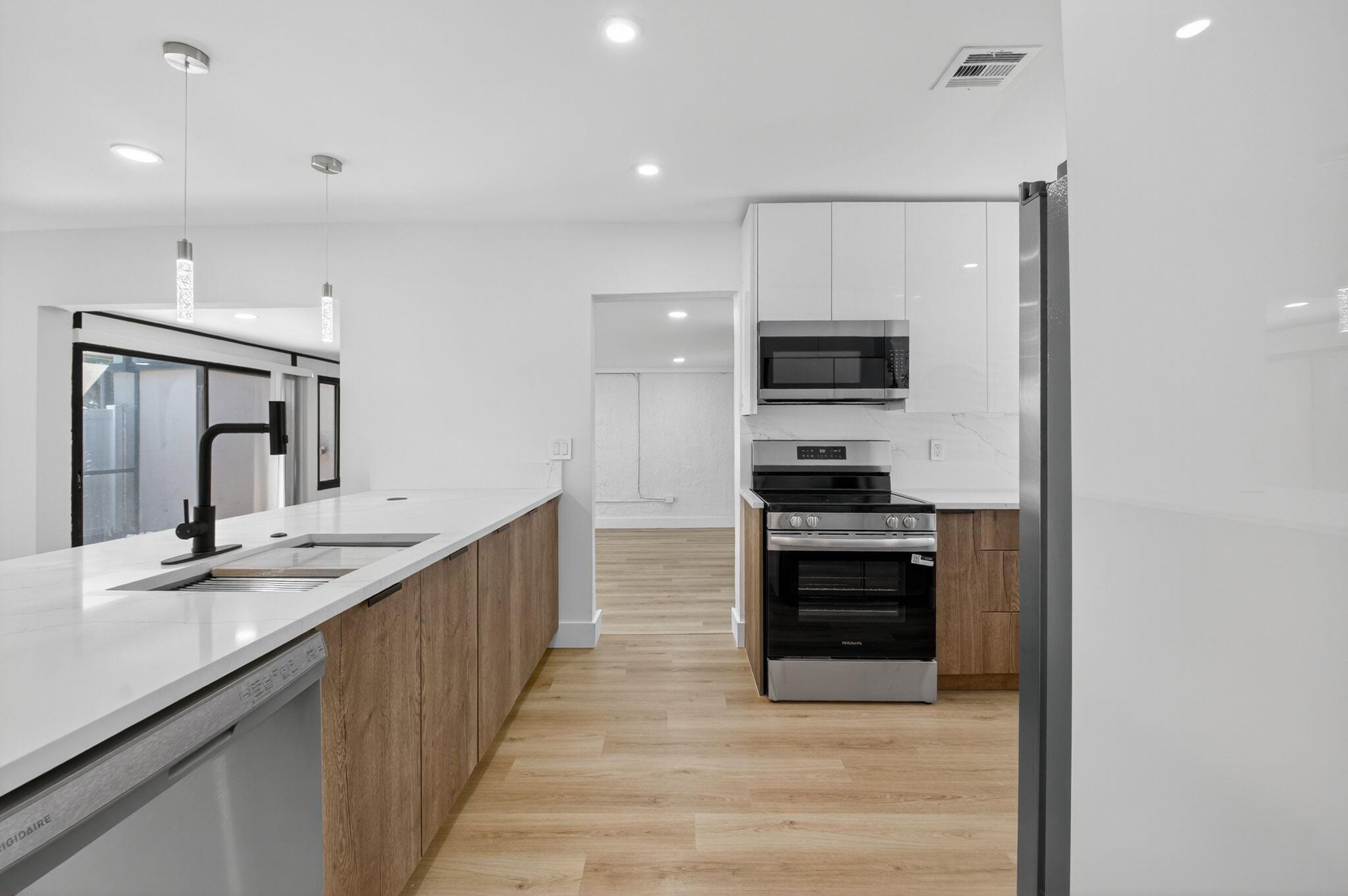 STUNNING REMODEL! This gorgeous 2BR/2BA villa in a 55+ community is fully updated with NEW roof, NEW AC, NEW electrical panel, NEW stainless appliances, NEW washer & dryer, NEW patio screen, and NEW fence all completed 2025. Enjoy open-concept living with modern finishes--high-gloss and wood-tone cabinets, quartz counters, and matching backsplash. Both baths feature frameless glass showers and LED mirrors. Vinyl flooring, recessed lighting, and stylish fixtures throughout. (living/dining room and master bedroom room pictures are virtually staged). Low HOA ($290/mo) includes lawncare, community pool & clubhouse. Prime location near Downtown Delray, Atlantic Ave, beaches, restaurants, shopping & Delray Med Center. 650 credit score required by HOA. Move-in ready--schedule your showing today!