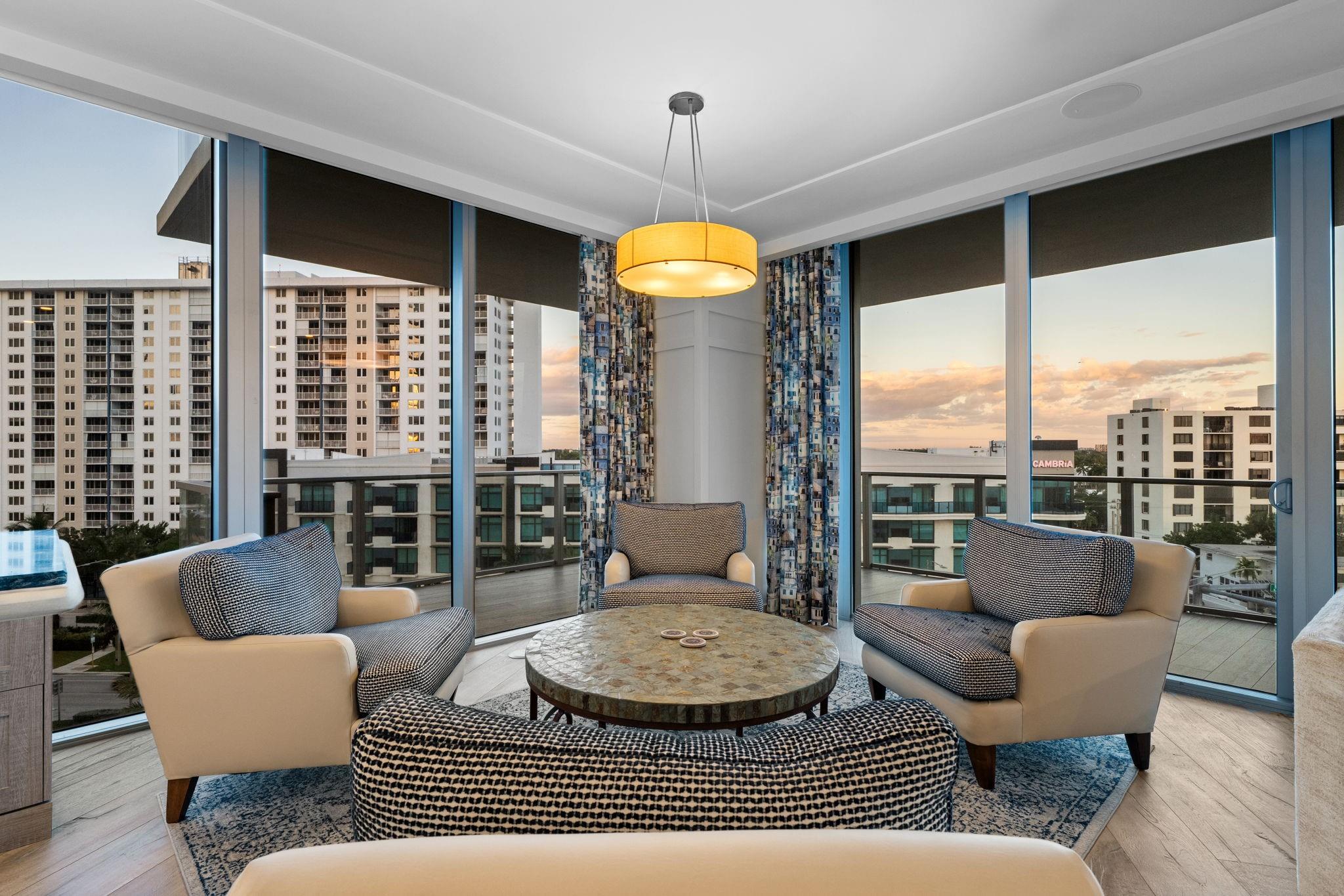 Experience opulent coastal living in this showstopping corner flow-through residence with panoramic exposure from ocean to city. Floor-to-ceiling glass nearly wraps the entire home, capturing direct sunrise ocean views to sunset Intracoastal and skyline vistas, with spacious terraces on both sides. Enter through a private foyer to blue porcelain herringbone floors, custom millwork, and an octagonal dining ceiling framing a designer chandelier. Features include 3 bed, media lounge & office, 5 baths, expanded primary suite with quartz dressing room, Control4 smart system for seamless luxury living. Auberge delivers the ultimate resort lifestyle with world-class amenities, beach and pool attendants, on-site dining at the new oceanfront restaurant Delmar, and holistic treatments at Evara Spa.