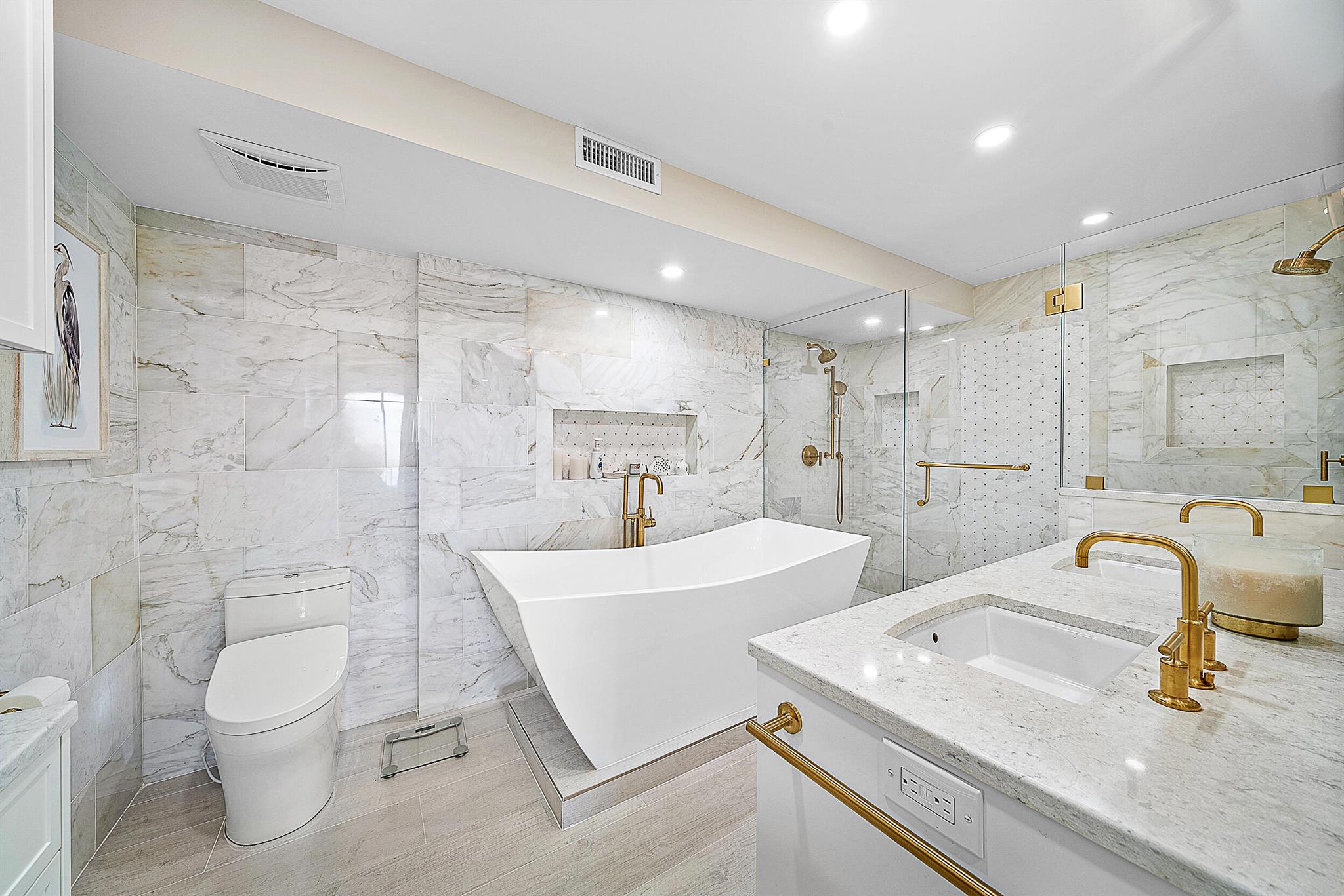 Completely remodeled down to the studs in November 2022, this exquisite 2BR/2BA residence in Marina Tower at Old Port Cove offers luxurious modern living with breathtaking water views from every room. Enjoy seamless indoor-outdoor living with an expansive wrap-around balcony perfect for entertaining or taking in year-round sunsets over the Intracoastal. Every inch of this home has been thoughtfully upgraded -- featuring new hurricane-rated doors & glass, high-end fixtures for plumbing & lighting, electric window shades with remotes in every room, upgraded interior doors with smoked glass & hardware, new washer & dryer (2023), and all lights on dimmers.
