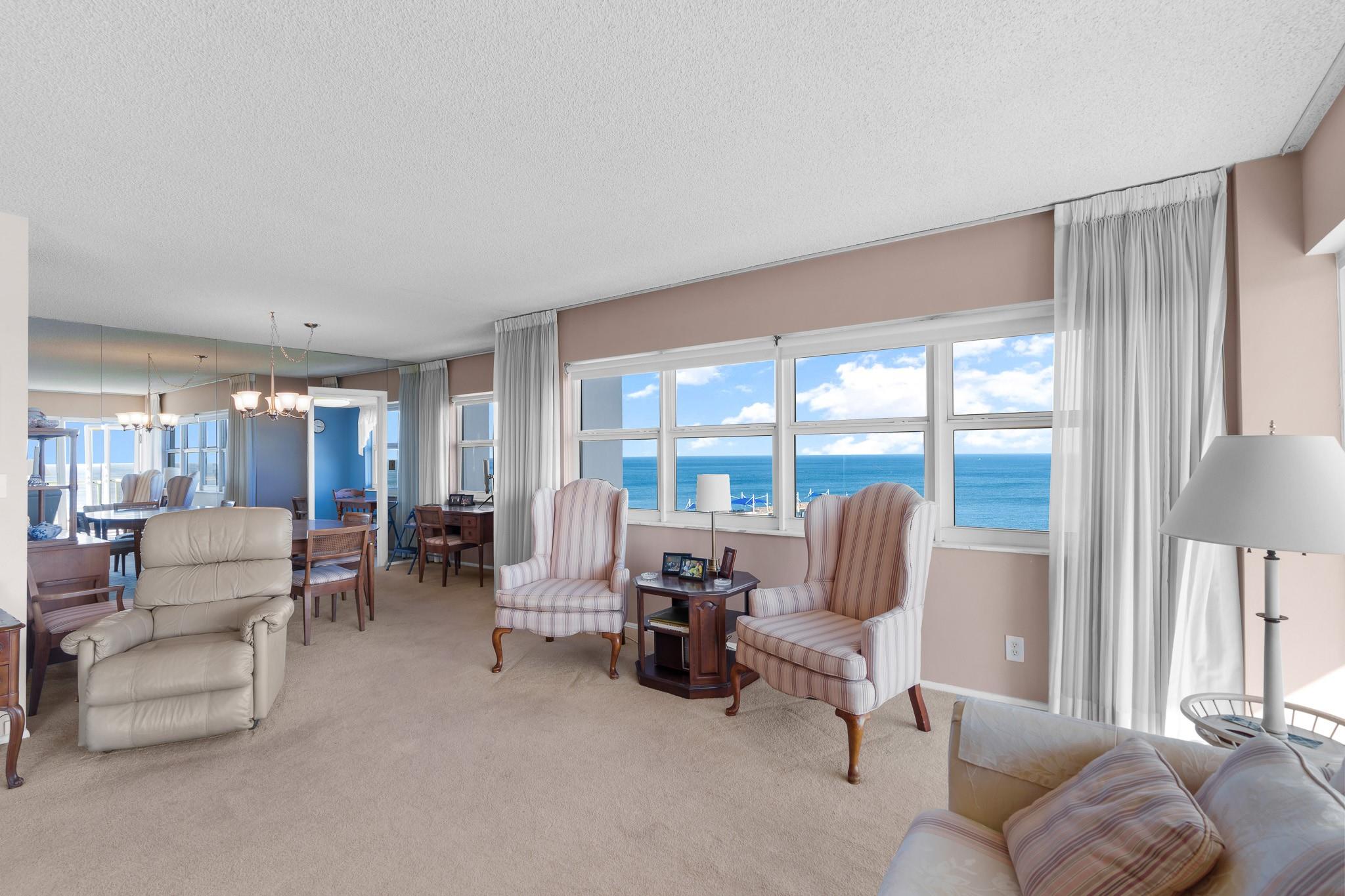 Experience direct amazing ocean views from the SE corner, largest two-bedroom residence in the prestigious Sea Monarch. Floor-to-ceiling impact windows & door frame stunning vistas of the Atlantic, the fishing pier & sparkling lights of downtown Fort Lauderdale—visible from every room! Newer A/C! Opportunity to design your dream coastal retreat! Immaculately maintained with a full-size washer and dryer in-unit! Expansive balcony—perfect for morning coffee at sunrise or evening wine overlooking the nightlife! Spacious primary suite with a massive walk-in closet and room for a cozy sitting area! Abundant storage throughout! One assigned garage parking space! Pet-friendly (one pet up to 25 lbs)! Rental permitted after two years of ownership! This is your chance to own a clean, oversized unit!