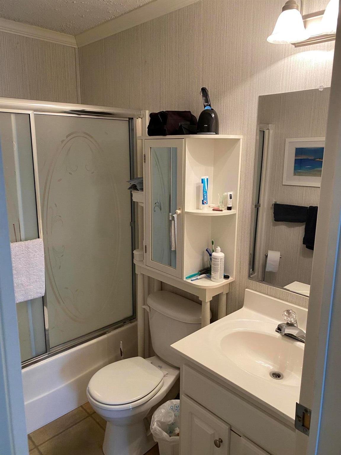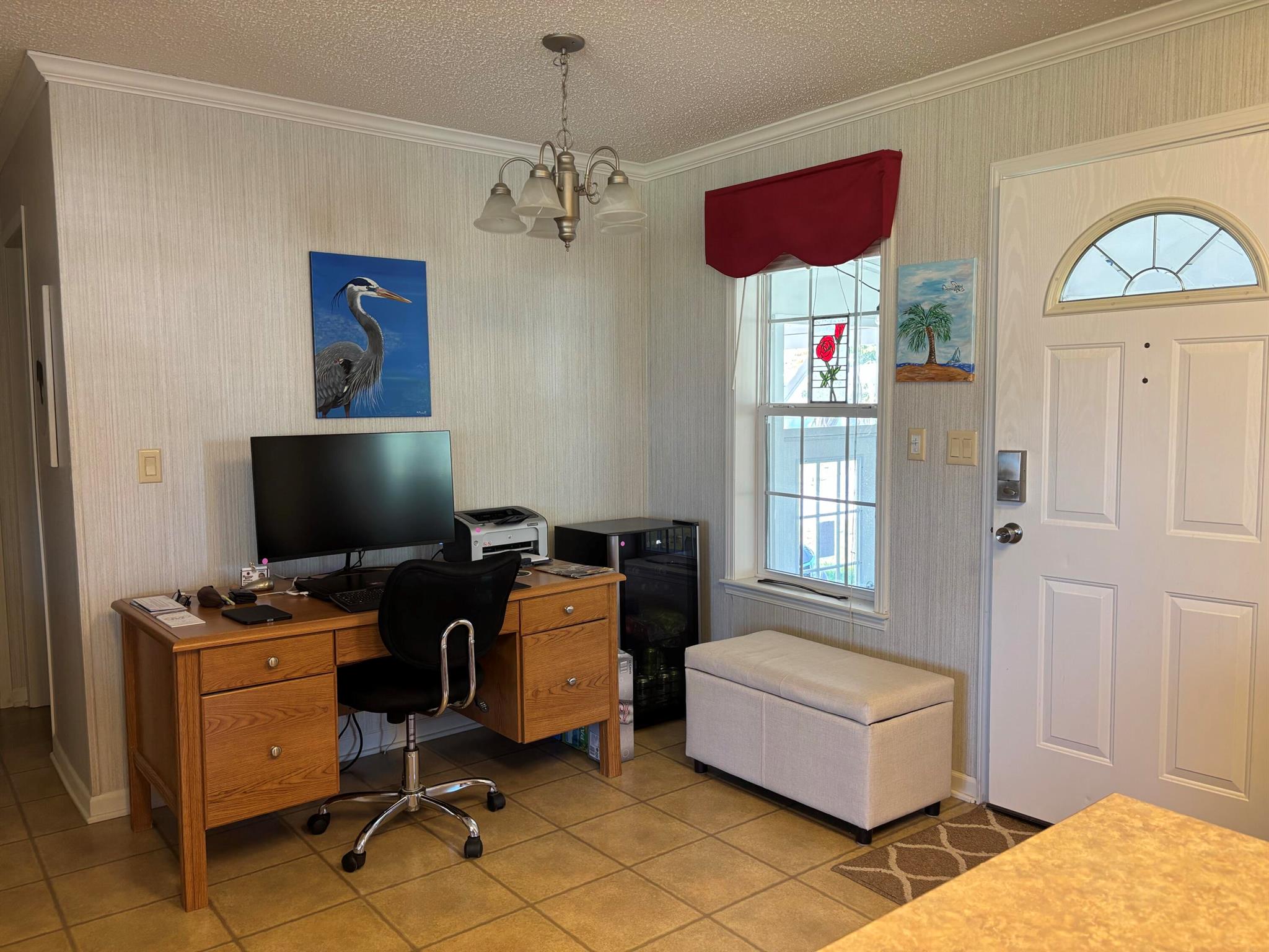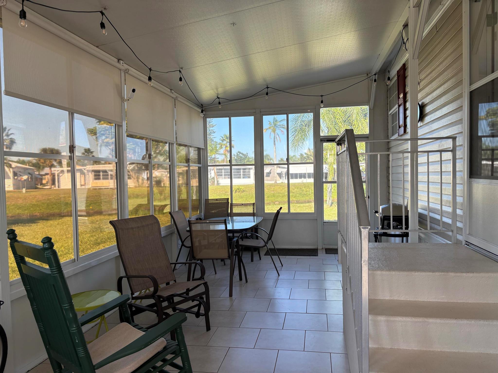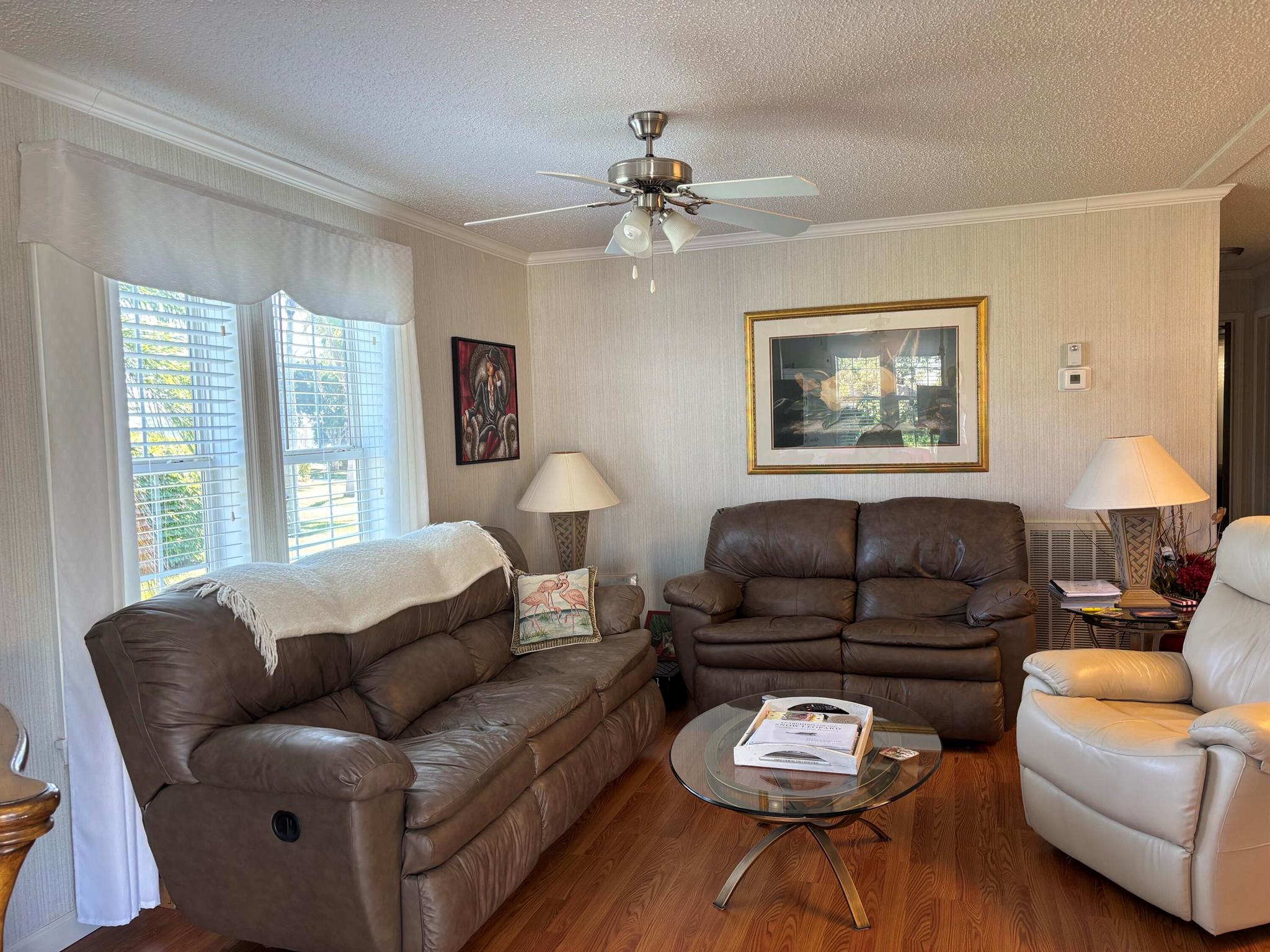 Leased Lot $910.60, This pristine 2bed/2Bath furnished manufactured home with crown molding and new AC 2021. Kitchen is open and includes large island, inside laundry, laminate flooring. Large private screened porch and solar shades. Located in a 55+ community, Spanish Lakes One provides a relaxed yet vibrant lifestyle for active seniors. Enjoy resort-like amenities, including a community clubhouse, free golf, social events, tennis courts, and pool. Park approval is required to purchase. ****Personal items and artwork DO NOT CONVEY.