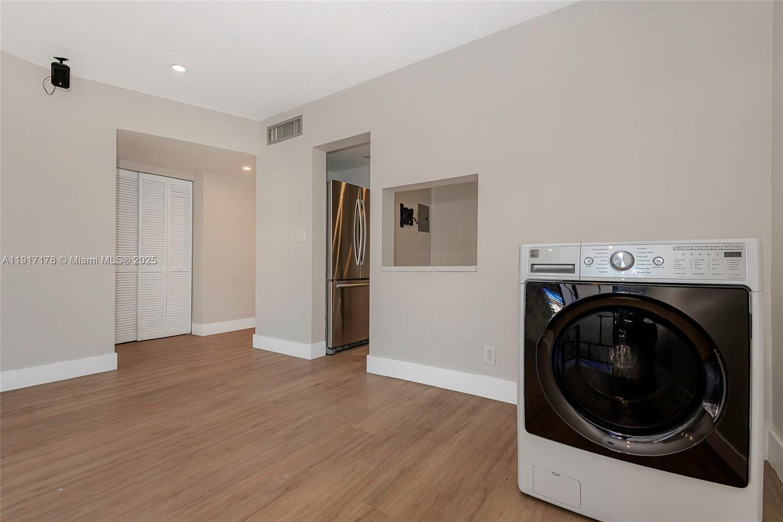 Great for investors or end buyers alike. Cozy corner 1 bedroom 1 bathroom unit on the first floor; unit has a mini dishwasher, washing machine in unit and washer/dryer on the floor as well. Plenty of closet space, 1 assigned parking spot, and a screened balcony. New floors, freshly painted. Very conveniently located walking distance from Super Walmart, Home Depot; very close to restaurants, parks and schools. Very quiet and well maintained development.