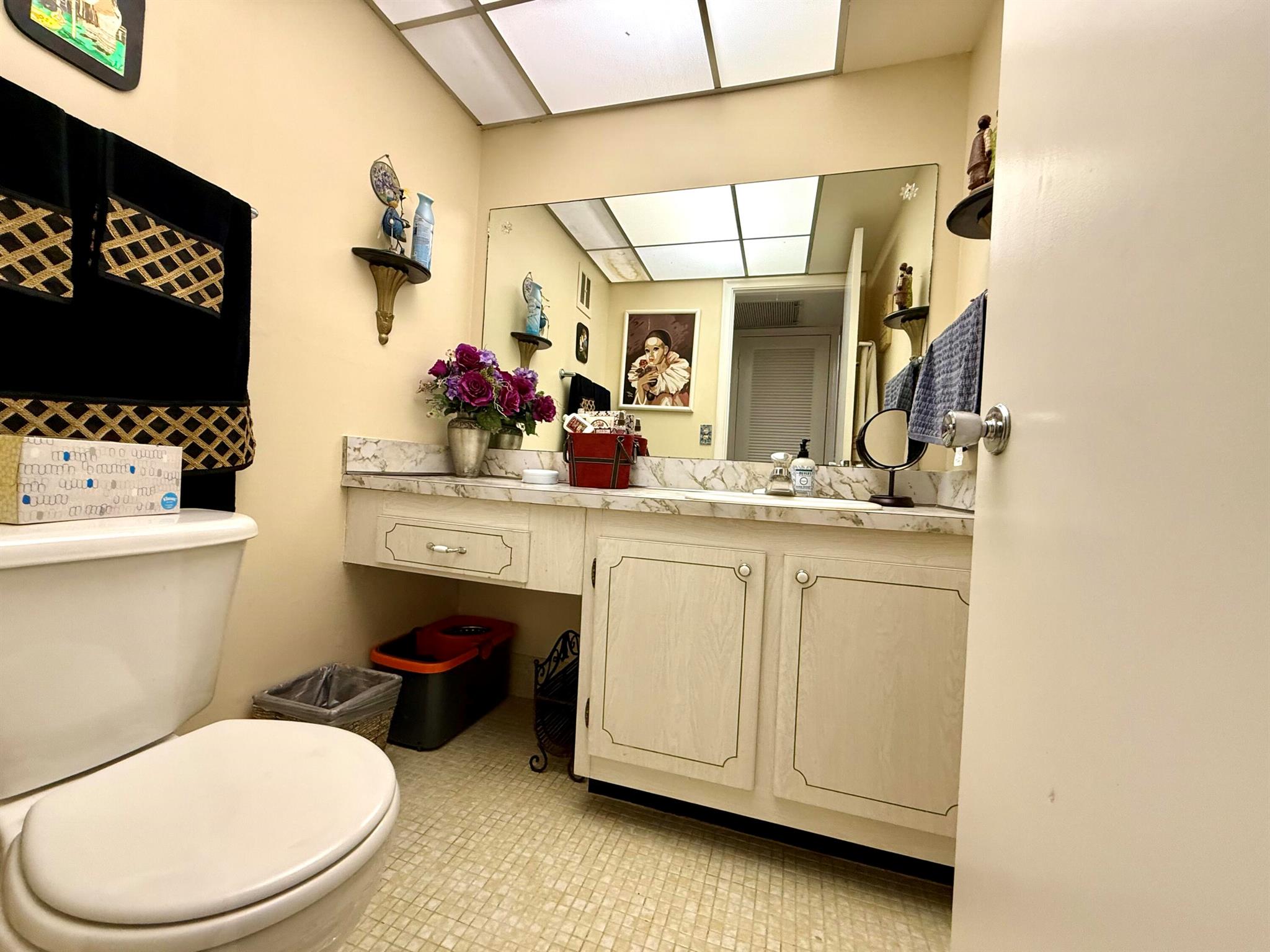 EXTRA LARGE 1 BED 1.5 SECOND FLOOR UNIT IN NEAT & NICELY MAINTAINED AND FINANCIALLY RESPONSIBLE WELLINGTON SECTION. THIS OVERSIZED CONDO CAN BE EASIY CONVERTED INTO A 2 BEDROOM UNIT. ENCLOSED LANAI WHICH OFFERS EXTRA SPACE AND PANORAMIC WATER VIEWS. BUILDING OFFERS AN ELEVATOR.,EXTRA STORAGE, and 2 LAUNDRY ROOMS ON EVERY FLOOR. SPACIOUS MASTER BEDROOM WITH EN-SUITE STEP IN SHOWER BATHROOM AND HUMONG0US WALK IN CLOSET. CONDO IS EQUIPPED WITH BRAND NEW CENTRAL AIR, INSTA HOT AND TILED FLOORING THROUGHOUT. COME & ENJOY RESORT STYLE LIVING IN THIS GATED COMMUNITY FOR ADULTS 55 +. CLUBHOUSE features a theater, indoor pool, card room, community/party room, billiard room ,shuffle board ,tennis , pickleball ,bocce and two outdoor pools. Numerous heated outdoor pools throughout the community