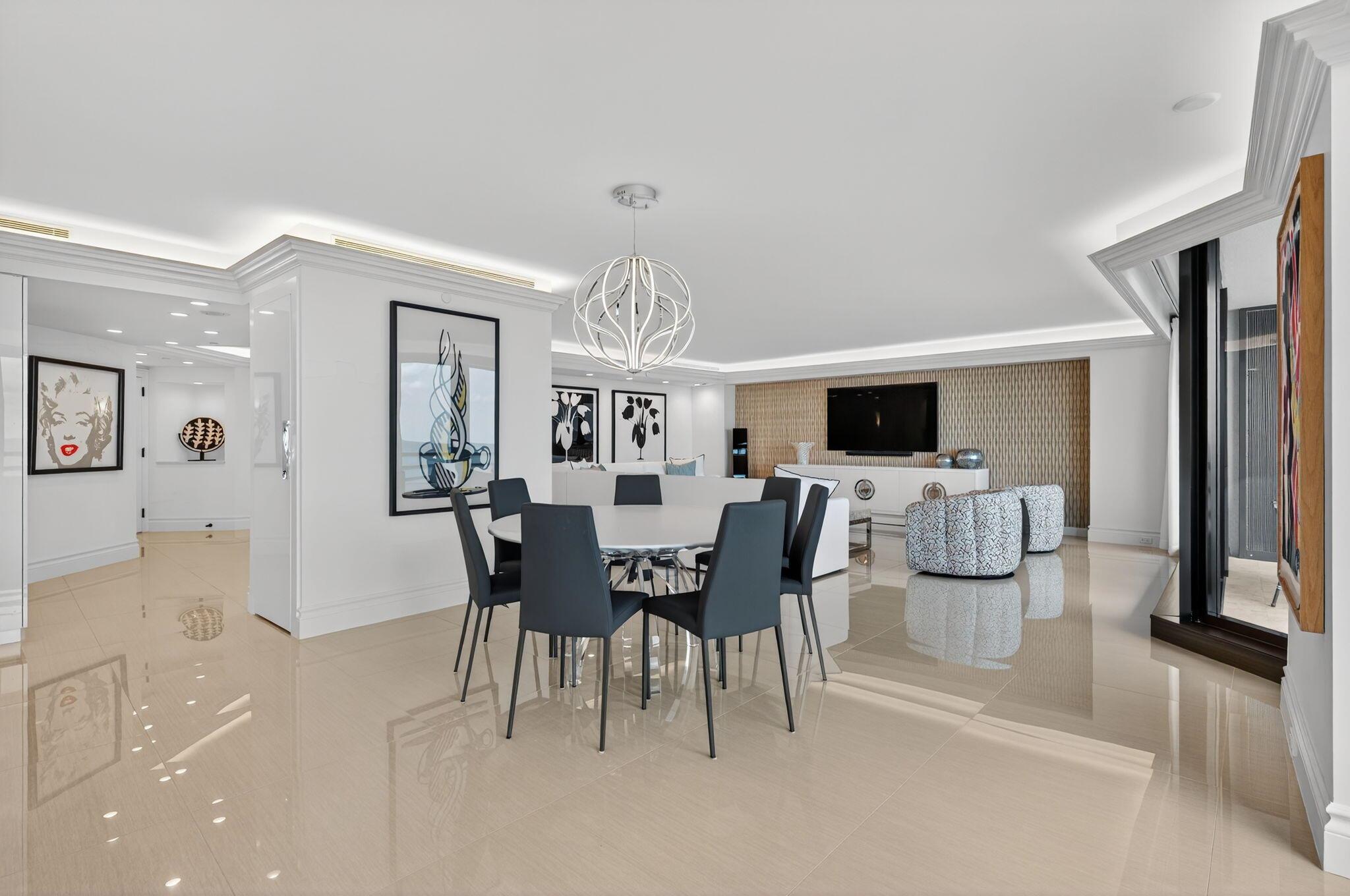 This 3-bedroom, 3-bath masterpiece is the epitome of oceanfront luxury. Upon entering you're welcomed by large format porcelain flooring that leads to the open living spaces w/ forever ocean views. The contemporary kitchen is a chef's dream, equipped w/ high-end Wolf, Miele & KitchenAid appliances; sleek white cabinetry & counters, oversized island & plentiful storage. The pass-through bar includes a fabulous U-Line wine cooler, perfect for seaside entertaining. The oversized primary suite features custom wall trimmings, designer lighting & panoramic city views. The primary bath includes a soaking tub, glass enclosed shower & gorgeous double vanities. 2 guest suites, boast stunning ensuite baths, custom lighting & expansive city vistas.