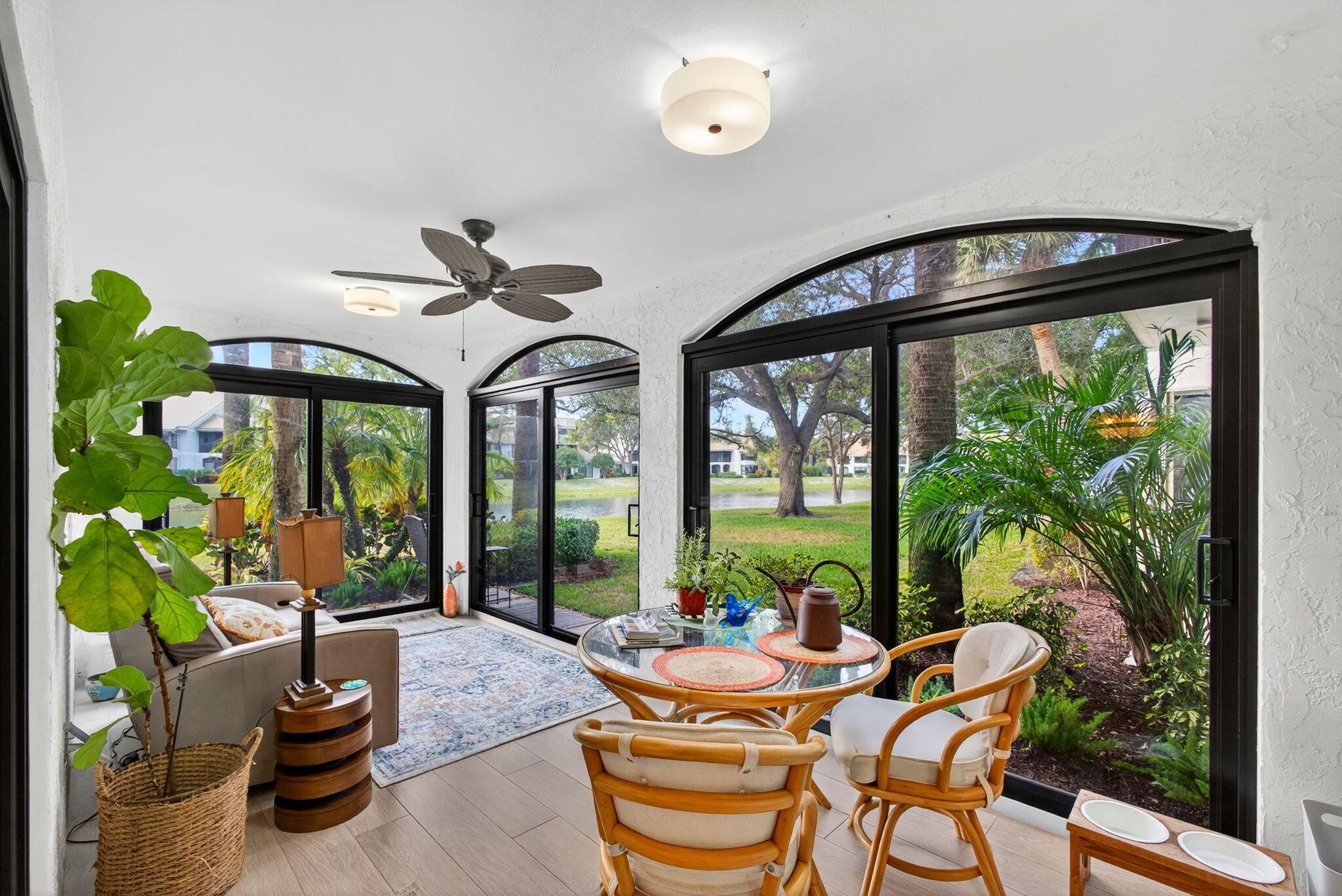 Stunning lakefront condo located in Jonathana(tm)s Landing, Traders Crossing. This highly desirable first-floor residence offers 2 bedrooms and 2 baths with no steps to navigate. Thoughtfully designed and meticulously maintained, this home features a completely renovated kitchen with quartzite countertops, an induction cooktop, built-in drawer microwave beneath the countertop, full-extension soft-close cabinetry, and dovetail wood cabinets, all complemented by wide, breathtaking lake views.Enjoy numerous upgrades including new light fixtures, new ceiling fans, and Hunter Douglas blinds. The living spaces are enhanced with wood-look tile flooring, creating a warm, modern feel. The patio has been fully enclosed with brand-new impact-glass sliding doors, extending the l