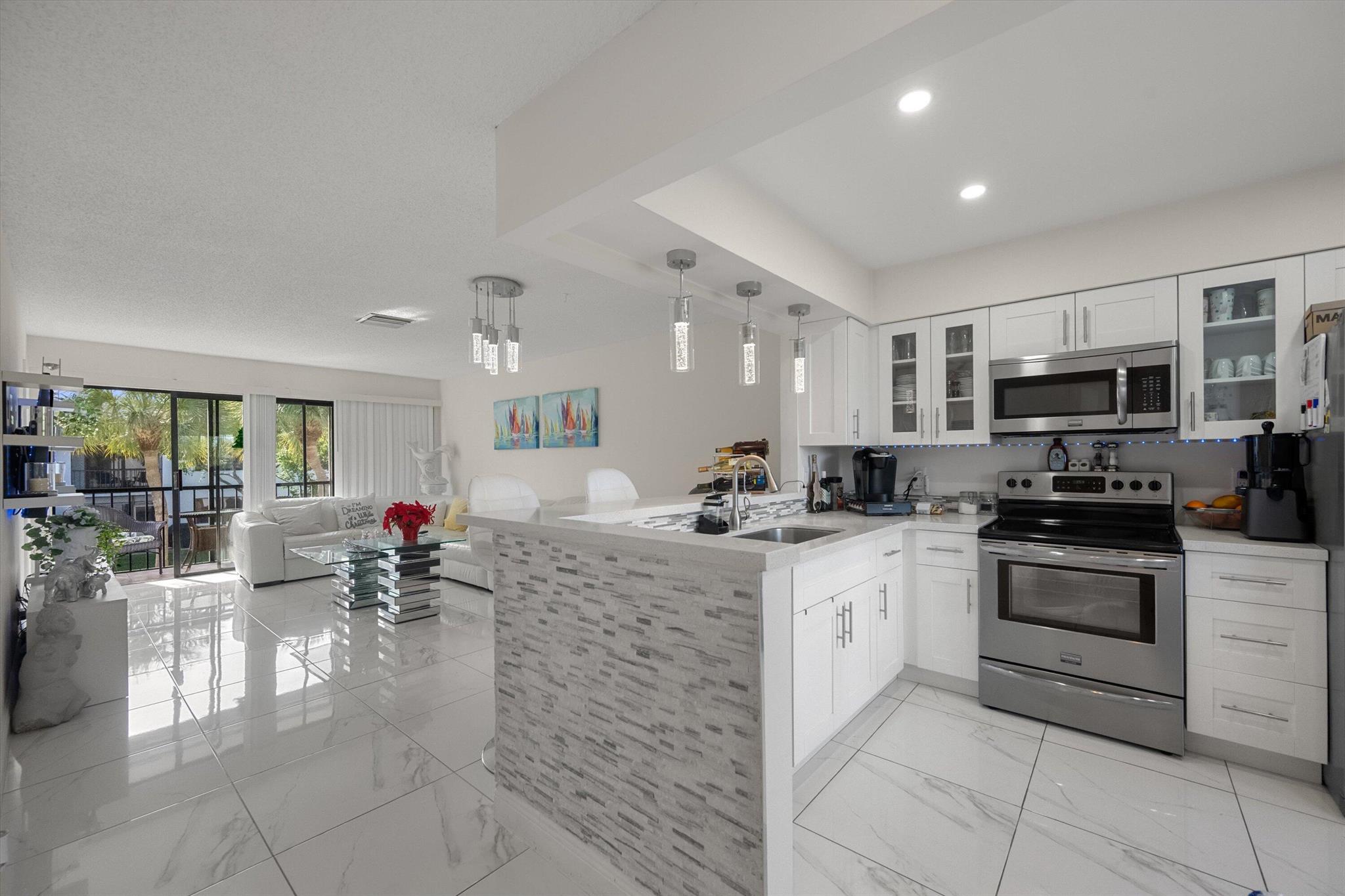 Fully updated 2/2 condo in an all ages community. This home comes fully furnished just move in with your suitcase and toothbrush. Brand new kitchen with Quartz countertops, beautiful backsplash and stainless steel appliances. Large white and grey tile throughout. AC replaced in 2024, hot water heater replaced in 2023. Roof 2023. New hi-hat lights put in both bedrooms for extra light. Primary bath and guest bath have been remodeled. Split bedroom set up. Open concept floor plan. Relax on your balcony and look out to a garden. Washer and dryer in unit. 2 parking spots assigned plus plenty of guest parking. Natuzzi leather couch with recliners, tv stand with built in electric fireplace. Close to 95, beaches, shopping and nightlife. Home is in Delray but zoned for Boca School district.