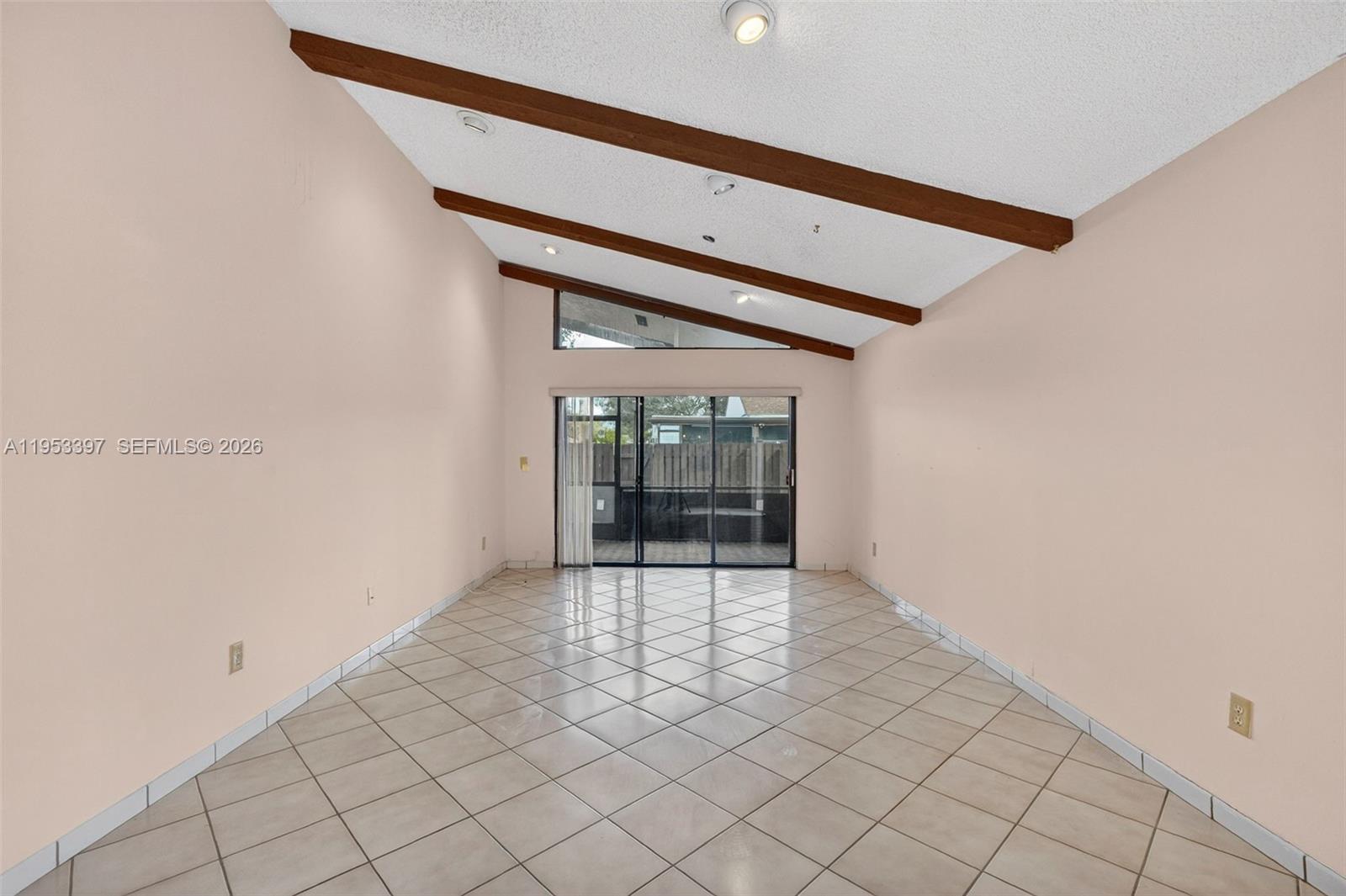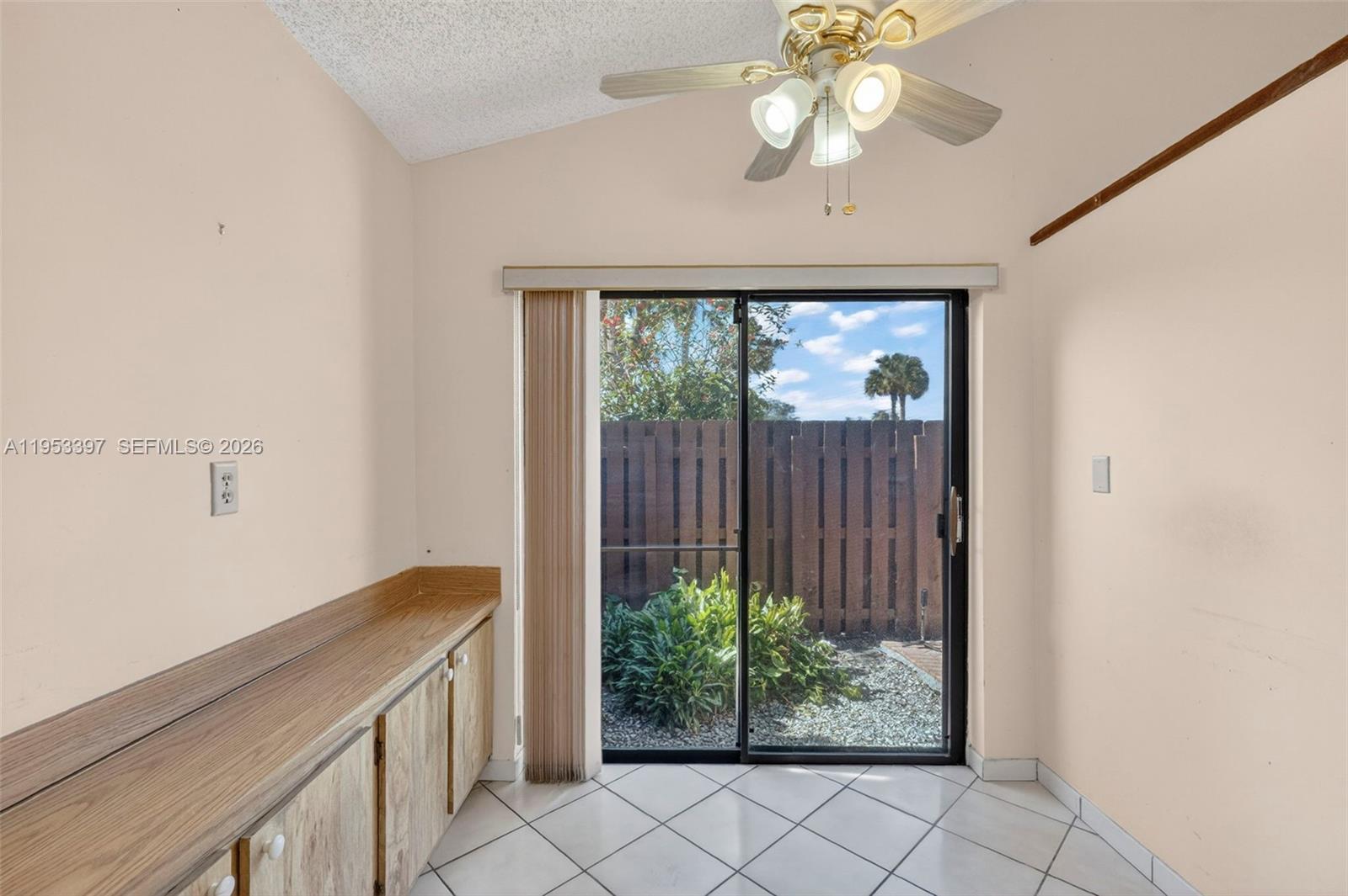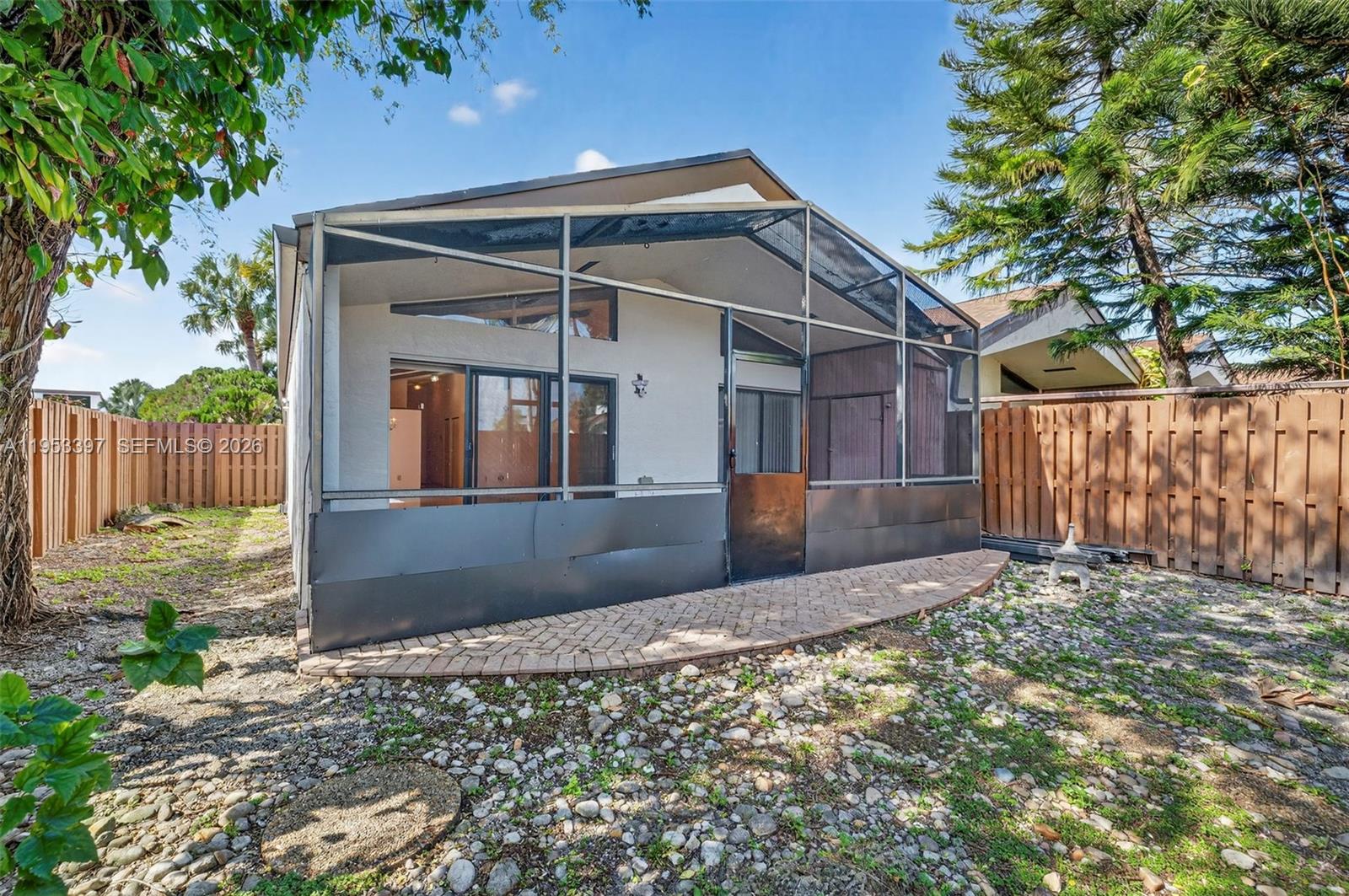 Just under 1,200 square feet of living space, this 2-bedroom, 2-bath villa with vaulted ceilings is located in the heart of Plantation within Omega Villas. The expansive great room offers an ideal layout for entertaining, complemented by an eat-in kitchen with ample countertop and cabinet space. The primary suite features a large walk-in closet plus an additional secondary closet, while the oversized second bedroom feels like a second primary suite, filled with natural light and well suited for a home office or guest space. Enjoy a huge screened-in covered patio with private backyard space. Recently paid assessments include exterior improvements such as reinforced and re-stuccoed windows, a full exterior repaint, and completed fencing throughout. Roof completely redone in 2025 part of 49 yr recertification. Parking is convenient with one assigned owner space and one guest space directly in front of the unit, along with additional guest parking available. An excellent opportunity to personalize and make it your own.