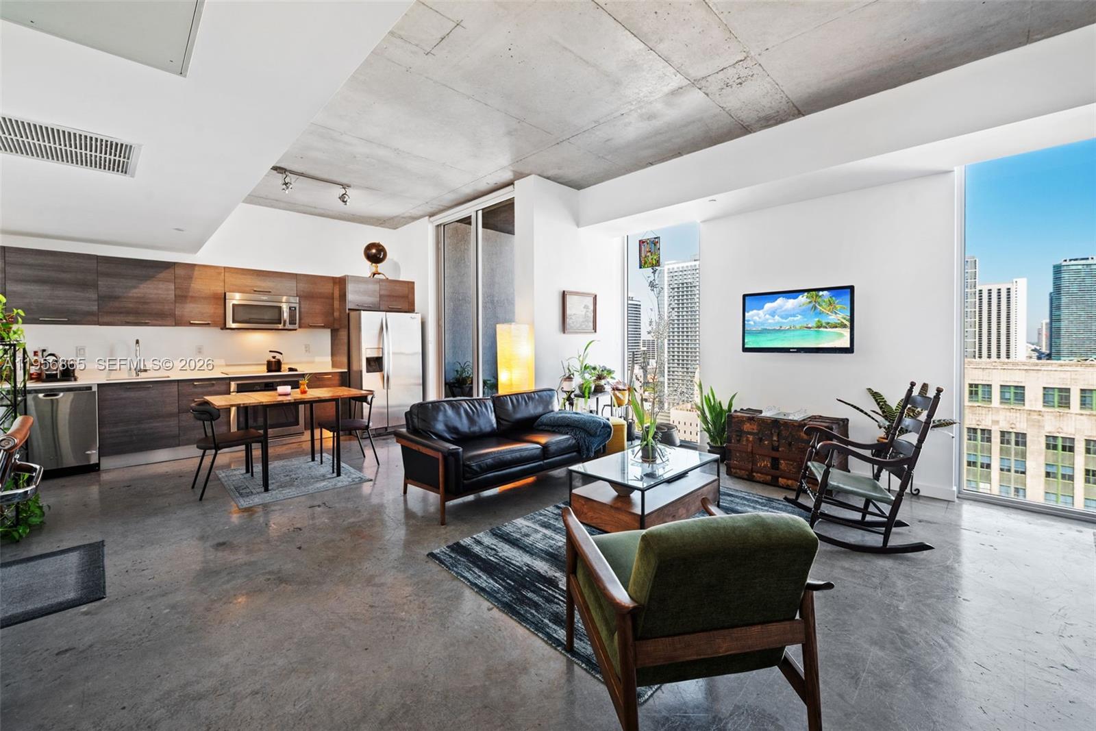 Ideally situated in the heart of Downtown Miami, Centro offers a true walk-to-everything lifestyle—just blocks from the waterfront and steps from cafés, top restaurants, museums, Whole Foods and a vibrant mix of historic architectural icons and newly developed pedestrian-only streets . This beautifully maintained residence represents one of the best values in Downtown Miami. The spacious open-concept layout features a combined kitchen and dining area, comfortable living space and a separate bedroom area-all designed to maximize flow and functionality. 10 foot floor-to-ceiling picture windows accentuate the skyline and flood the home with natural light throughout the day. A private balcony off the kitchen is perfect for morning coffee while enjoying gorgeous northeast-facing views showcasing the Downtown skyline and Biscayne Bay. Interior features include polished concrete flooring, ample closet space, a full bathroom, in-unit washer and dryer, A/C and thoughtful modern finishes throughout. Building amenities include a rooftop pool with unparalleled 360-degree views of Miami, two levels of resident club rooms, a fully equipped fitness center, sauna, steam, locker rooms, on-site management, front desk and secure elevators. Off-site parking available for $155/Month.
