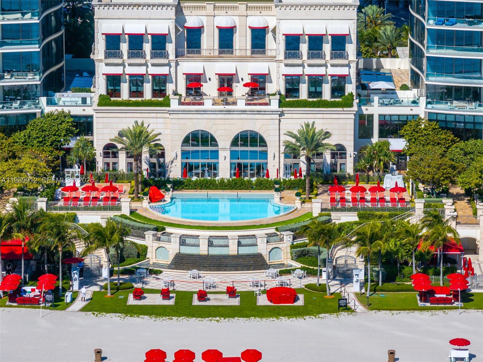 Discover the most coveted residence within "The World's Finest Residences", The Estates at Acqualina. Perched on the 45th floor, this rare south-corner trophy home is defined by soaring 12-foot vaulted ceilings—a unique architectural feature that amplifies its grand proportions. The views are boundless, stretching across the turquoise Atlantic to the glittering Miami skyline. Designed for both intimate family life and large-scale entertaining, the expansive layout includes a majestic great room and a separate family room. The residence offers four bedrooms with the flexibility for a fifth. The chef's kitchen is a masterpiece, anchored by dual La Cornue gas ranges and a full suite of Sub-Zero and Miele appliances. Throughout the home, the finishes are peerless: rare white onyx wraps every bathroom, complemented by Dornbracht fixtures and Toto washlets. Over 1,100 square feet of private terraces complete with an oceanfront sauna. Full smart-home automation for lighting, climate, audio-visual, and window treatments. Enjoy a lifestyle of unparalleled service. Five-star amenities include a private Rolls Royce fleet, five signature restaurants—including Estiatorio Avra, Il Mulino, and KeUh—and three distinct pools featuring a FlowRider and waterslide. From the ice-skating rink and bowling alleys to the F1 and golf simulators, every desire is anticipated by a dedicated concierge team.