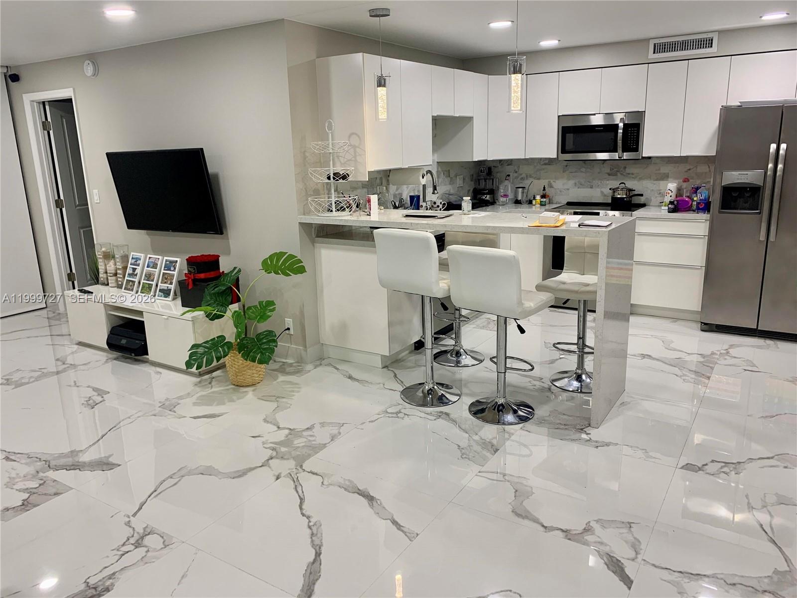 Designer remodeled 2 bedroom, 2 bath condo with luxurious custom finishes, on the charming Three Islands! Ground floor. Low HOA: $707/mo! Deeded parking spot (own it/can rent out). 2 private tennis courts (with night lights) that overlook yachts going by on the intracoastal! Pool, gym, yoga room, billiards room, shuffleboard courts! 24/7 security. Central A/C, new water heater (April 2026). Luxurious oversized 36" x 36" matching tile throughout, open floorplan kitchen with "waterfall" peninsula, matching stainless steel appliances, oversized fridge with built in water filter, pull out faucet, remote controlled roller shades on windows, huge bath tub, stylish "floating" bathroom vanities with designer faucets, LED lights, soft close cabinets (in kitchen, bathrooms), soft close toilets.