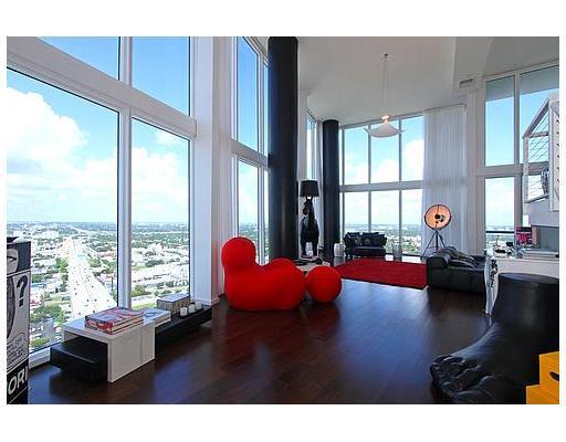 Breathtaking views of Miami Bay and Miami Skyline, from every room in this amazing two story corner penthouse that features floor to ceiling high impact glass walls (up to 22 feet in height); 3/3.5. Former famous clothing designer's unit. Custom furniture . Comes completely furnished and finished.