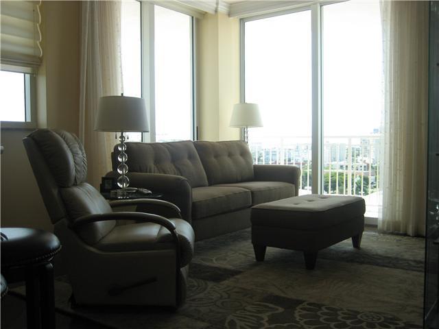 THIS LARGE CORNER TWO BEDROOM TWO BATH UNIT AT THE DUO HAS BEEN BEAUTIFULLY UPGRADED TO INCLUDE HARDWOOD FLOORS THROUGHOUT, BUILT-IN CLOSETS, CUSTOM DRAPES, ELECTRIC SHADES, KITCHEN BACKSPLASH, CROWN MOLDINGS, FANS, CUSTOM MIRROS AND PORCELAIN TILES IN TH E TERRACE. SEE THE SUNSET FROM YOUR BALCONY, WALK TO RESTAURANTS, PHARMACY AND SUPERMARKETS OR ENJOY ALL THE AMENITIES THAT DUO HAS TO OFFER. MAINTENAINCE INCLUDES: CABLE, INTERNET, 2 PARKING SPACES AND CONTRACT WITH TOTAL APPLIANCES.