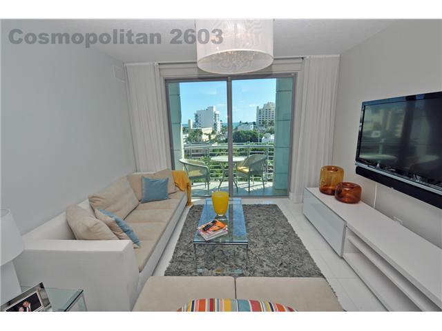 Totally upgraded designer unit at The Cosmopolitan. Fully furnished, this turn-key unit features ocean views, & is completely upgraded w/ top-of-the-line finishes, such as 18x18 white quartz floors throughout, A/V surround system, recessed lighting, new bathrooms, frosted glass doors, window treatments, custom closets & more. The Cosmopolitan is a full service building, offering pool, spa, gym, valet, besides the convenient location on South of Fifth, 2 blocks from the ocean and steps from restaurants.