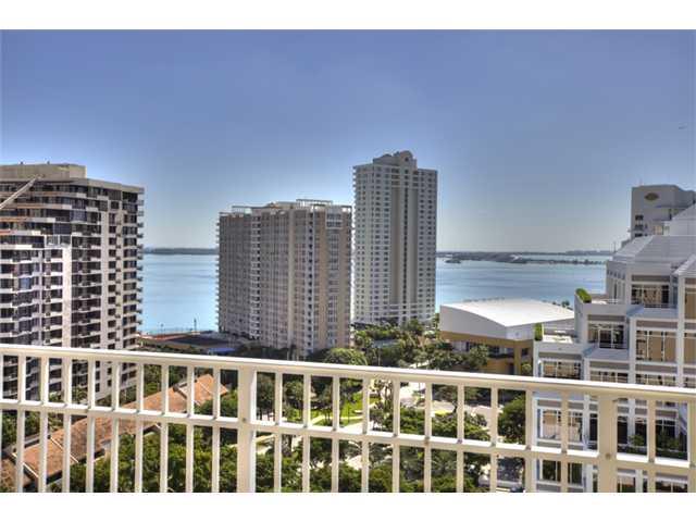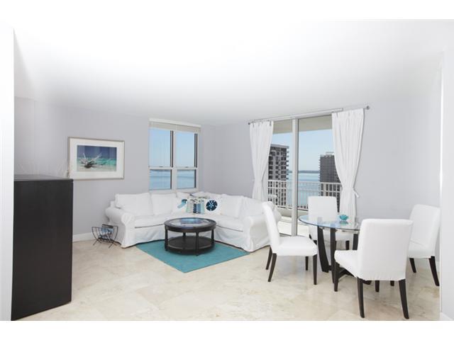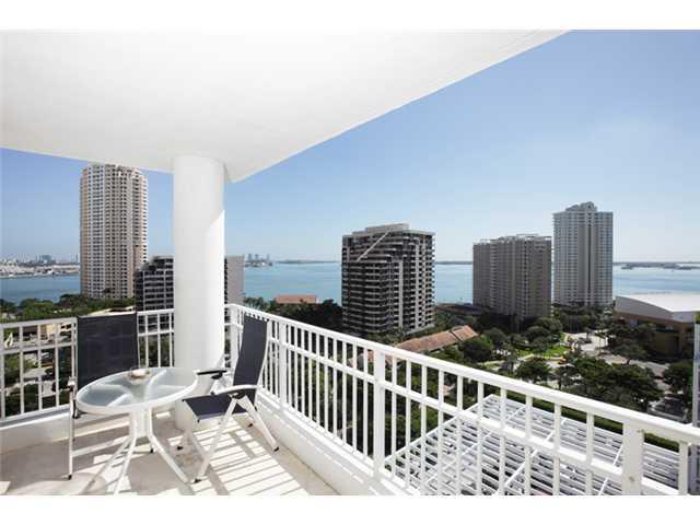 Direct ocean & bay views from this large sunlit SE corner 2BD / 2.5BA on Brickell Key. Beautiful vistas & beach-villa-style furnishings. Granite kitchen & bath counters, newly polished marble floors. Furniture negotiable with purchase. 1 assigned & 2 comp limentary visitor valet spaces daily & 105 cu. ft. storage unit. Enjoy bay views from heated pool, 2-story gym, squash & racquetball courts, billiard/party room, movie theater, biz center & 24 hr desk. Pets up to 50 lbs may enjoy roof top pet park.