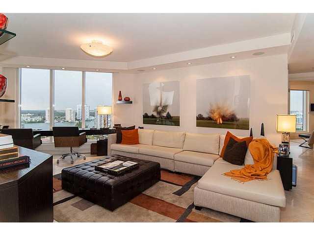 Lovely furnished corner residence in luxurious Bellamare building. Breathtaking views of the Ocean, Intracoastal and the City. This 3 bedroom 4.5 baths + Den. Features marble floors thru-out, open kitchen, fine finishes, floor to ceiling windows in every room and private elevator access. Amenities include Pool, Sauna, Gym, Library, Business Center and more. Best value in 08 line!