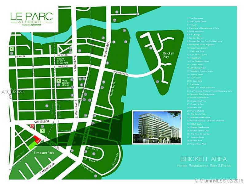 Le Parc at Brickell offers 128 luxury "move-in ready" residences including studios, 1, 2 and 3 bedroom layouts as well as 9 expansive two-story townhome units, with floor plans ranging from approximately 554 to 2,198 square feet in size. Sprawling park views and panoramic city views of Downtown Miami/Brickell skyline looking out towards Biscayne Bay. Residents also have the additional option to purchase custom-designed Turn-Key Furniture. Very luminous with 13' floor to ceiling heights.