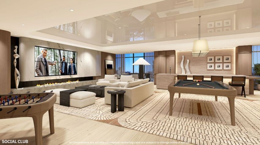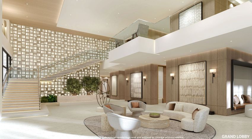 From the impressive double-height lobby, adorned with elegant furnishings and antique sculptures, residents can access an open deck featuring a summer kitchen, a heated pool, and private cabanas.